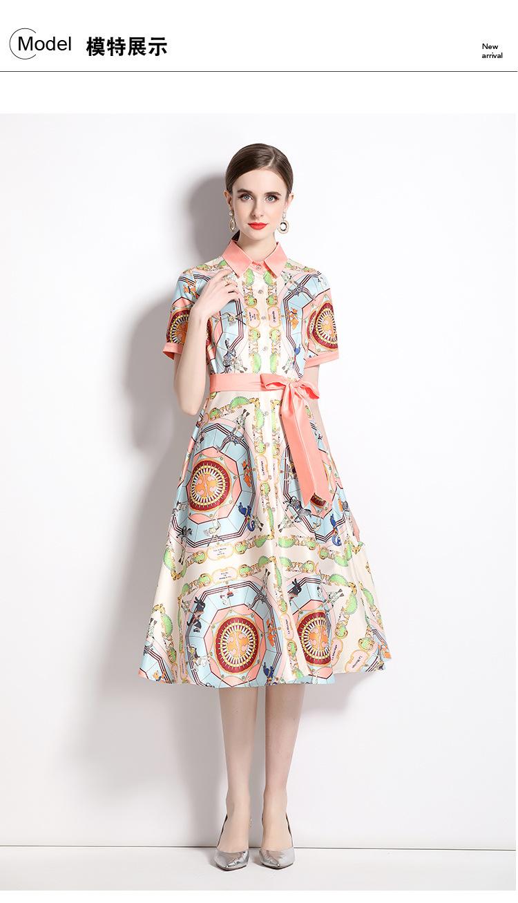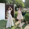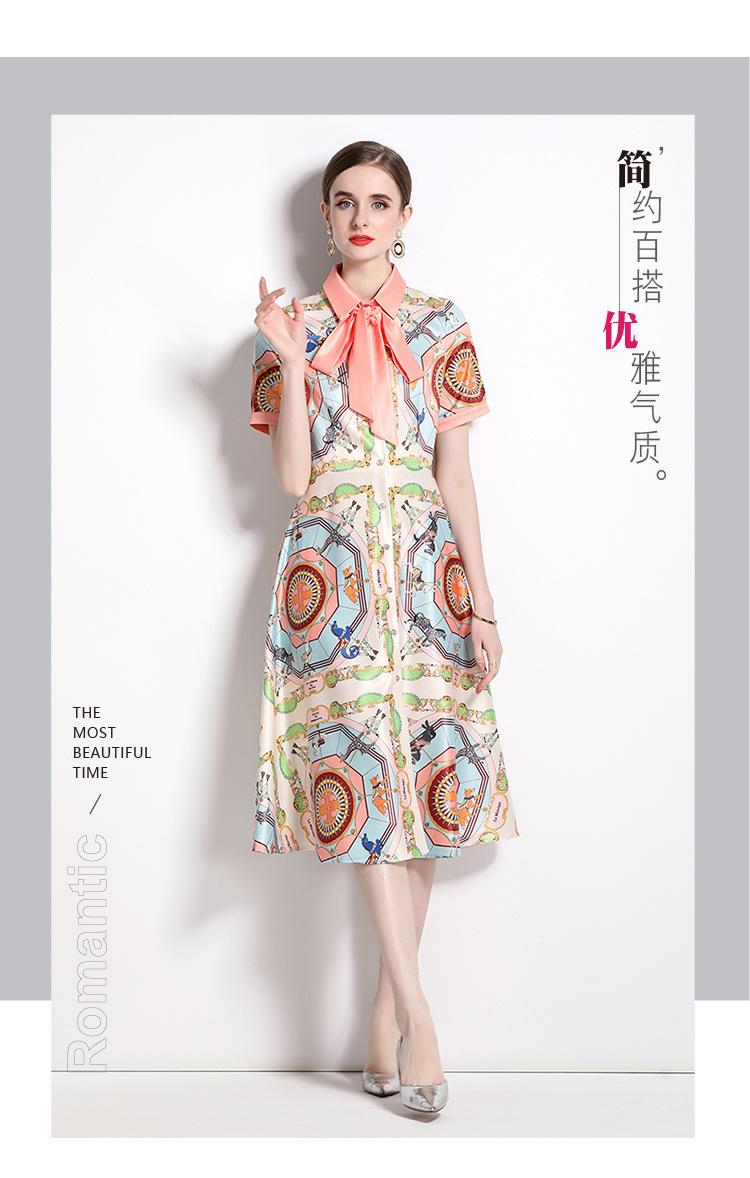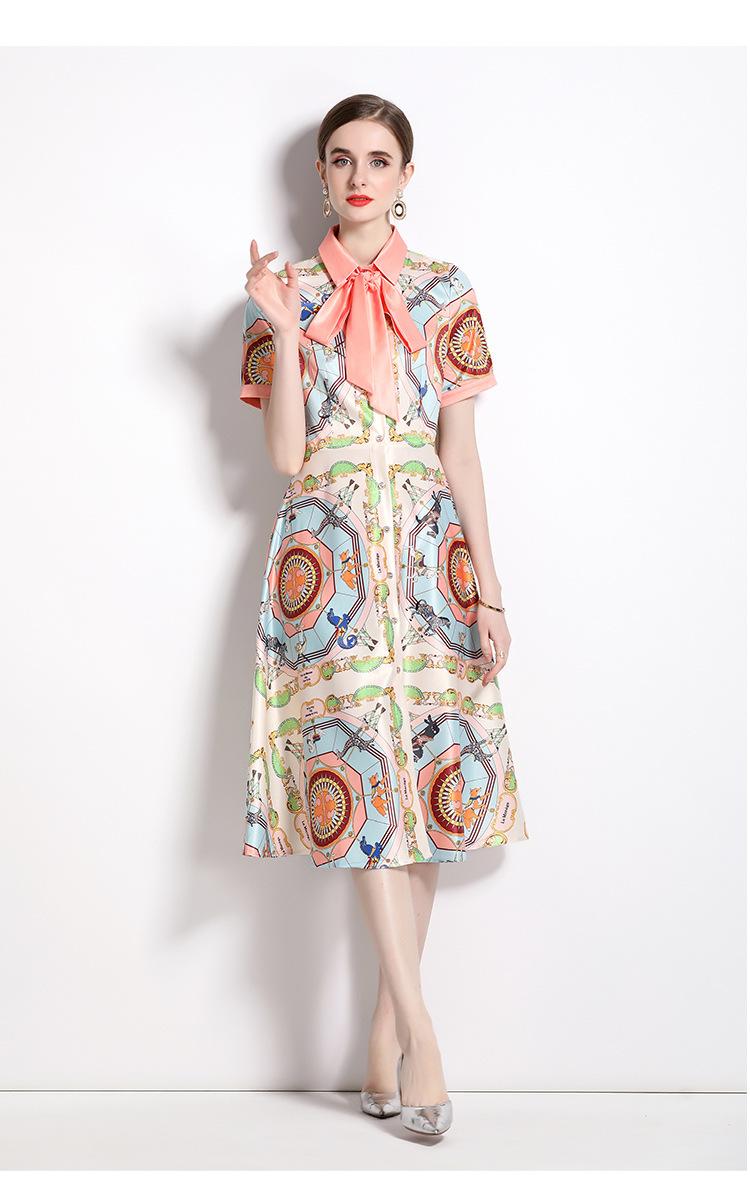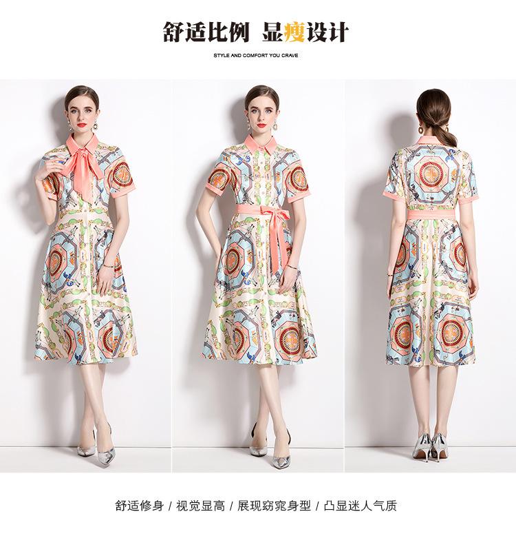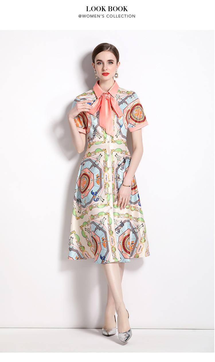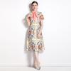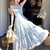 Vestido con cuello de cordones 2023 Estampado Manga corta Francés Manga corta De hadas Joven Cintura adelgazante Falda midi