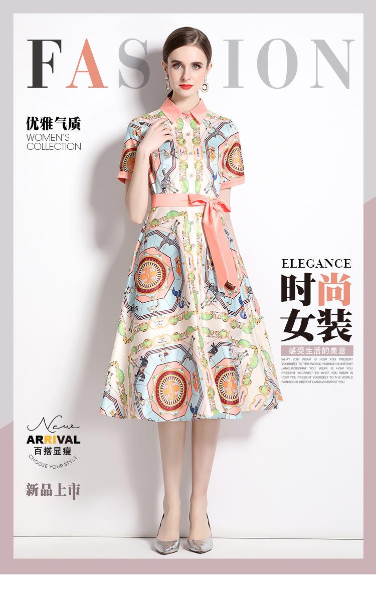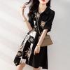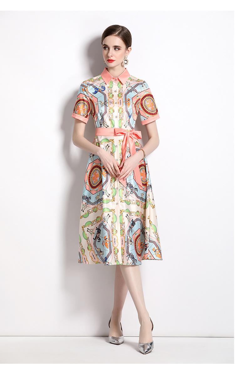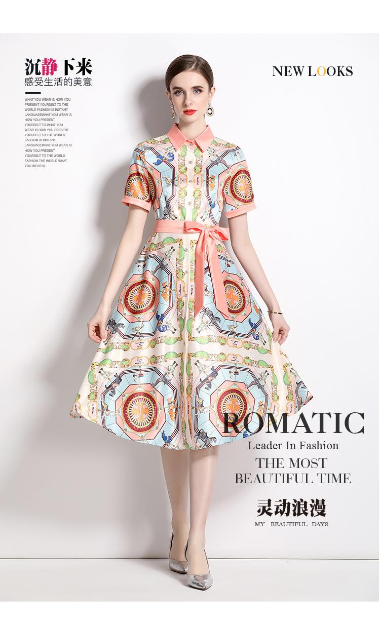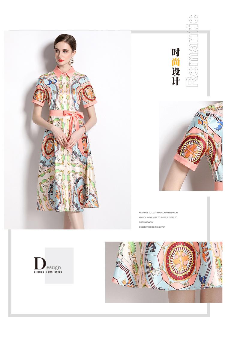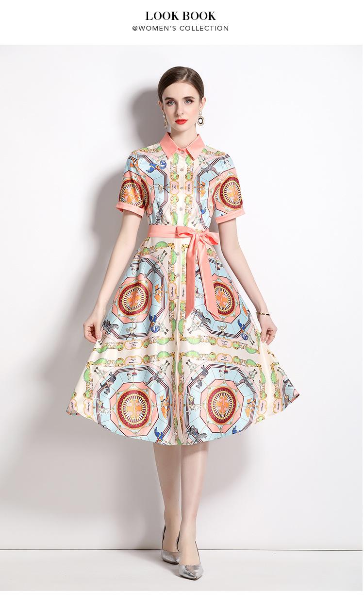 Vestido con cuello de cordones 2023 Estampado Manga corta Francés Manga corta De hadas Joven Cintura adelgazante Falda midi