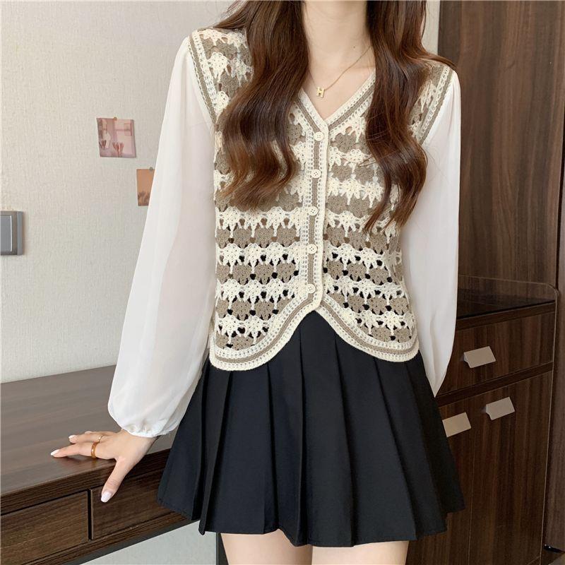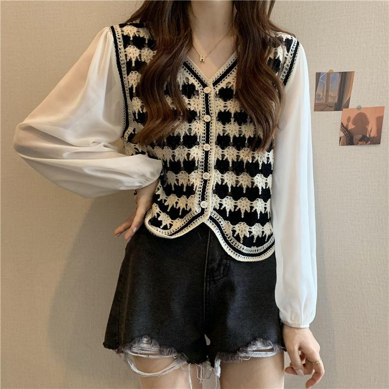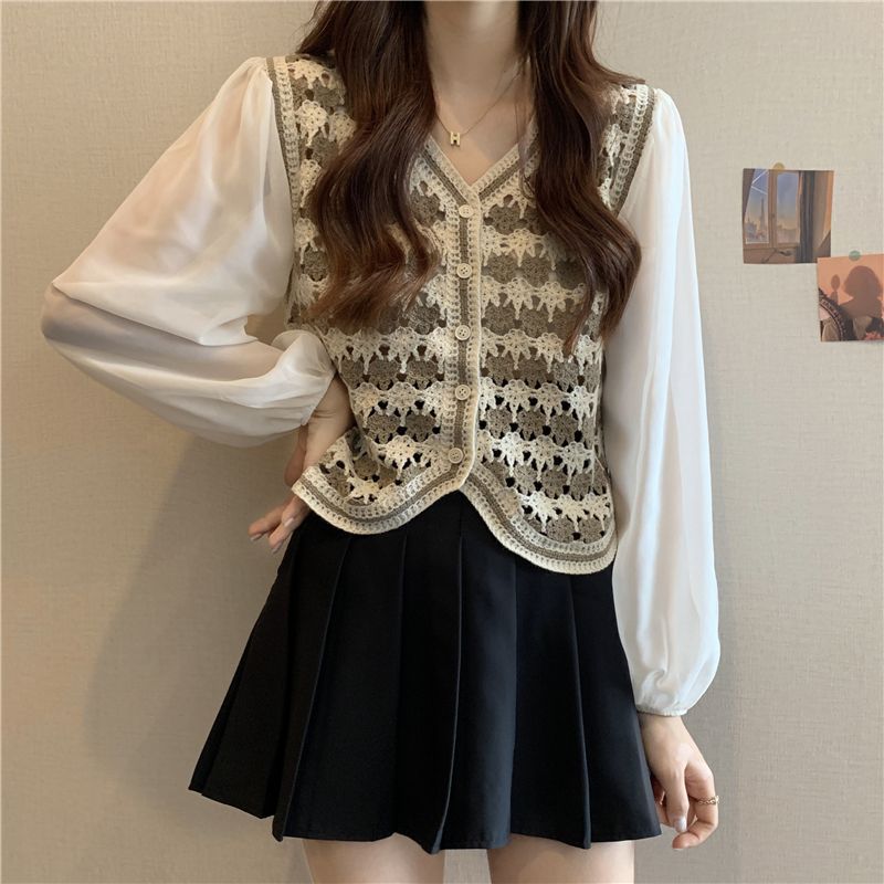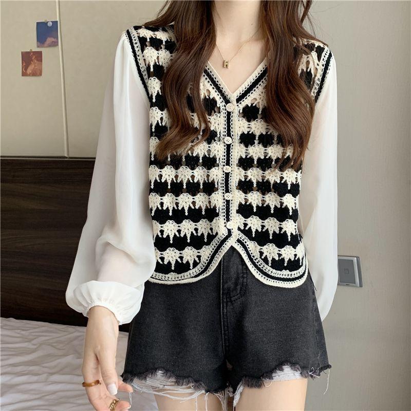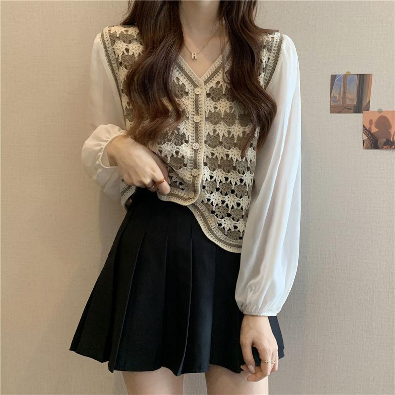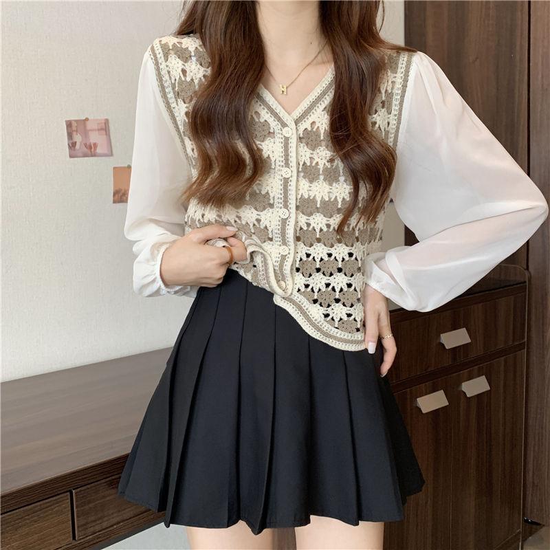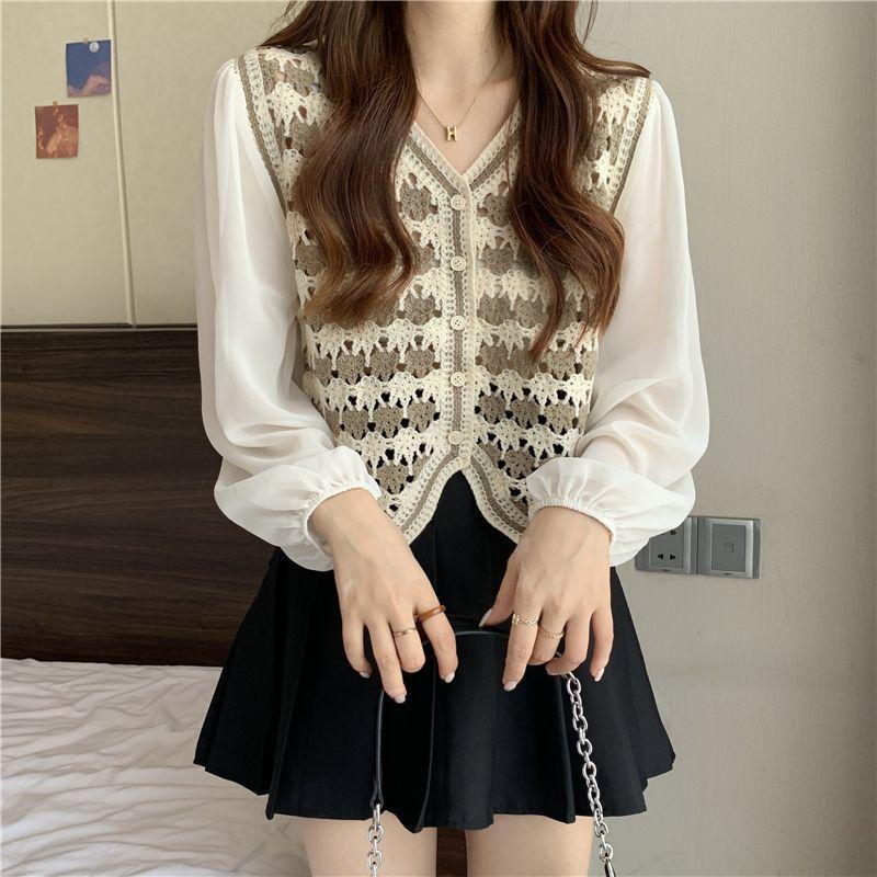 Camisa Hueca de Manga Larga 2024 Top de Mujer Camisa Corta Chifón Empalmado Pequeño Flor Francés Retro Primavera y Otoño