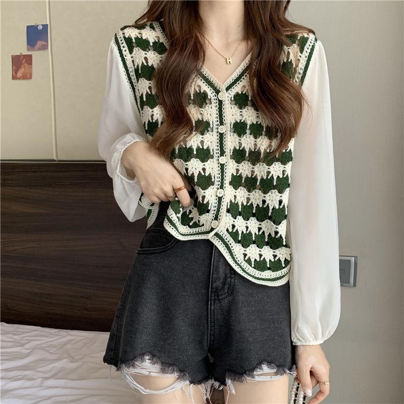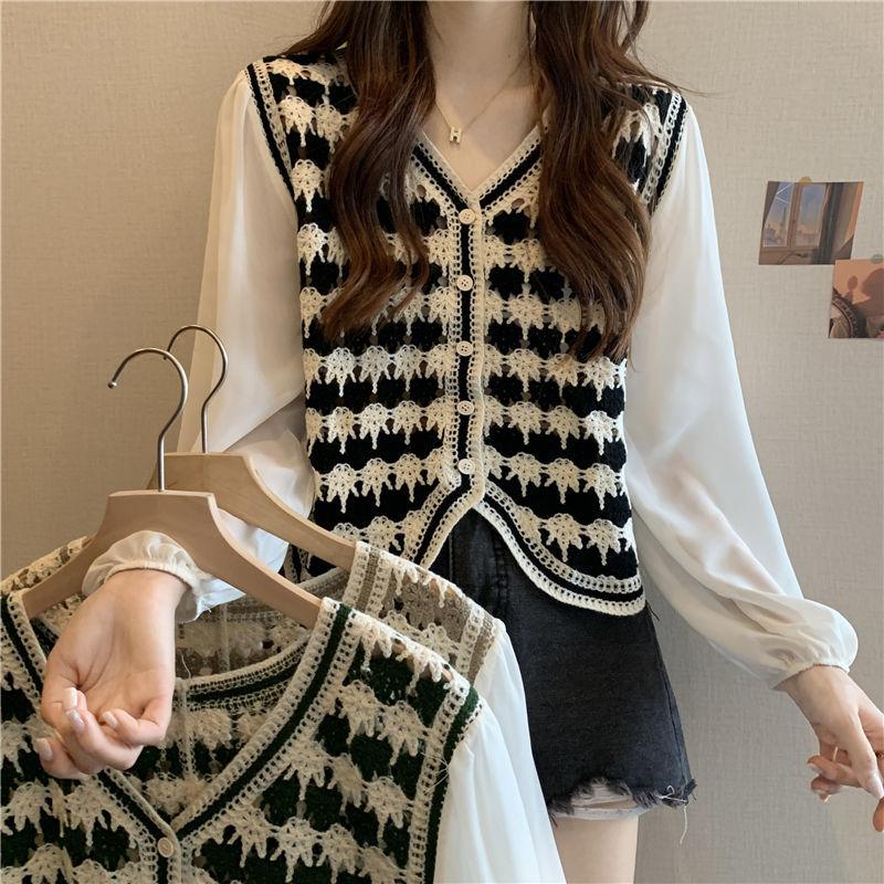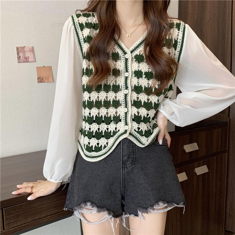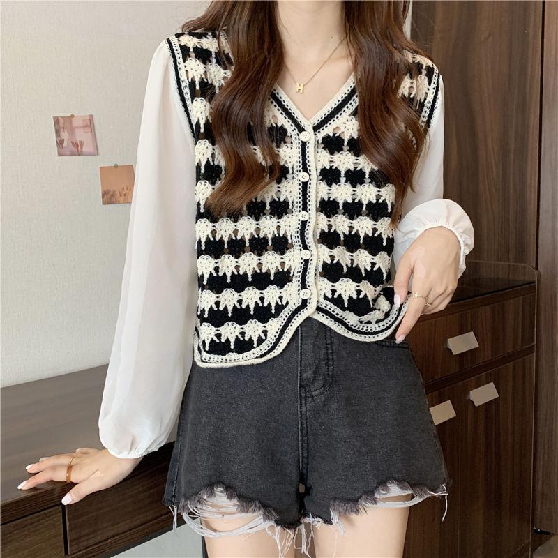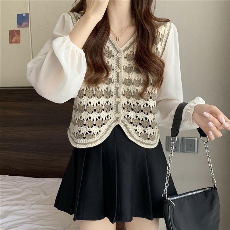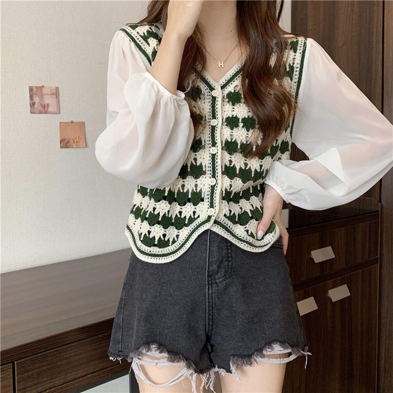 Camisa Hueca de Manga Larga 2024 Top de Mujer Camisa Corta Chifón Empalmado Pequeño Flor Francés Retro Primavera y Otoño