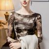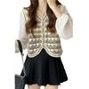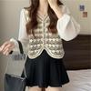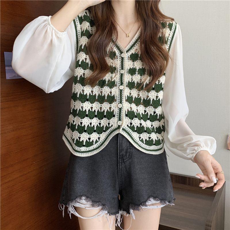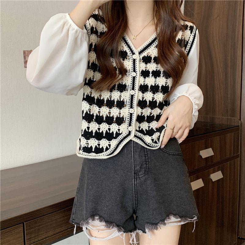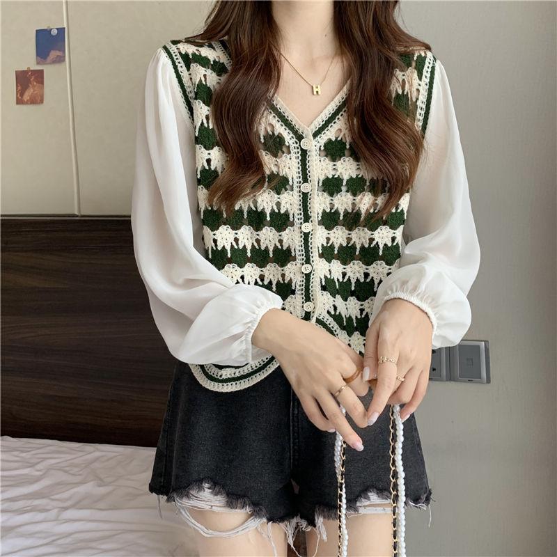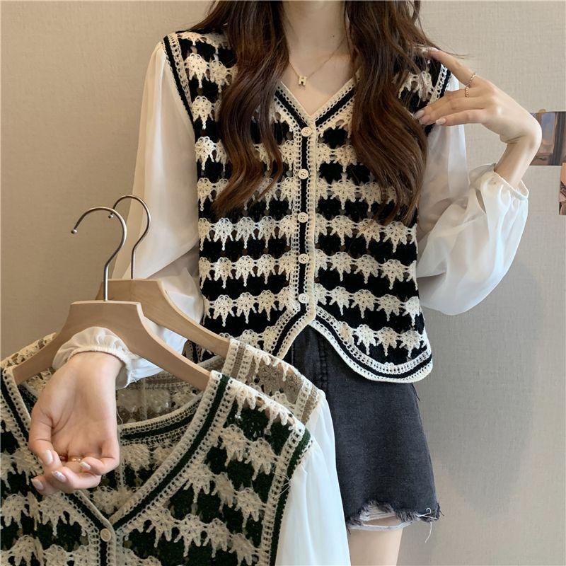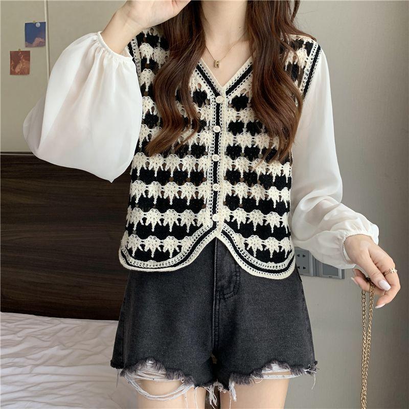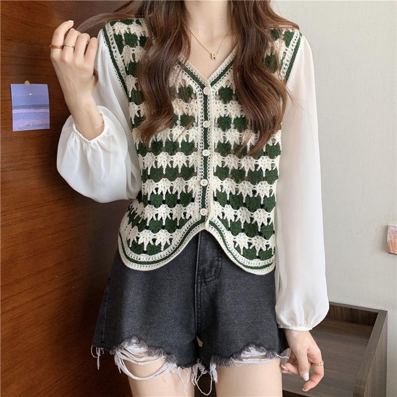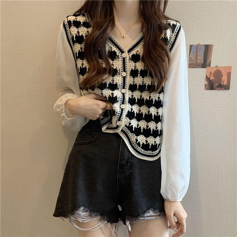 Camisa Hueca de Manga Larga 2024 Top de Mujer Camisa Corta Chifón Empalmado Pequeño Flor Francés Retro Primavera y Otoño