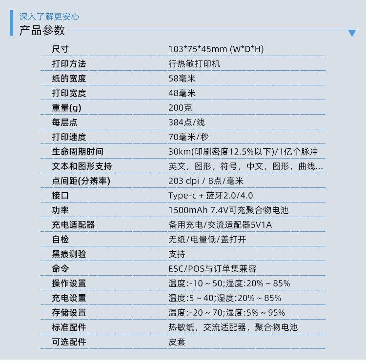 ¡Diga adiós a las impresoras matriciales tradicionales, ahora le proporcionamos impresoras portátiles más eficientes! Esta mini impresora térmica Bluetooth MP-58C combina peso ligero, excelente conectividad y batería de larga duración. La impresión de datos portátil hace que se utilice con éxito en diversos campos. La impresora puede alimentarse con una batería recargable. El diseño compacto le permite guardarla en su bolso para usarla fácilmente en cualquier momento y lugar.