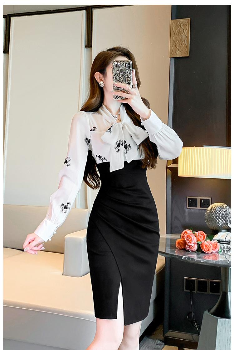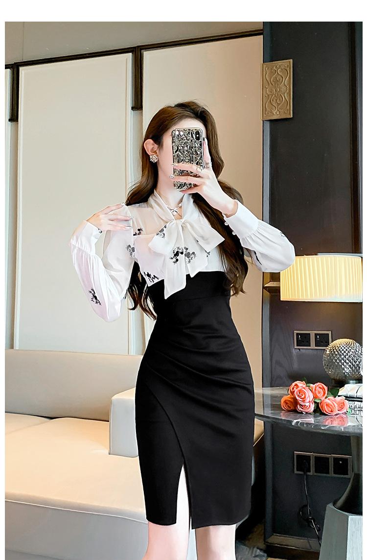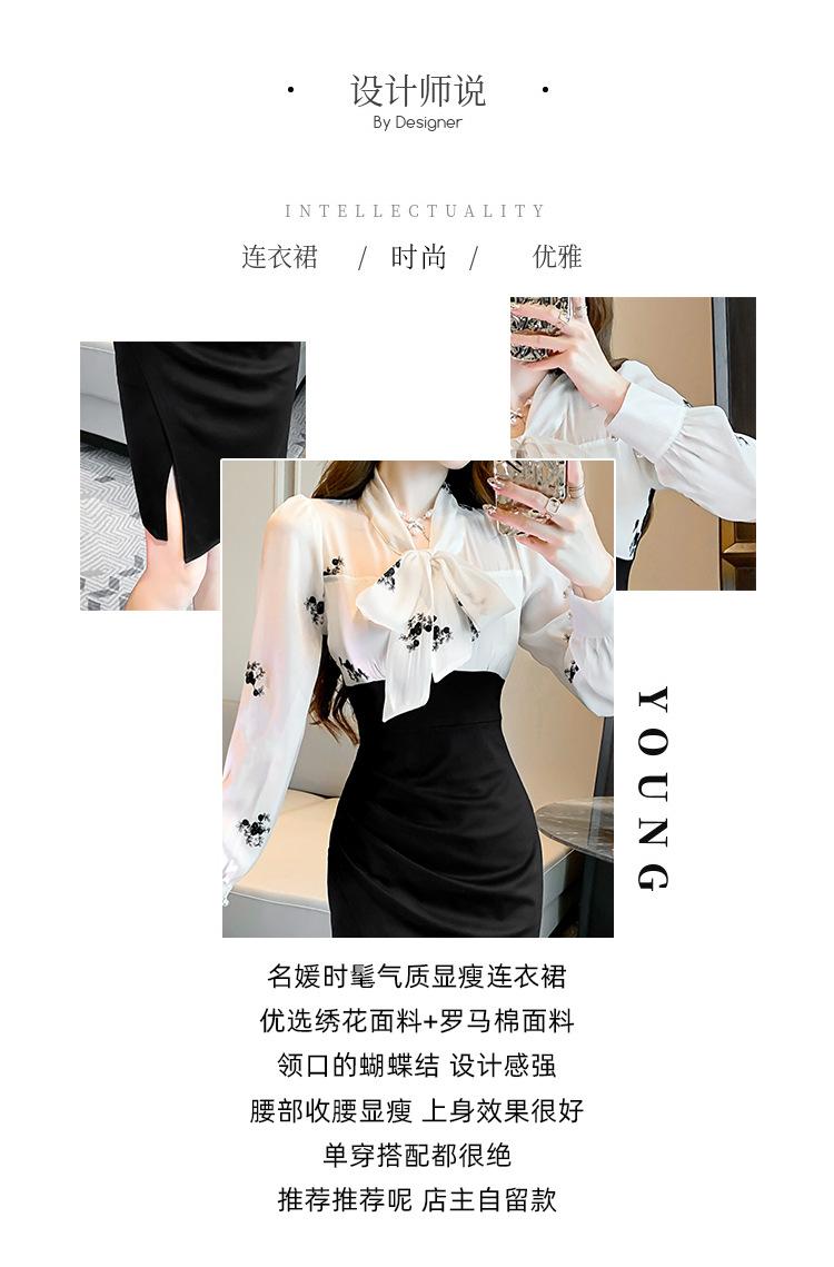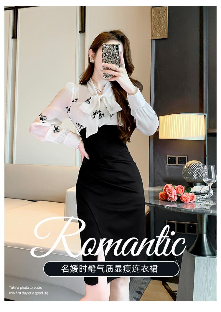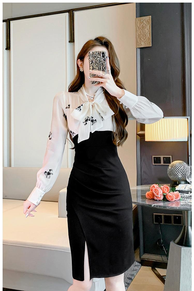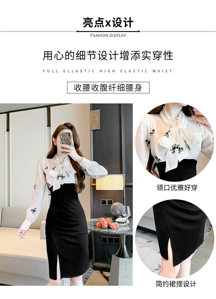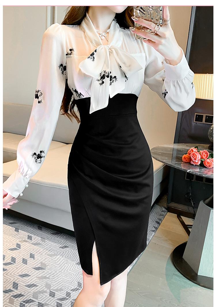 Vestido elegante de mujer con costuras en contraste de color, lazo, manga larga, corte ceñido a la cintura, abertura