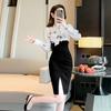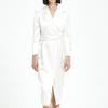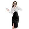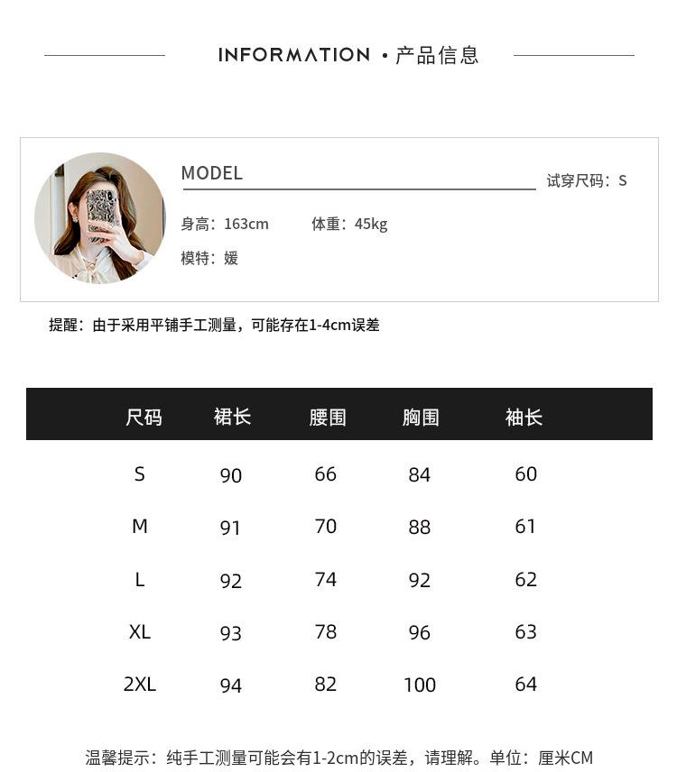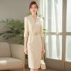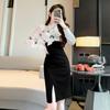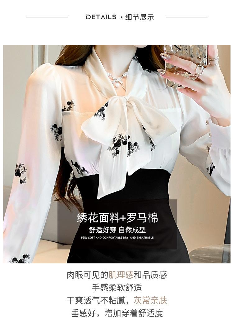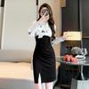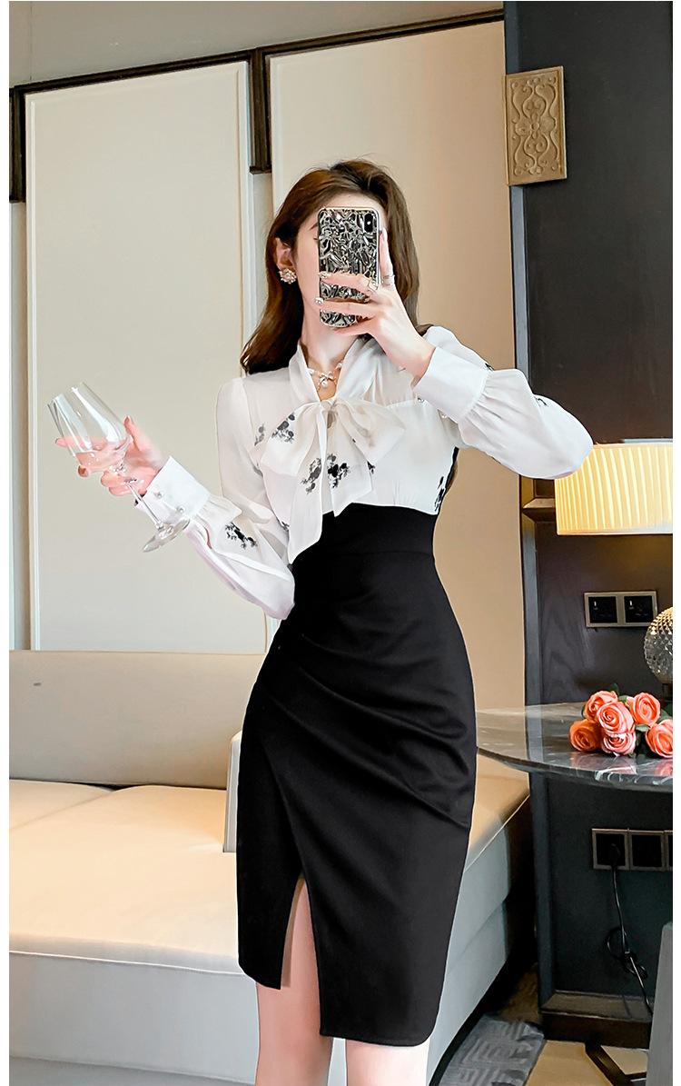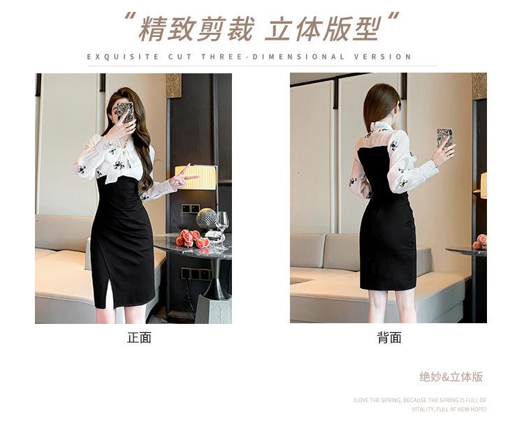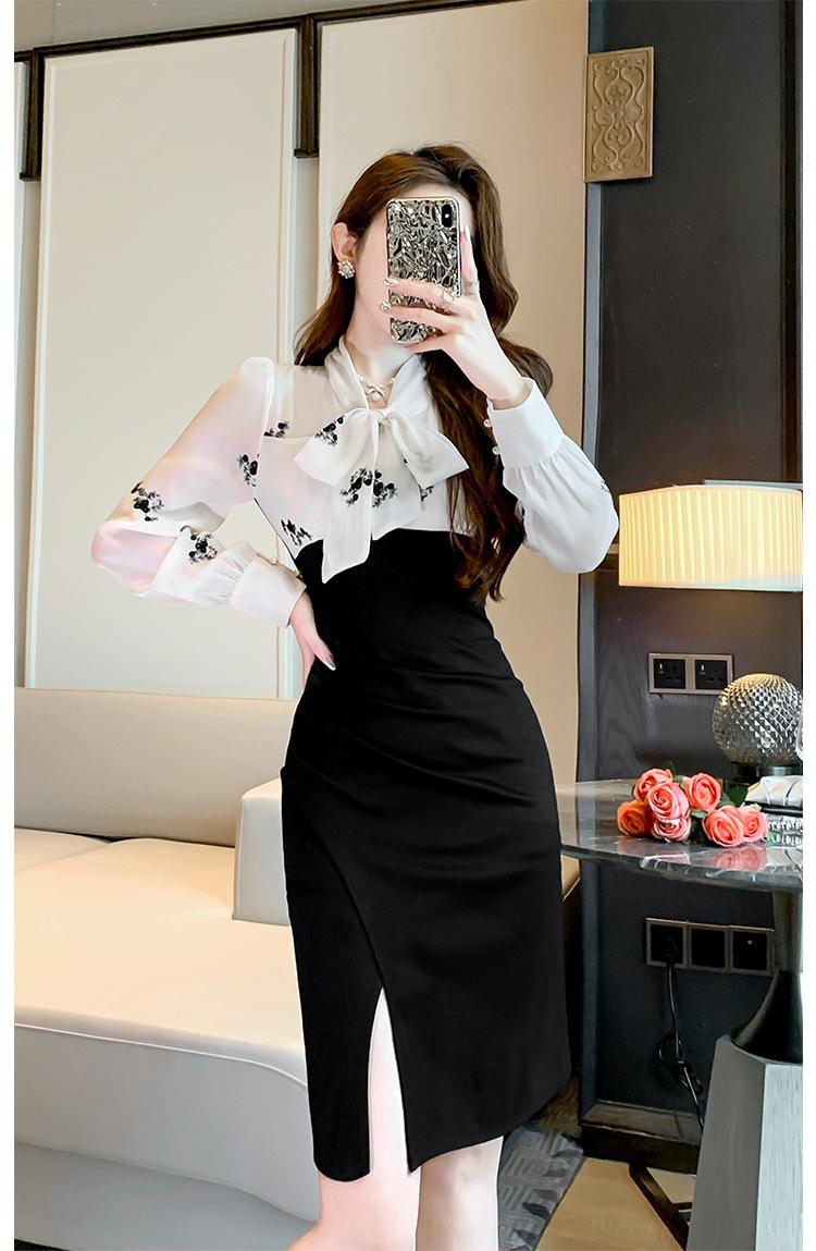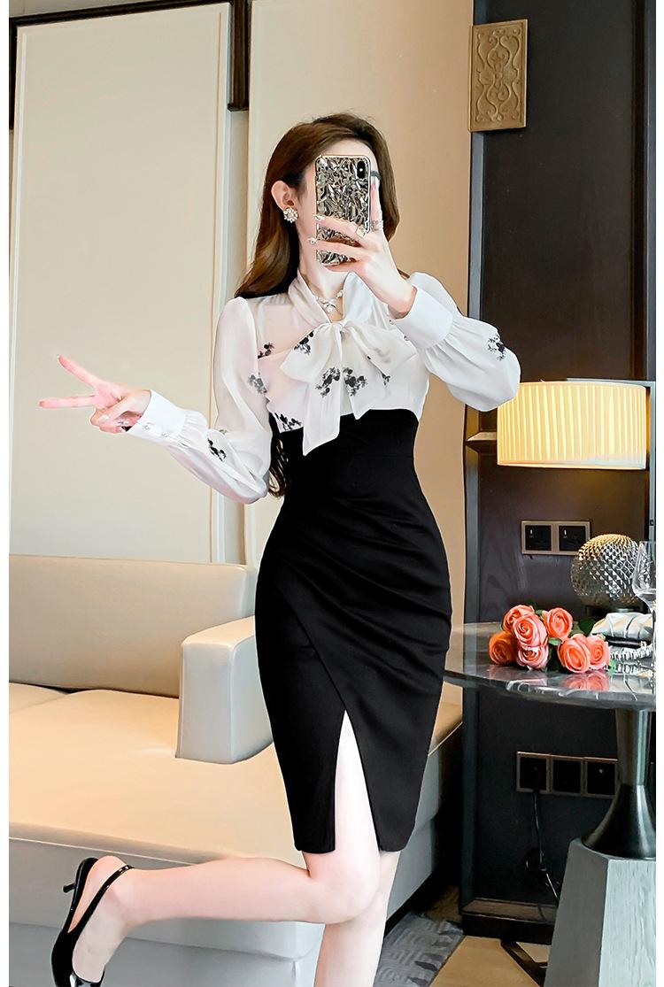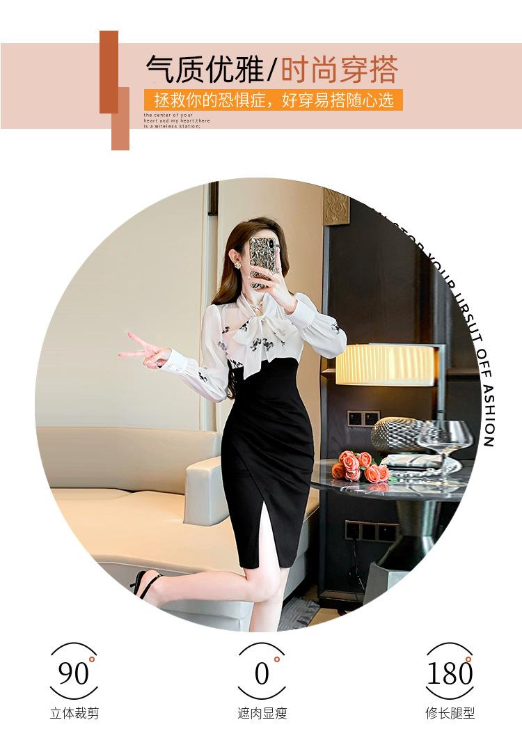 Vestido elegante de mujer con costuras en contraste de color, lazo, manga larga, corte ceñido a la cintura, abertura
