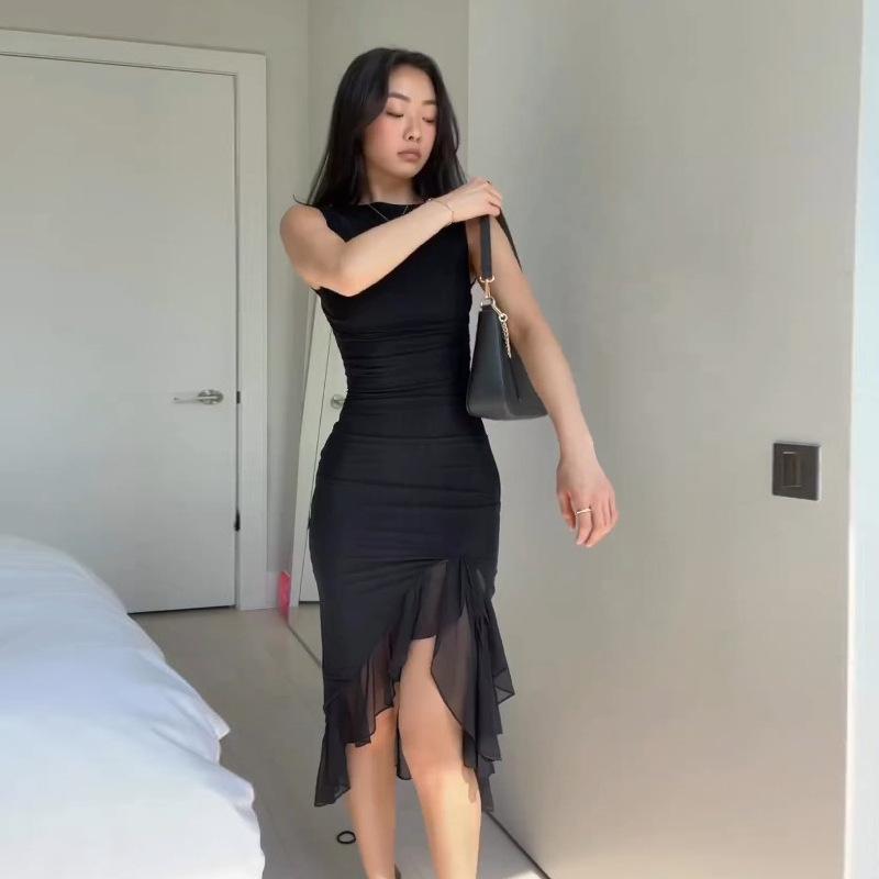 Vestido de verano 2024 con volantes, sin mangas, ajustado, de color sólido y espalda descubierta, sexy, para mujer, transfronterizo europeo y americano, venta al por mayor