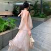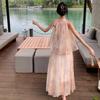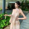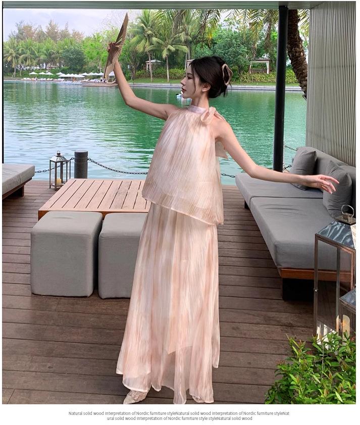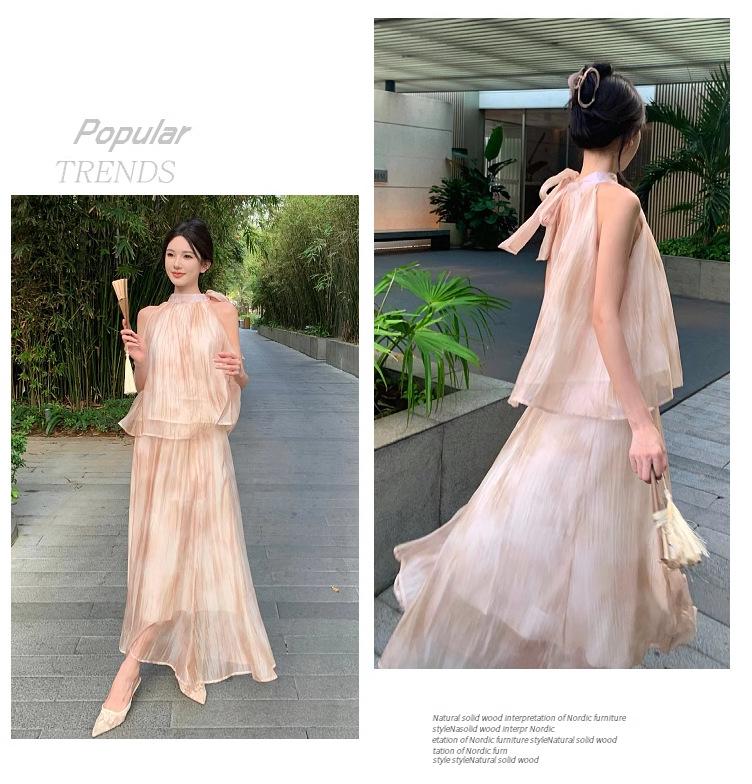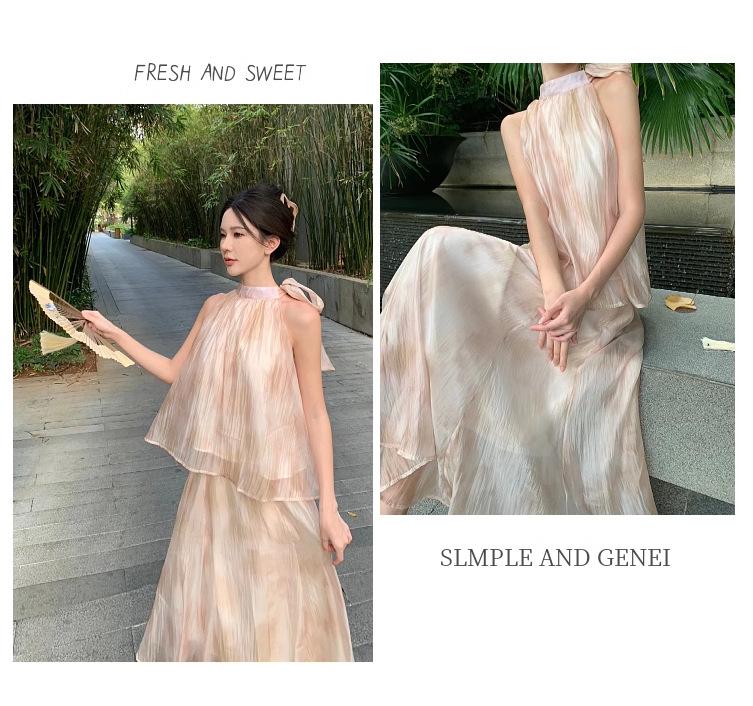 Nuevo estilo chino vintage tie-dye pintura al óleo cuello colgante top de verano para mujer cintura alta falda suelta traje de dos piezas traje de mujer