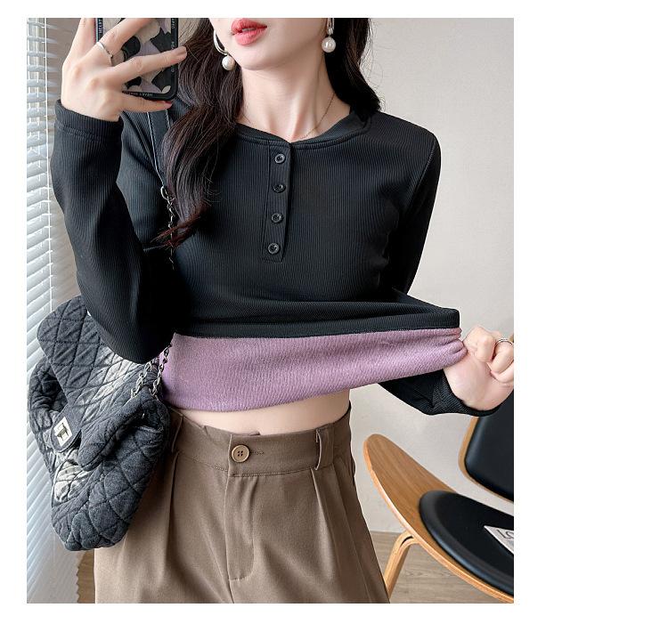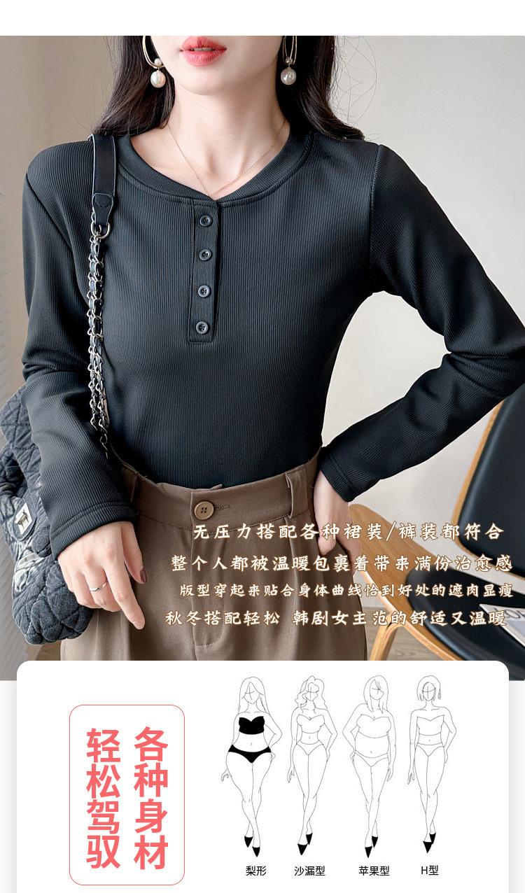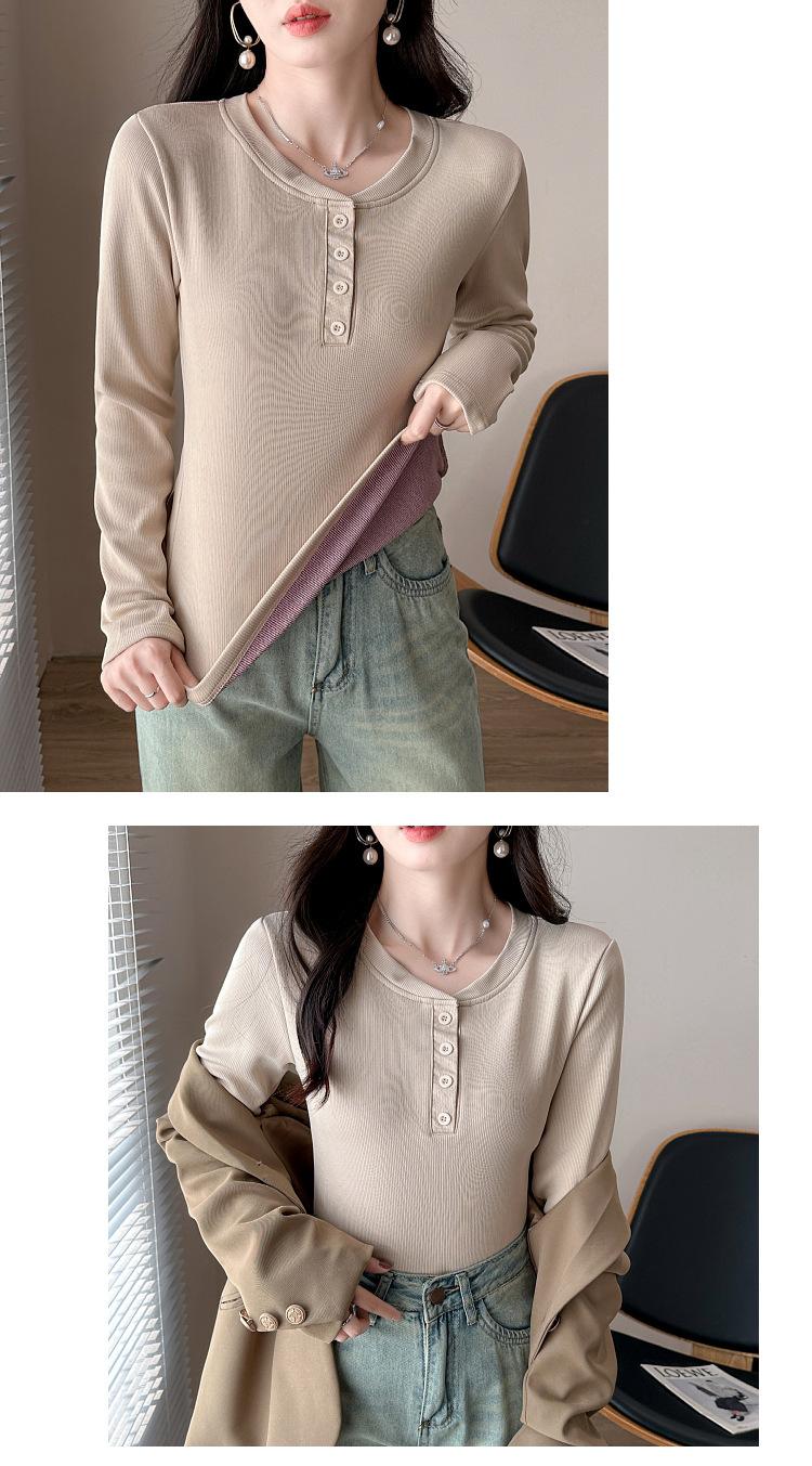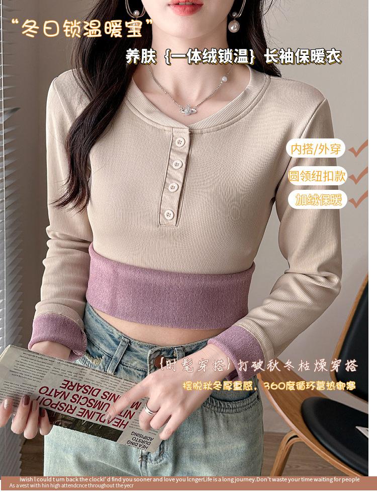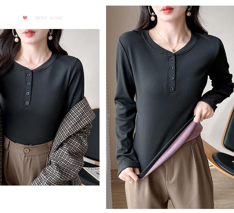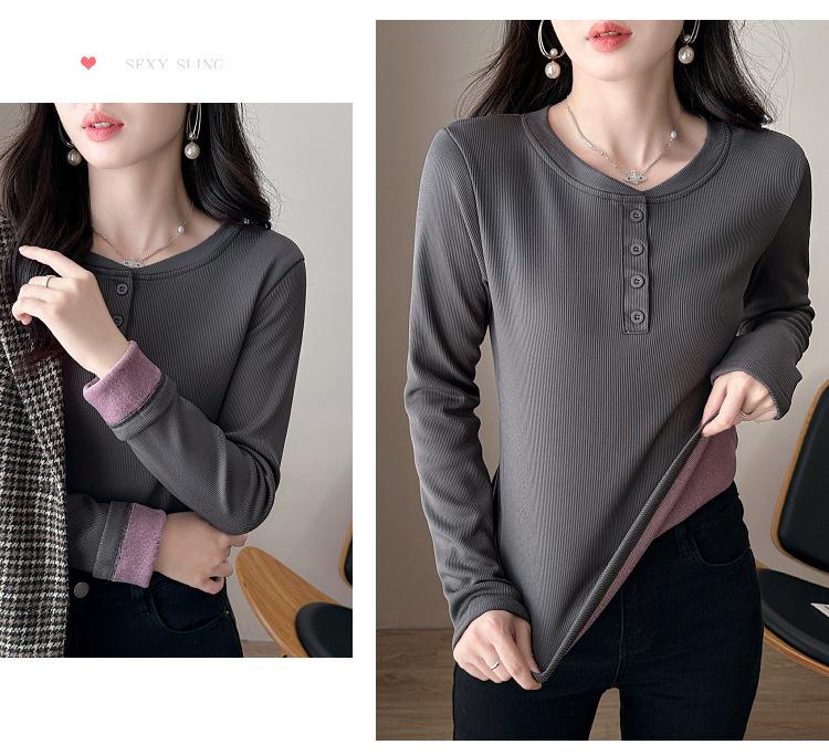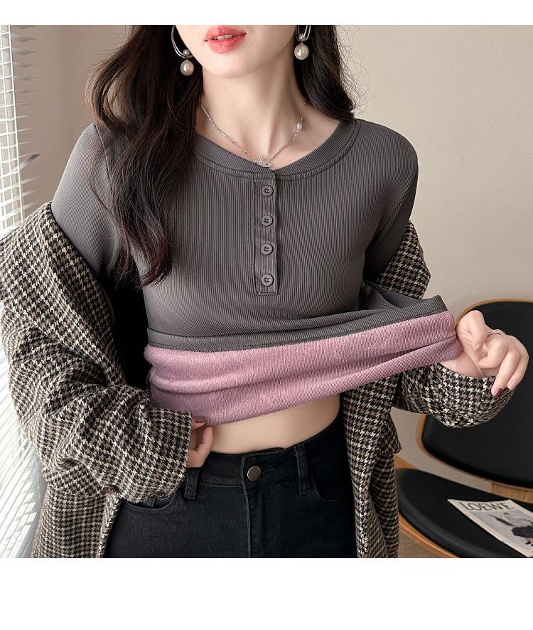 Camisa básica con forro polar para mujer, ropa abrigada de otoño e invierno, interior grueso, cuello redondo, manga larga, exterior, top de terciopelo de una pieza, ropa de otoño