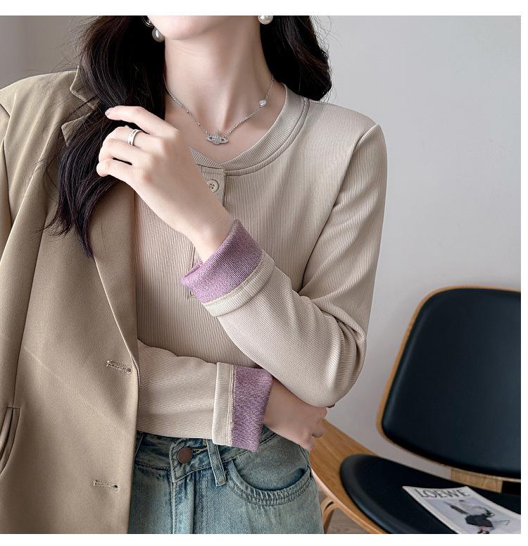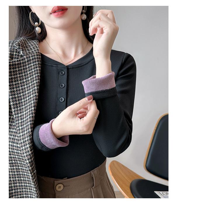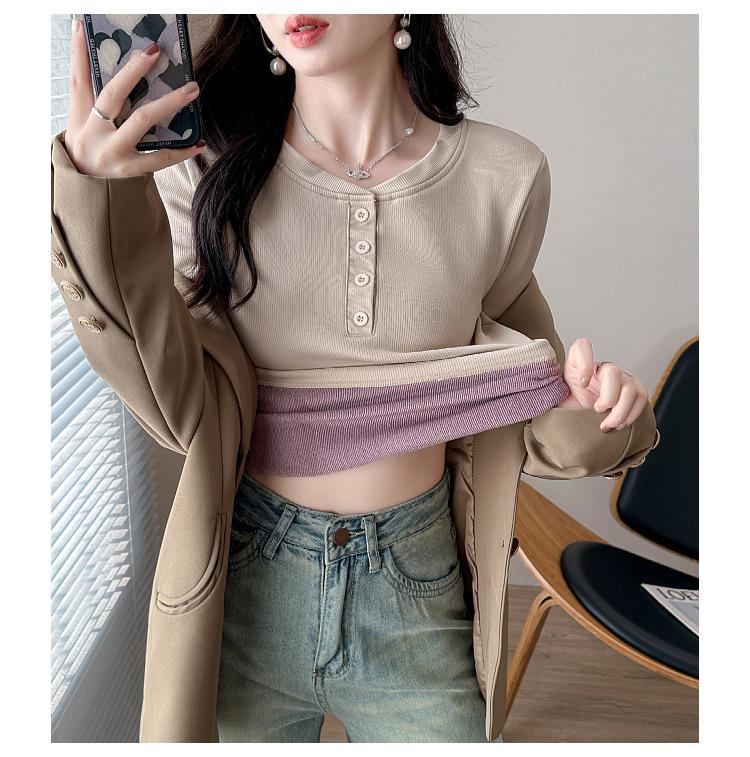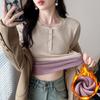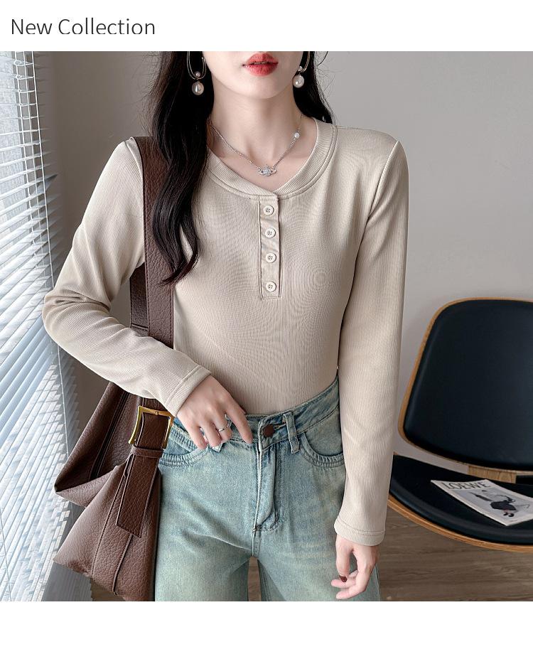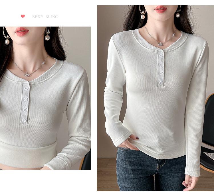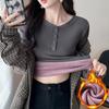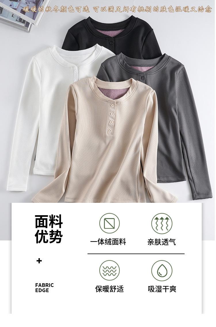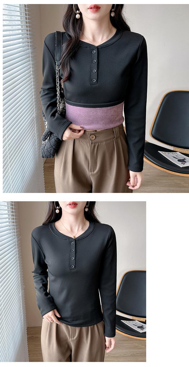 Camisa básica con forro polar para mujer, ropa abrigada de otoño e invierno, interior grueso, cuello redondo, manga larga, exterior, top de terciopelo de una pieza, ropa de otoño