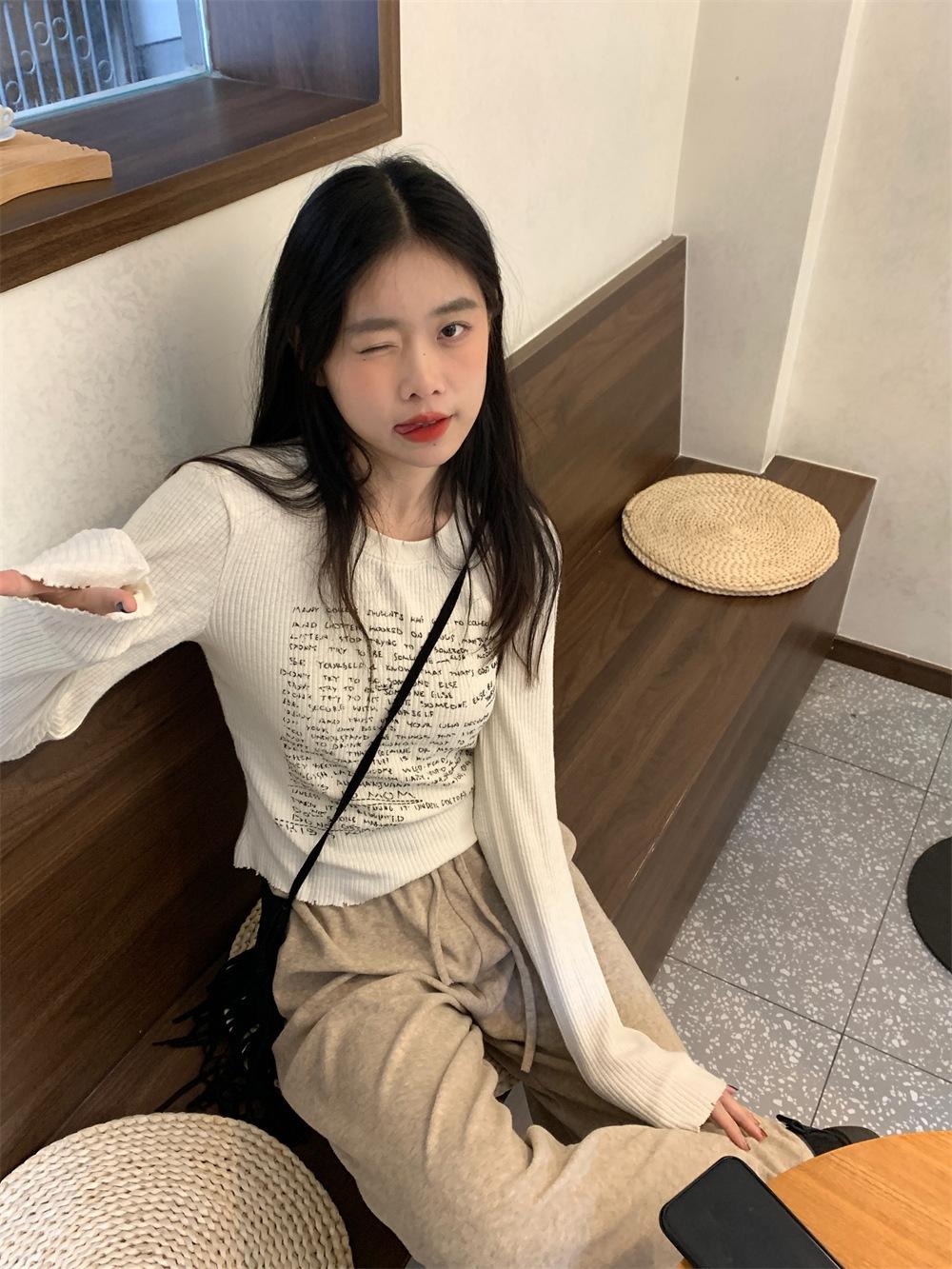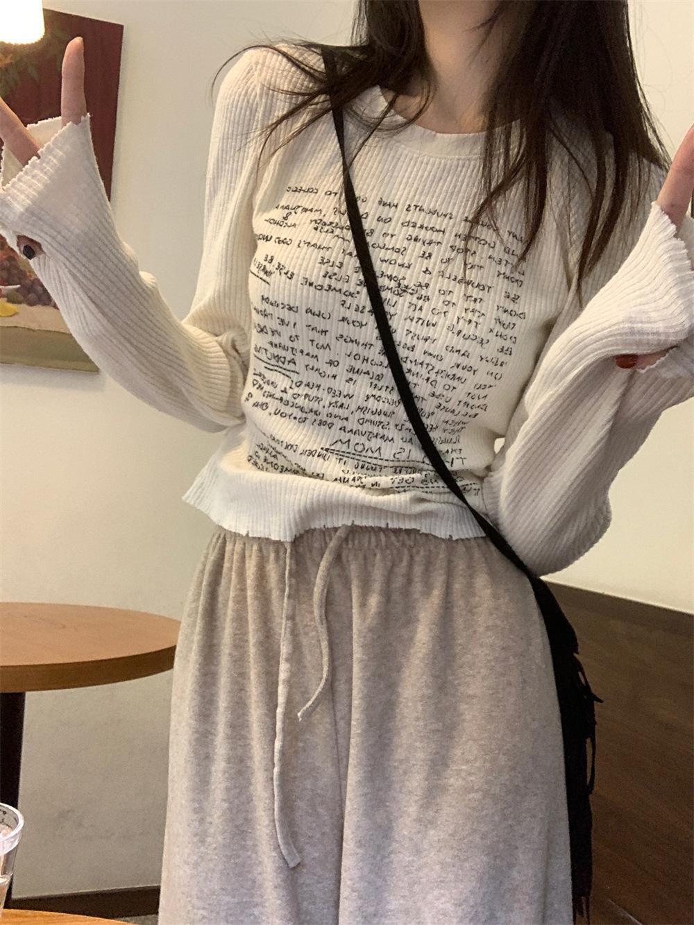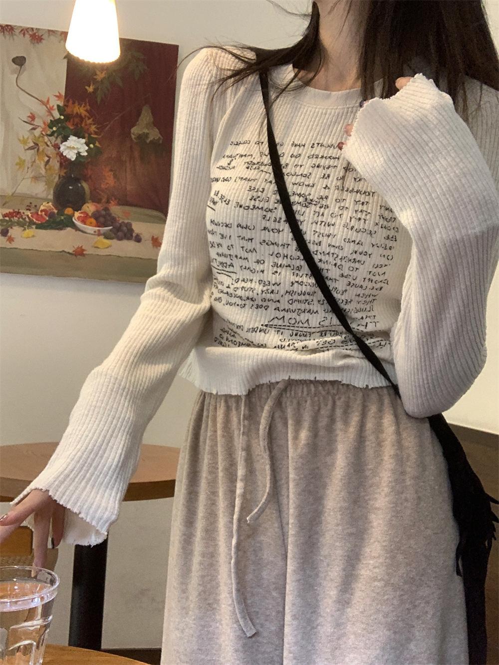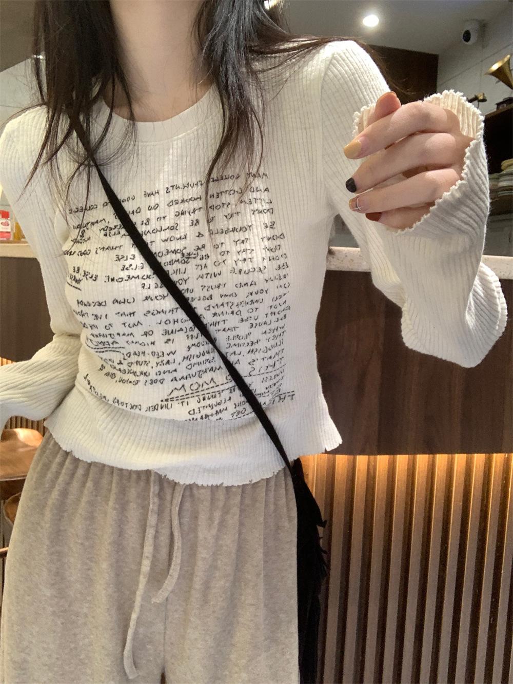 Camiseta de manga larga con estampado de letras y hombros descubiertos para mujer, estilo dulce y picante, corte entallado, color blanco, para otoño