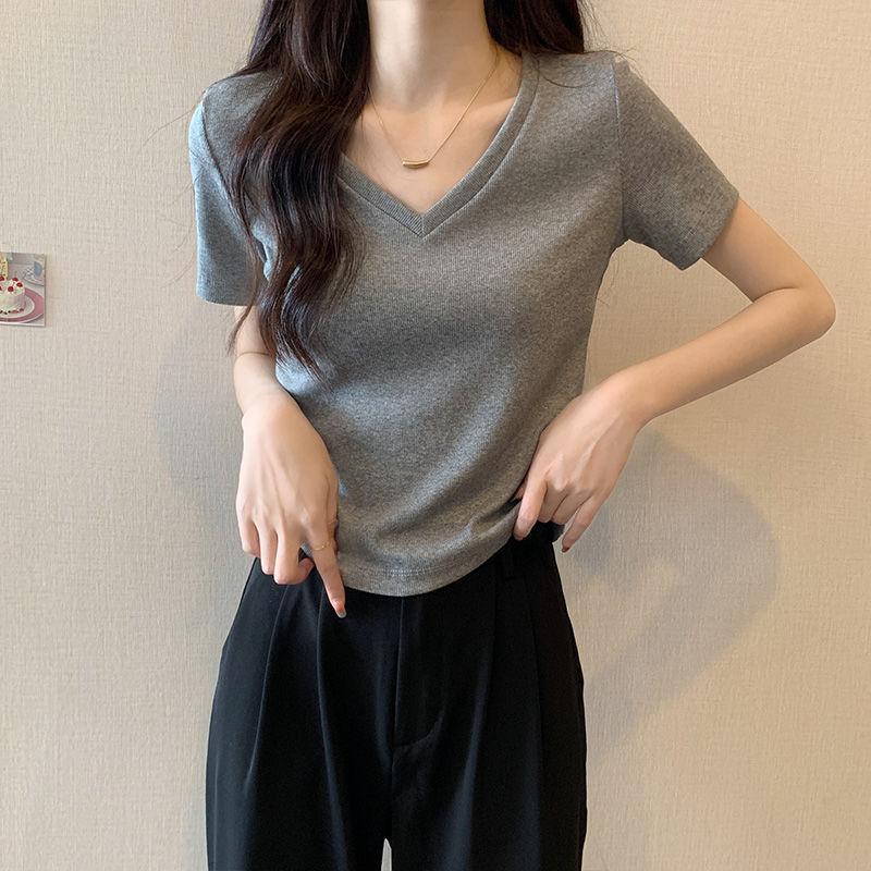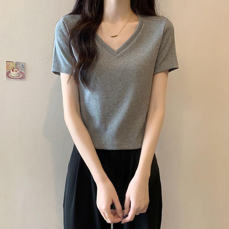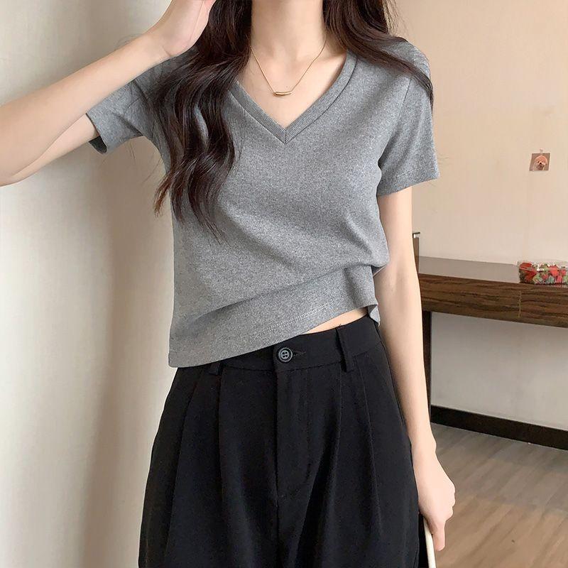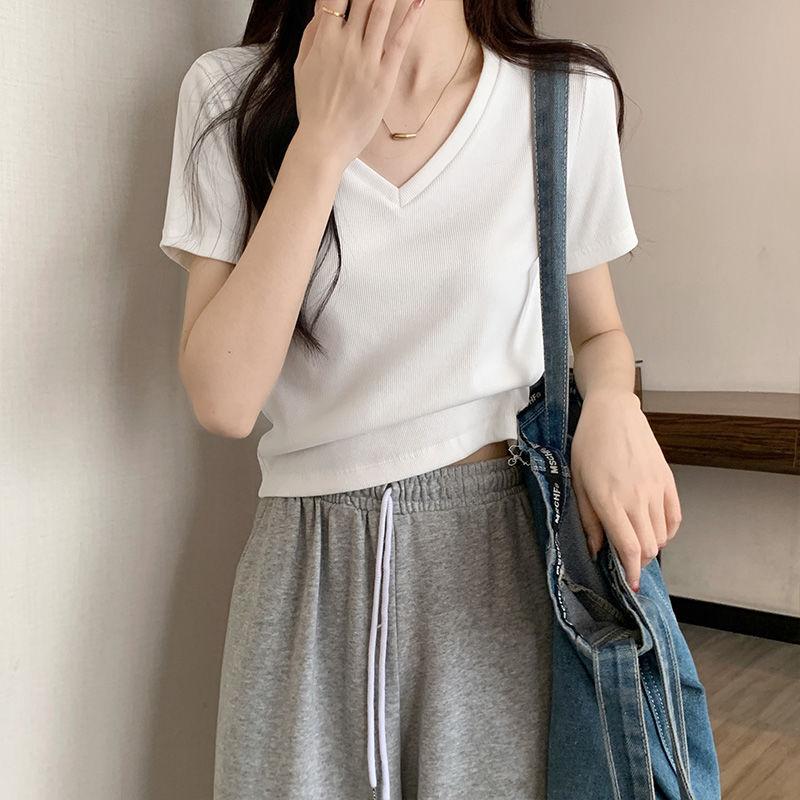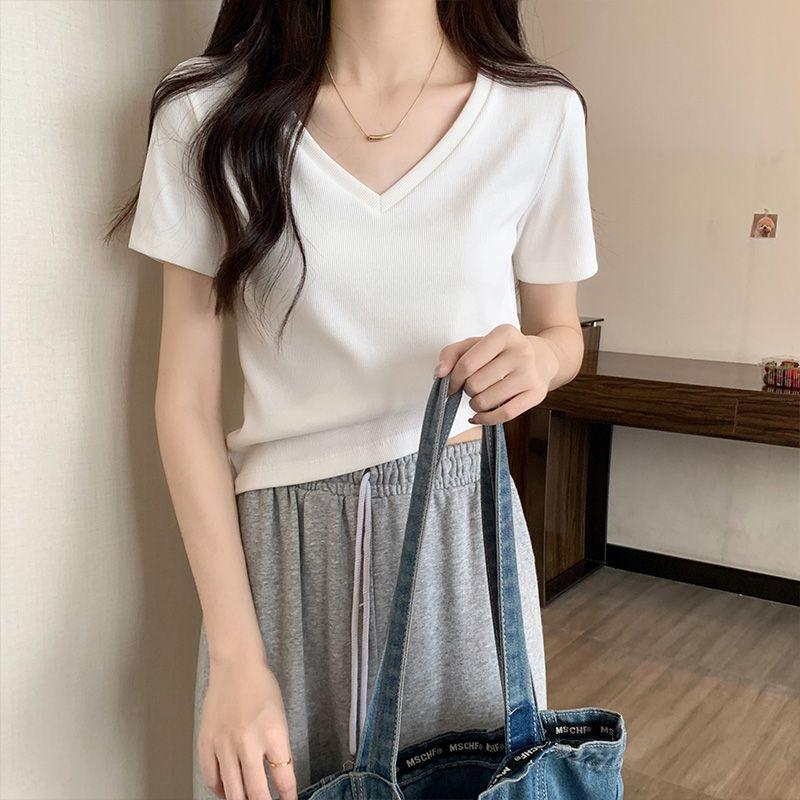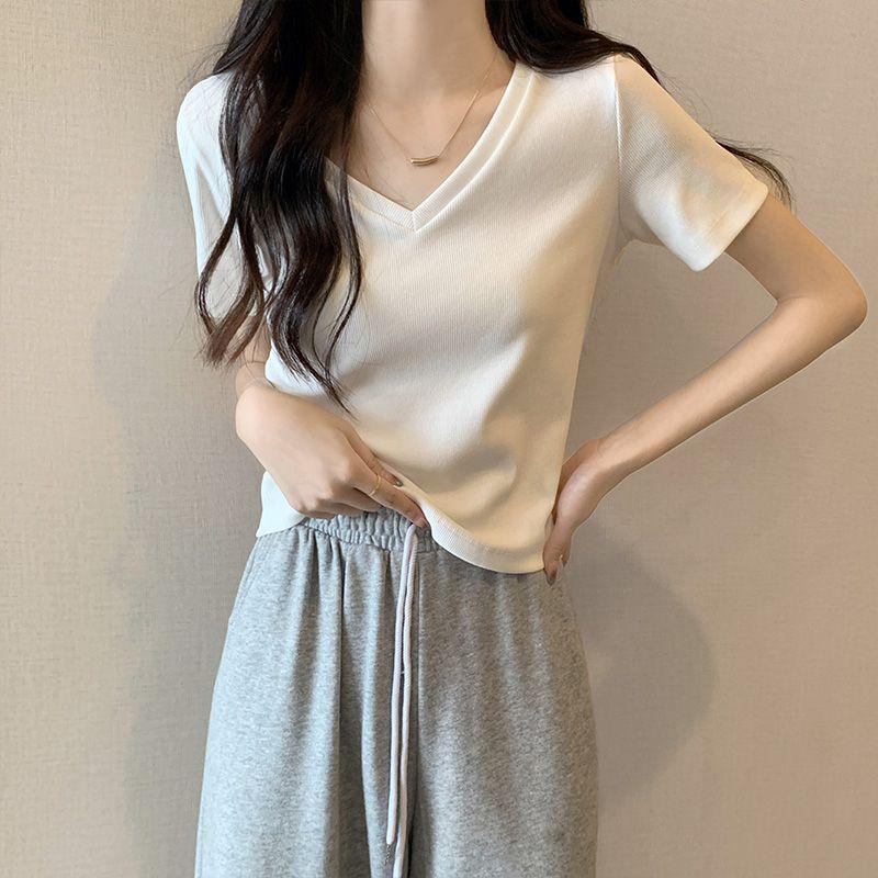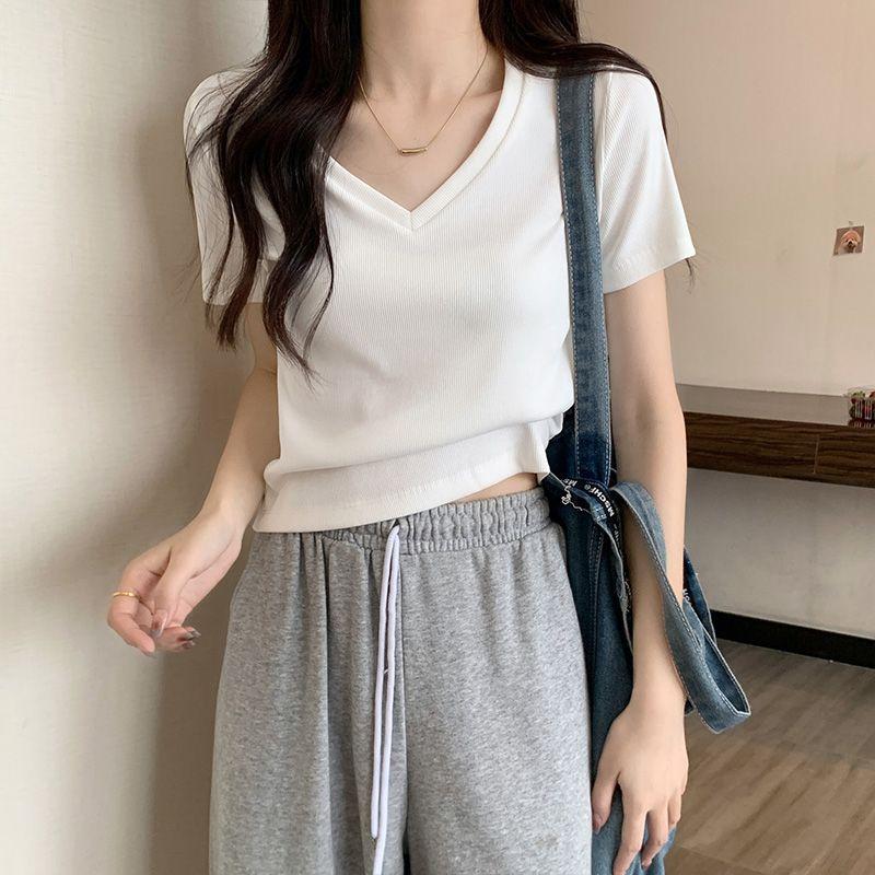 Camiseta de manga corta con escote en V y hombros descubiertos para mujer, novedad de verano 2023, top interior corto elástico ajustado de color liso que combina con todo.