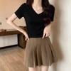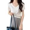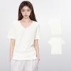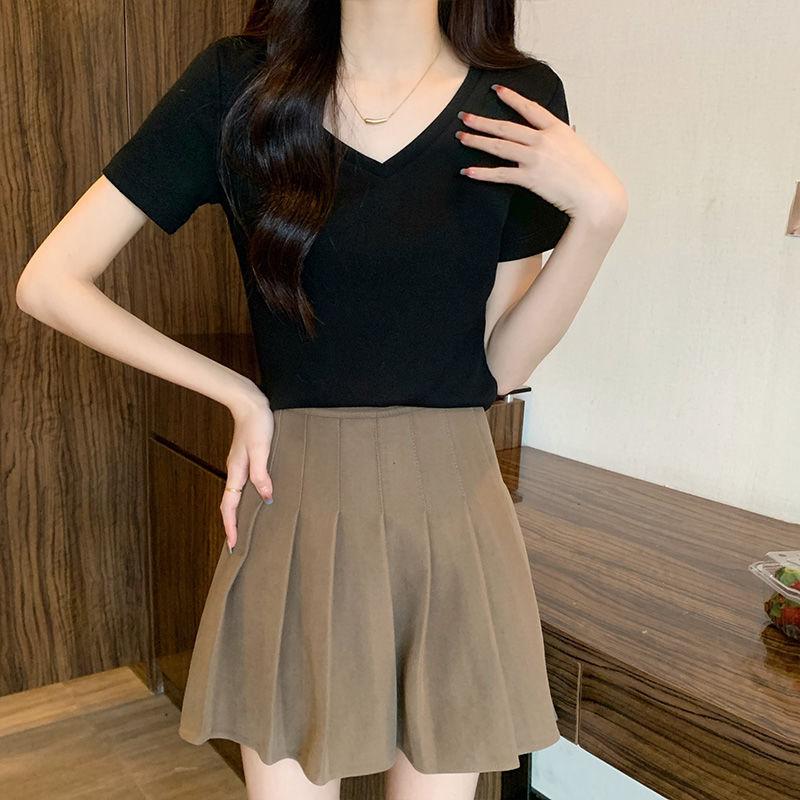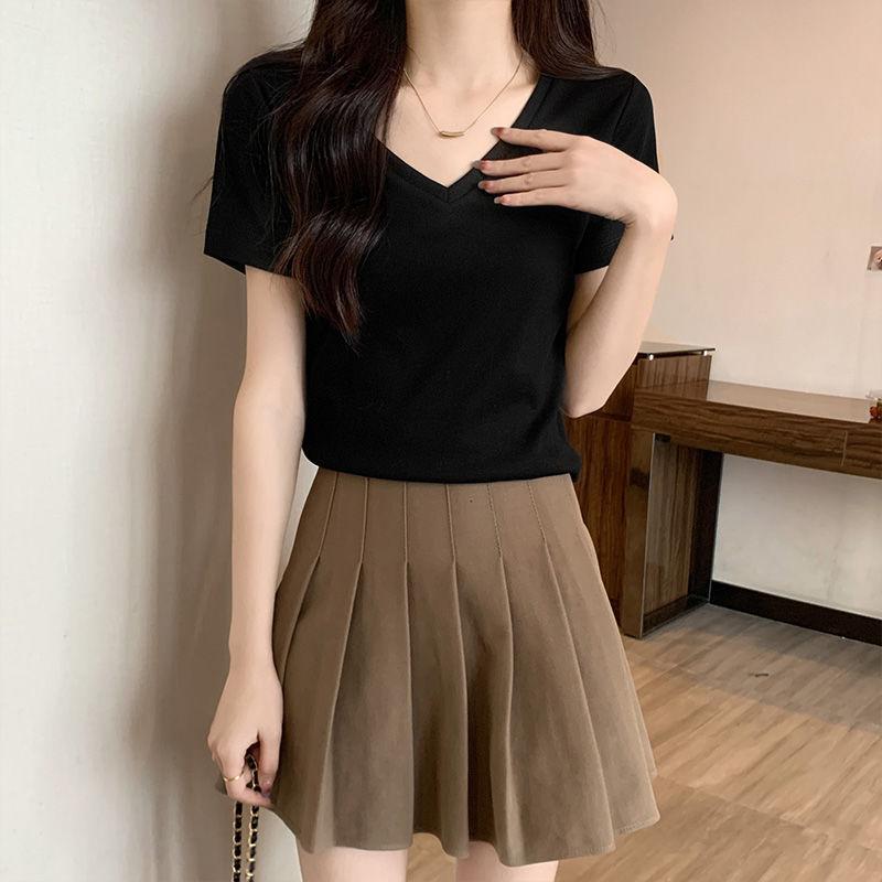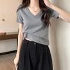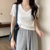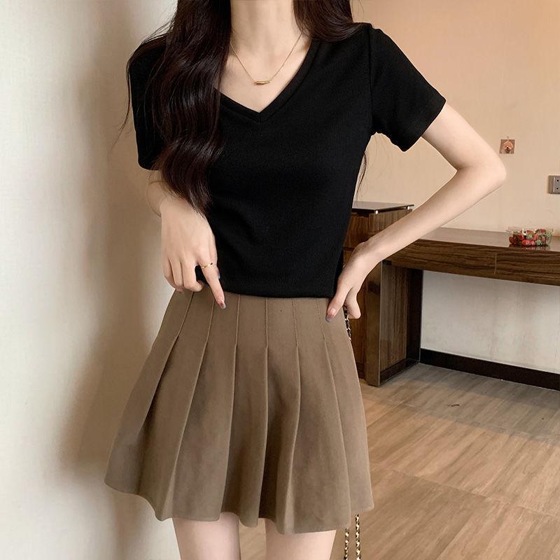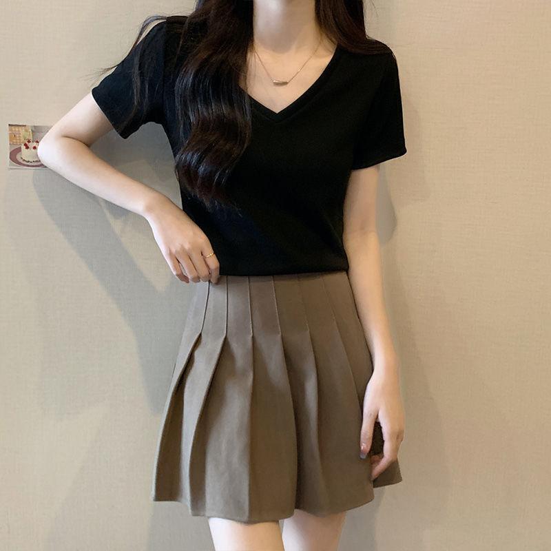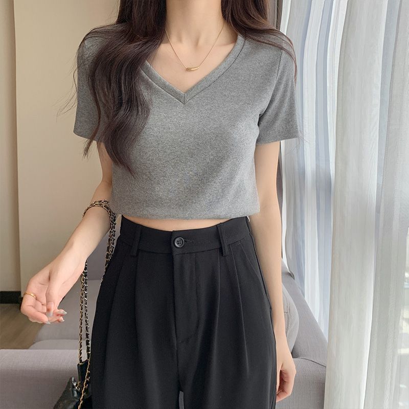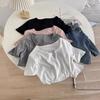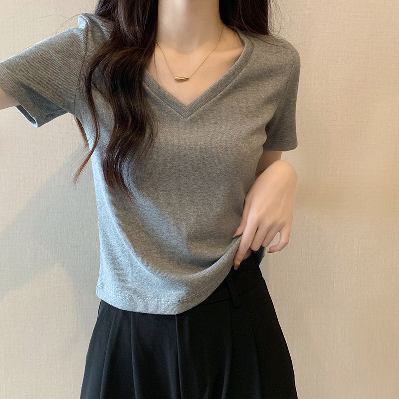 Camiseta de manga corta con escote en V y hombros descubiertos para mujer, novedad de verano 2023, top interior corto elástico ajustado de color liso que combina con todo.