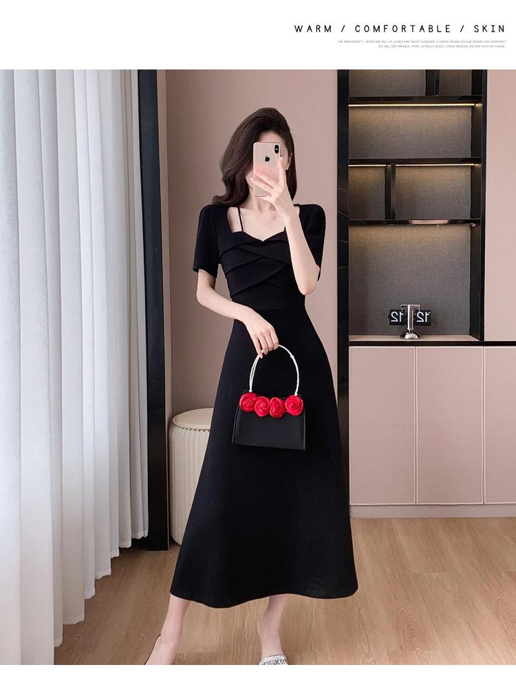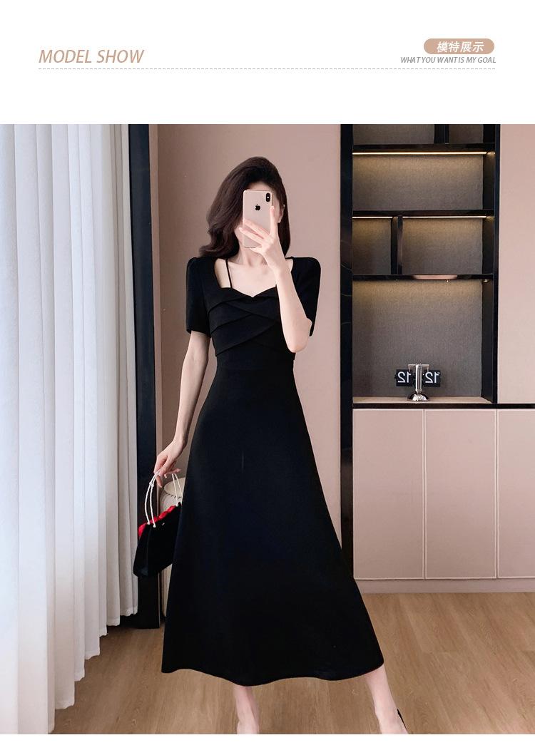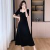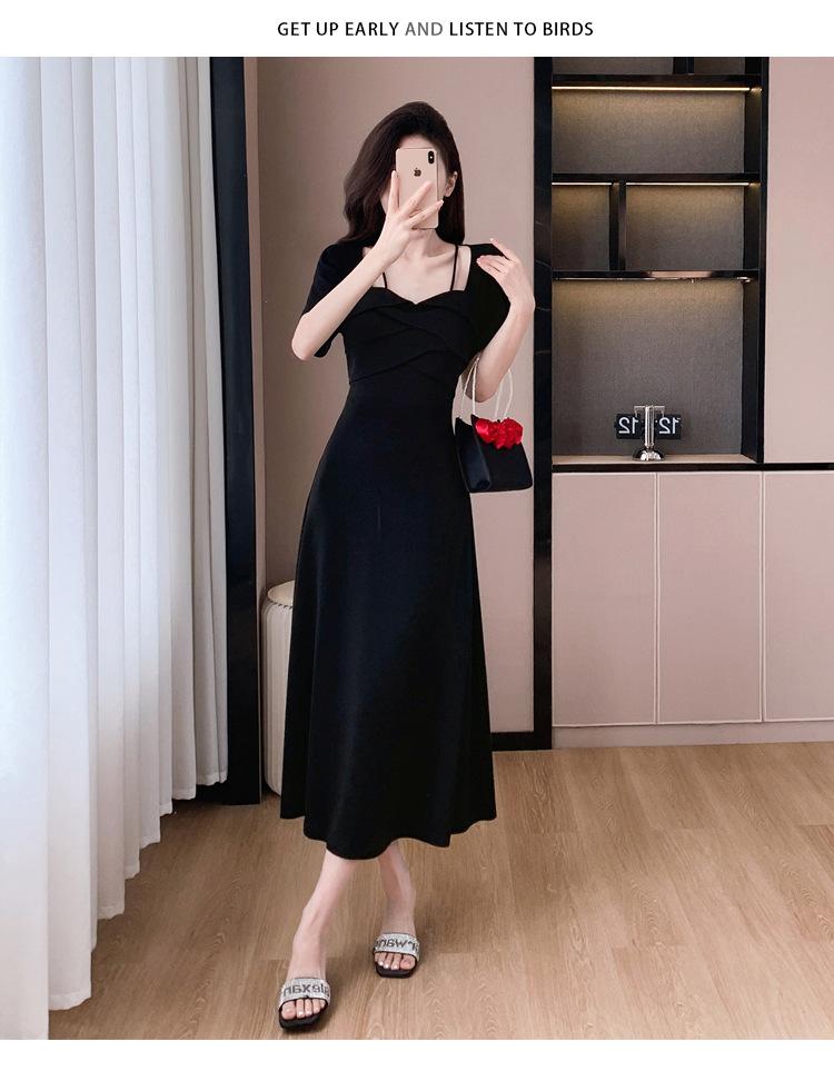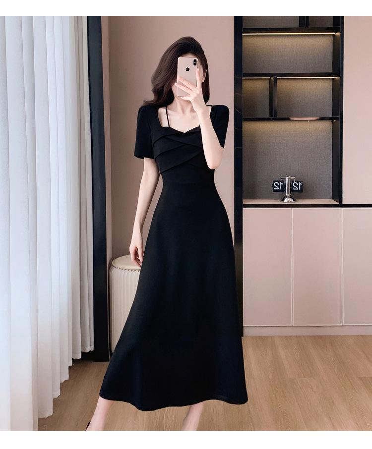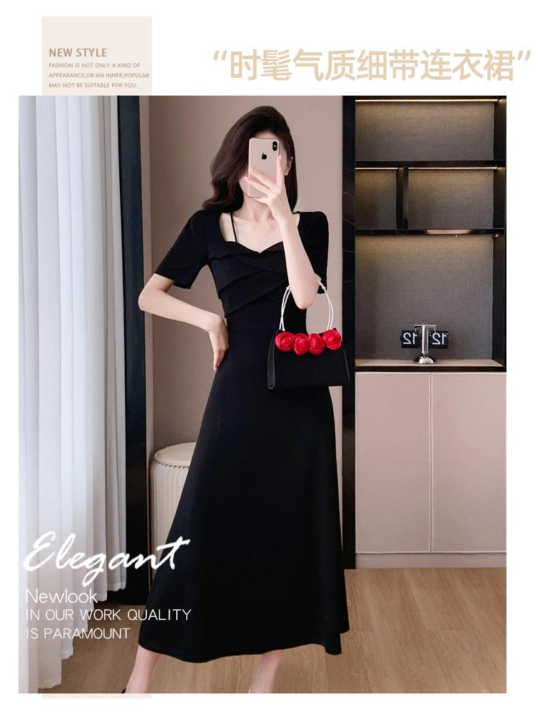 Vestido de verano de estilo coreano de alta calidad, estilo Hepburn, cuello francés, elegante, negro, ajustado, con diseño de tirantes.