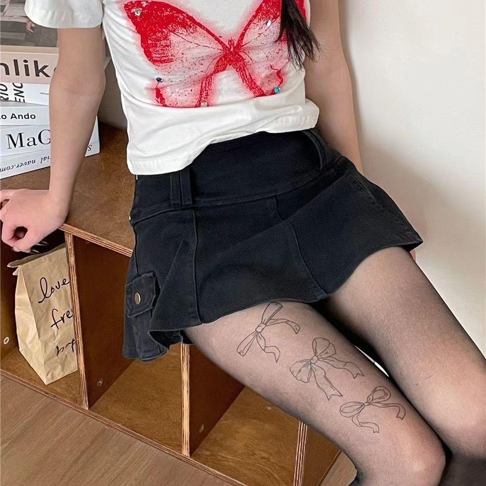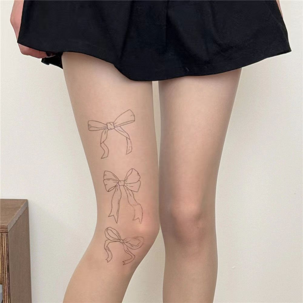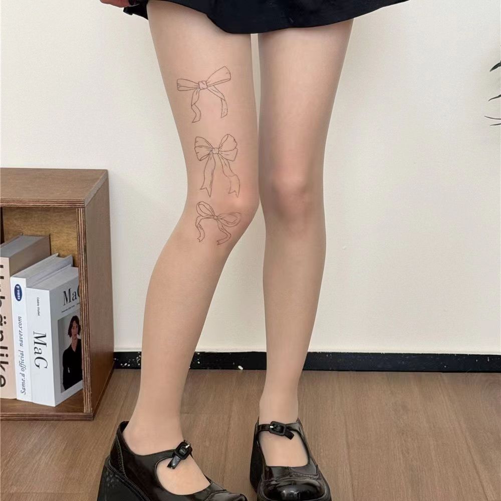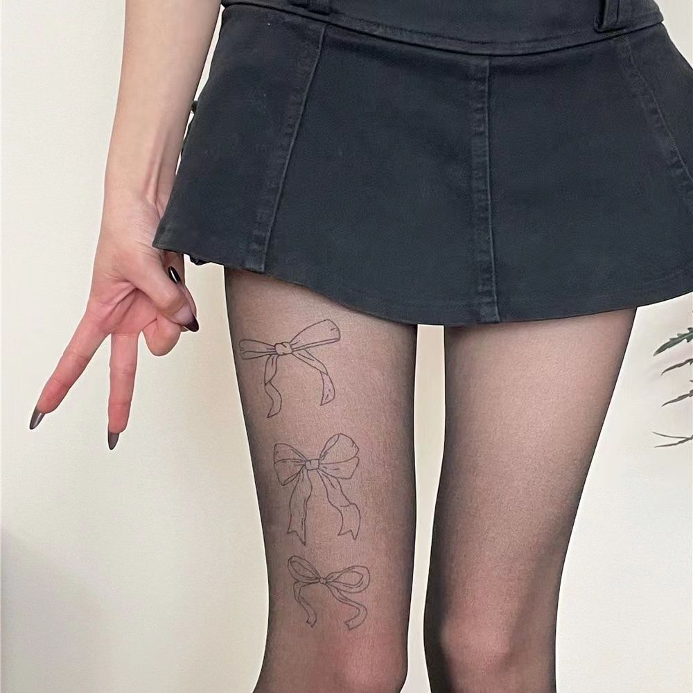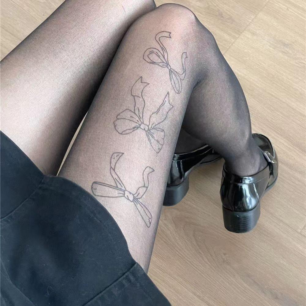 Medias Panty de Lazo Estampado de Seda Negra Medias Embellecedoras de la Piel Verano Delgadas Antidesgarros con Color Piel Natural