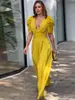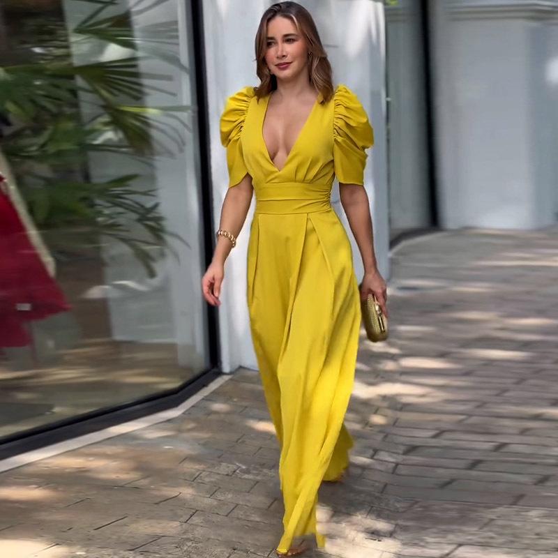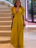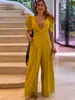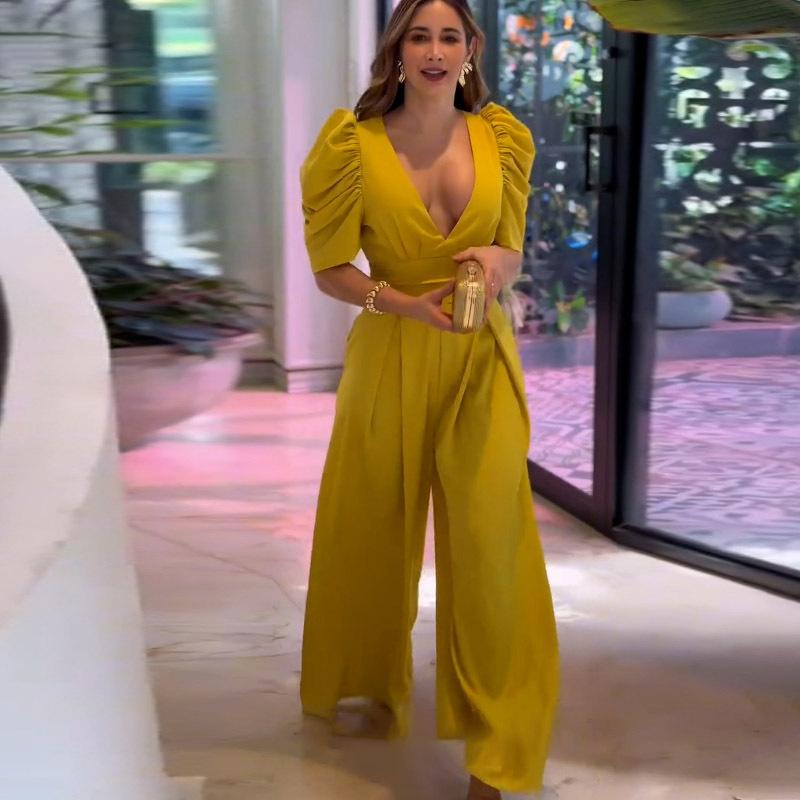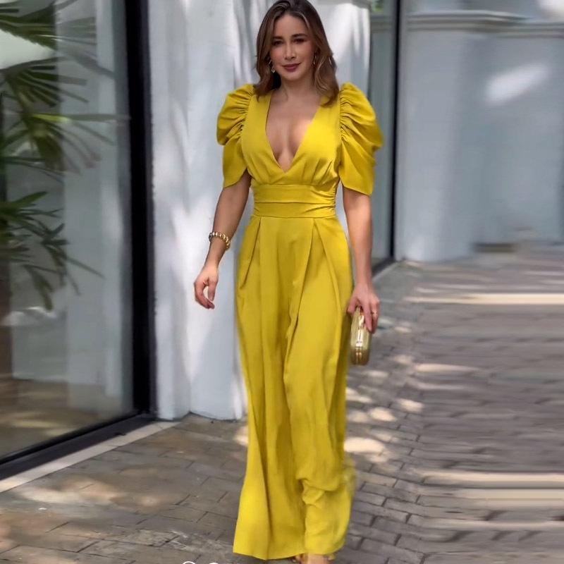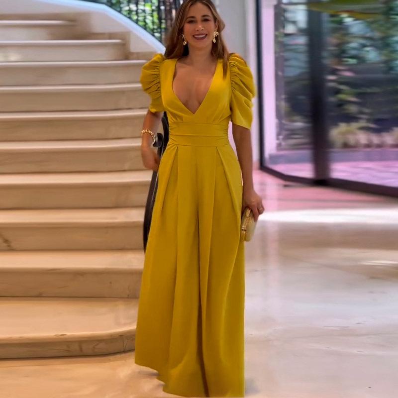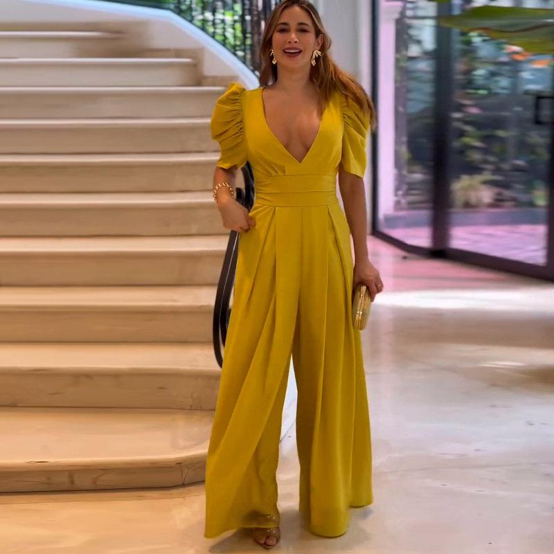 Amazon 2025 Comercio Exterior Moda Temperamento Color Sólido Costuras Cuello en V Profundo Pantalones de Cola Transfronterizo Europeo y Americano Pantalones de Pierna Ancha