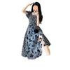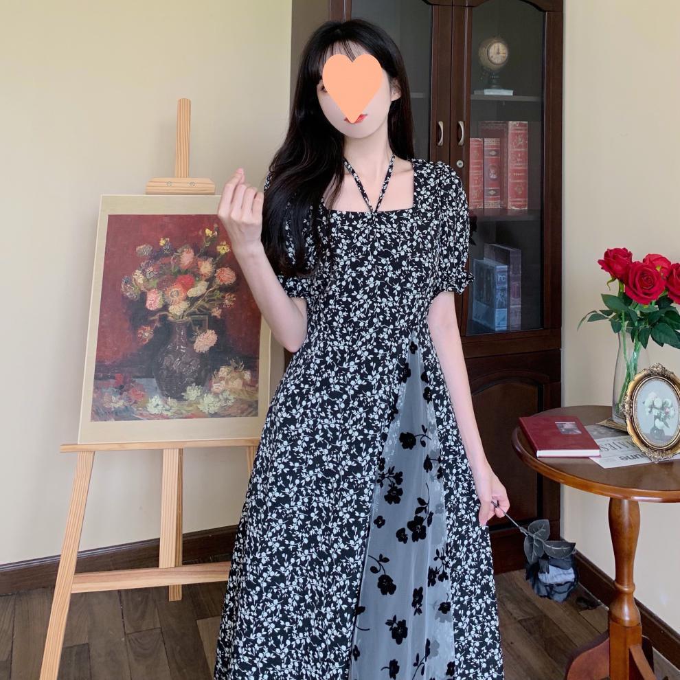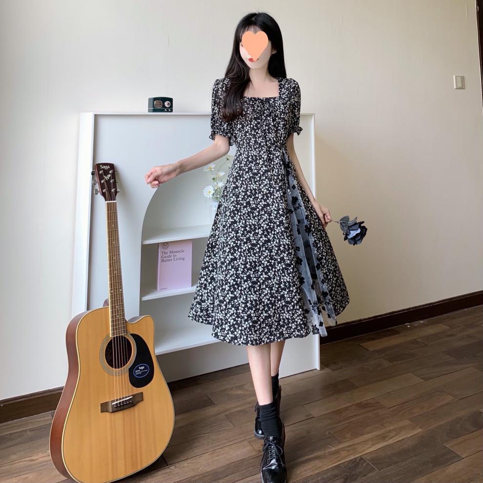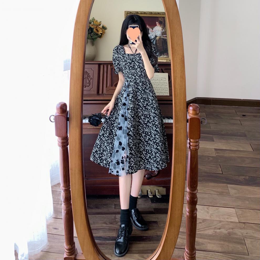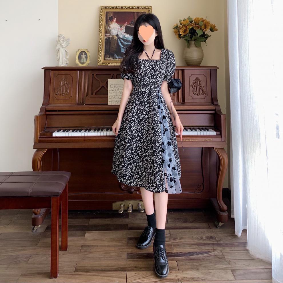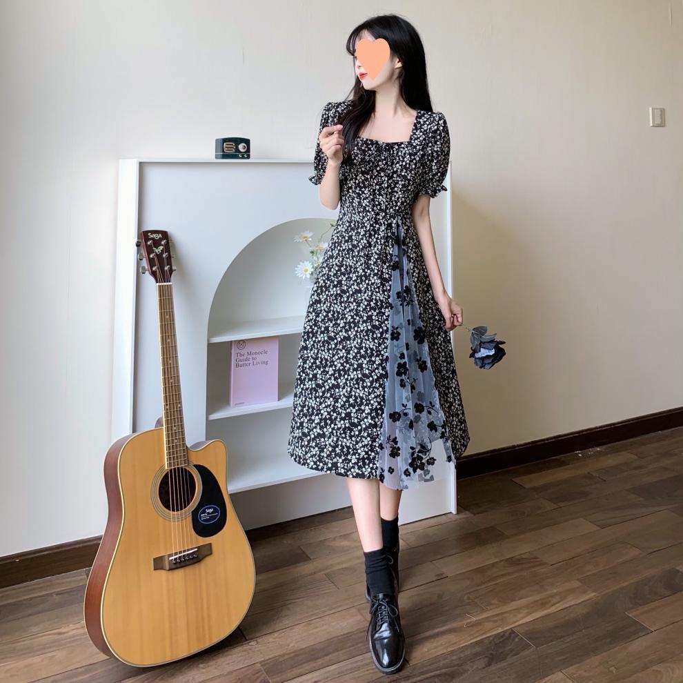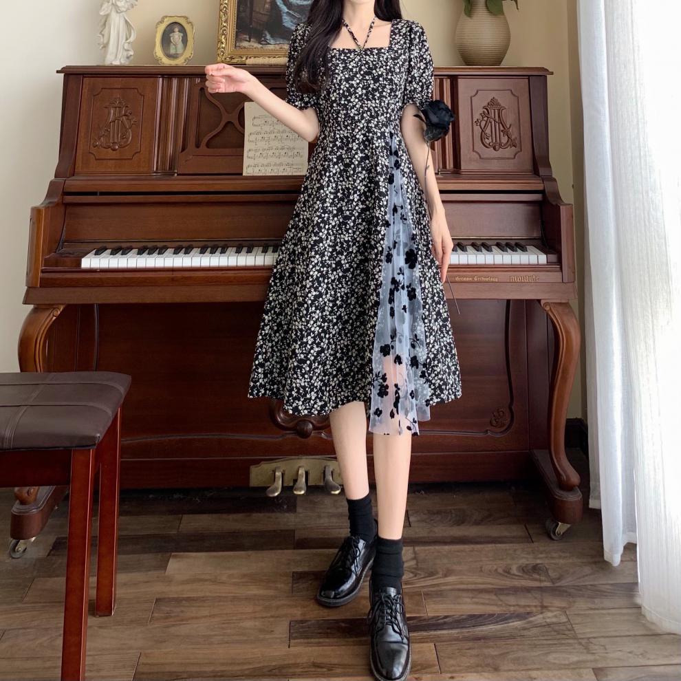 [Forrado] Vestido Floral Verano 2025 para Mujer Diseño Retro Empalme de Malla Temperamento Falda Midi