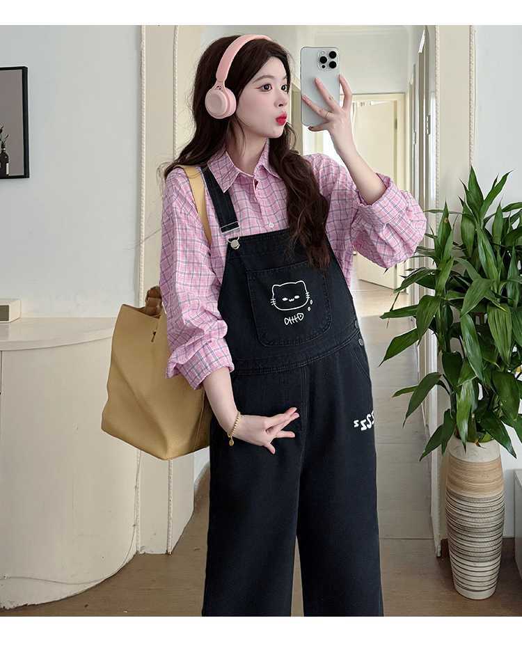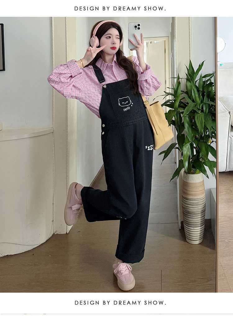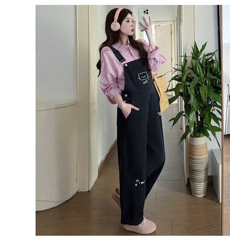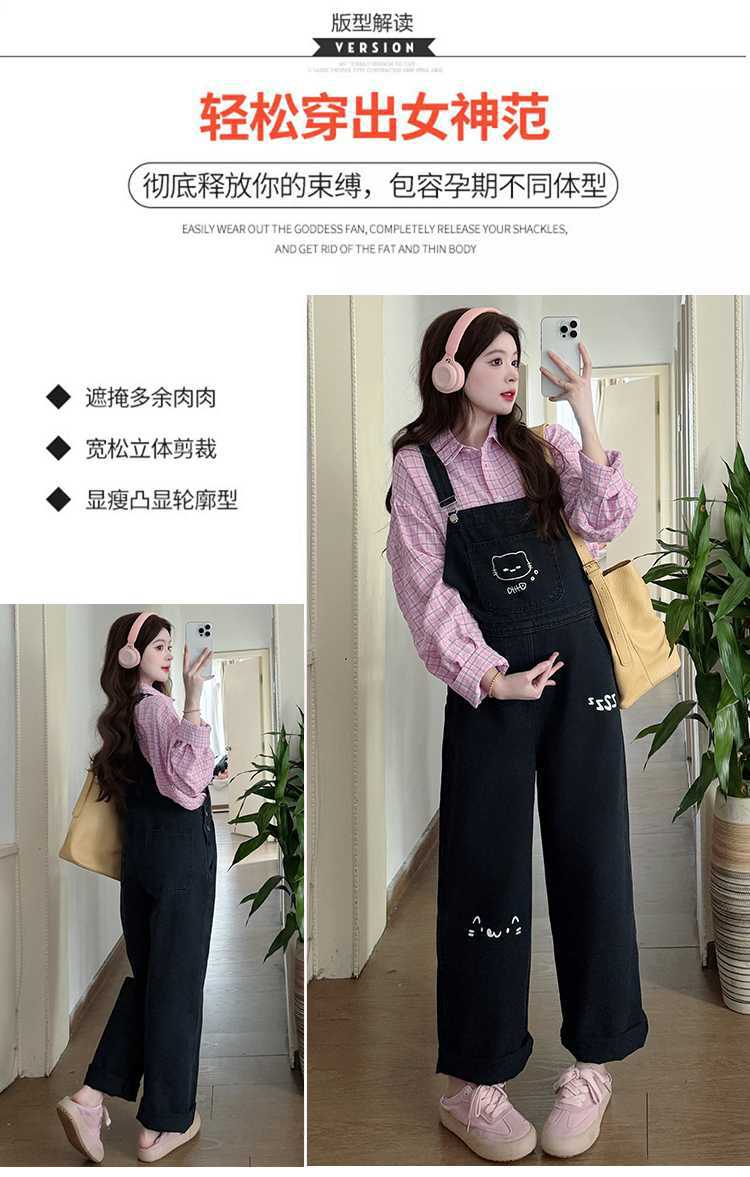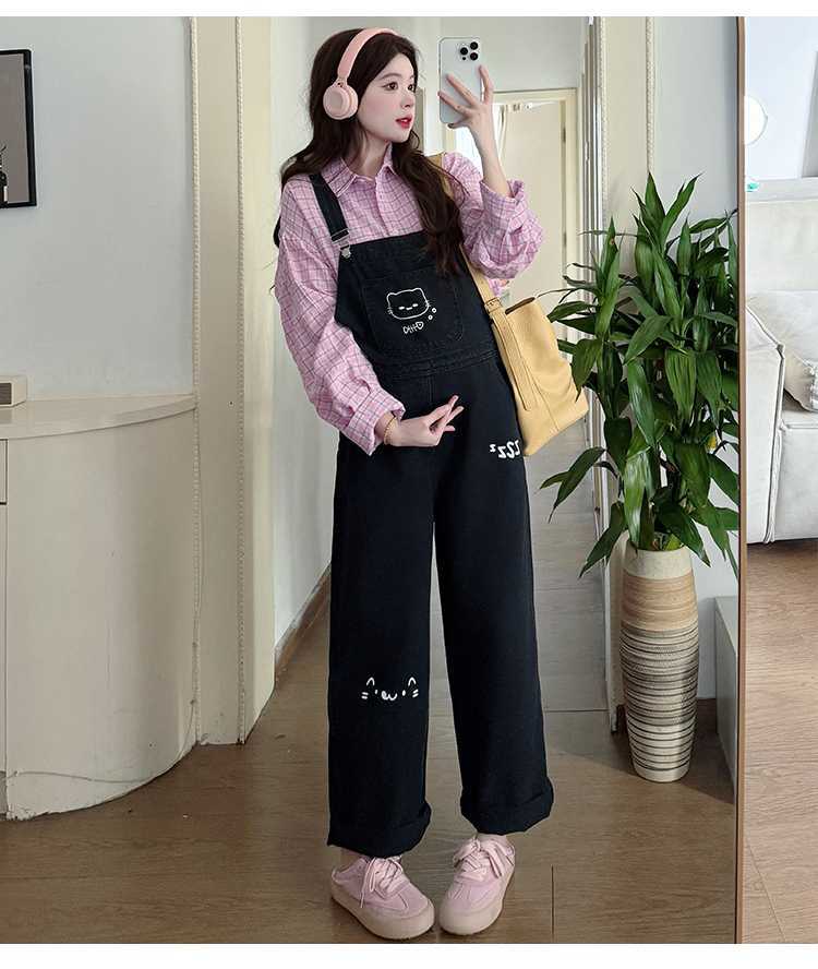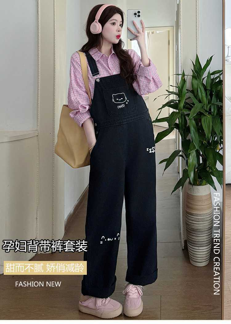 Camisa a cuadros de dos piezas, pantalones vaqueros informales con tirantes para embarazadas, moda sencilla de maternidad de primavera 2025