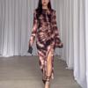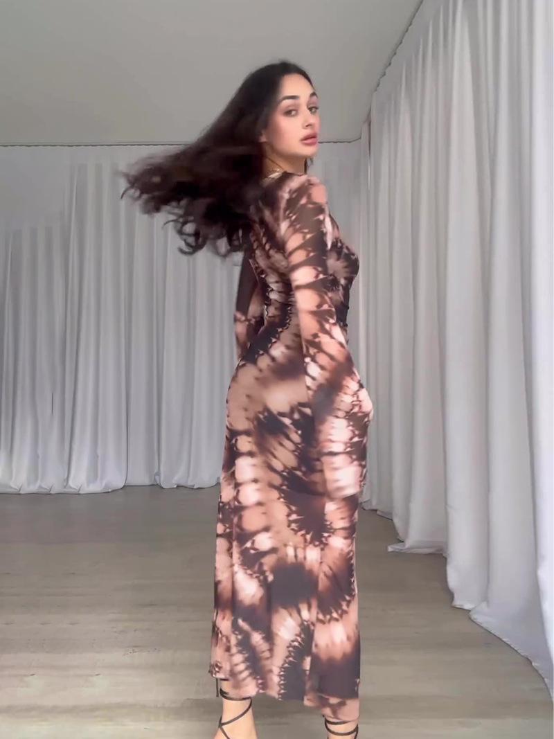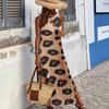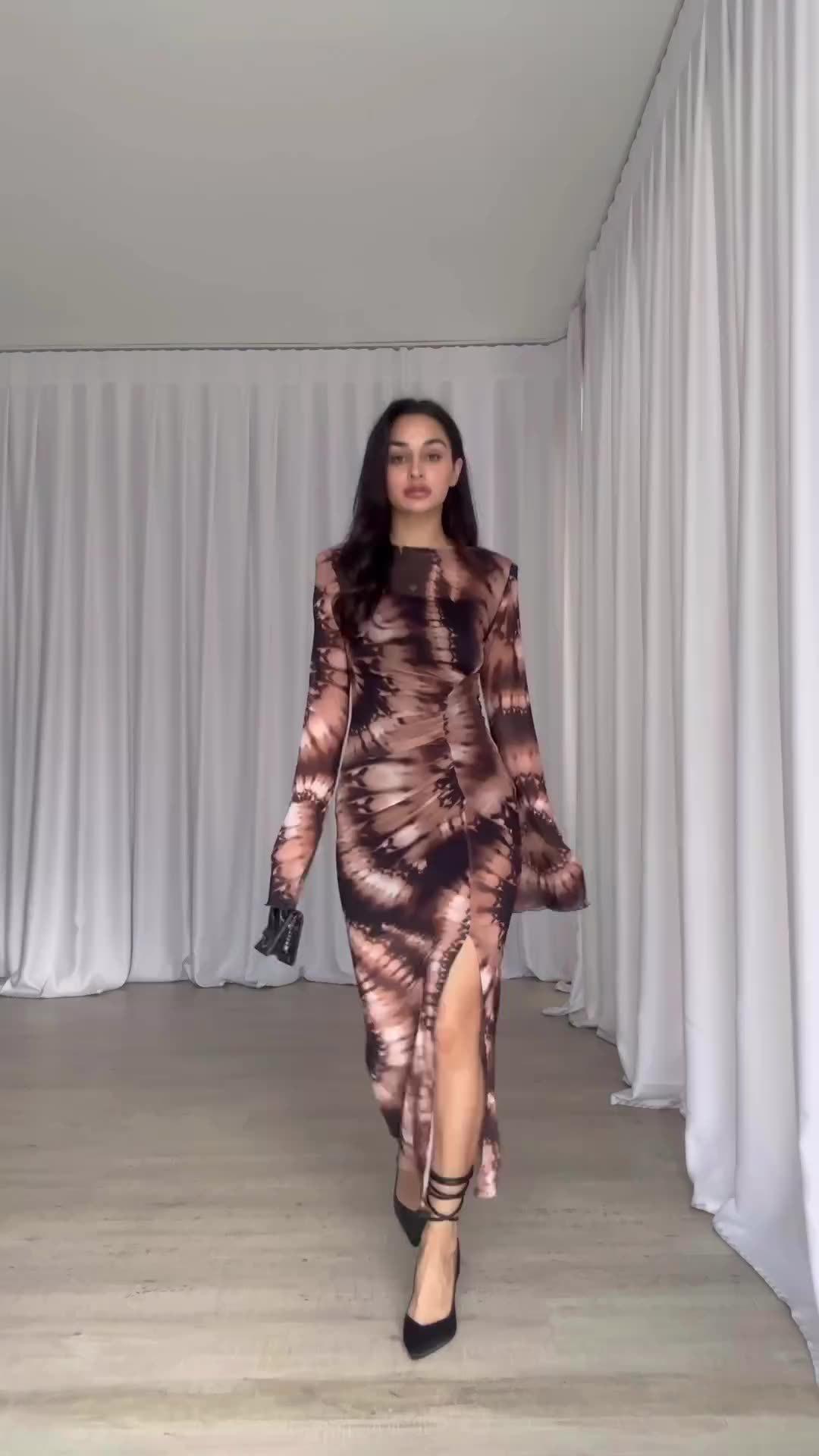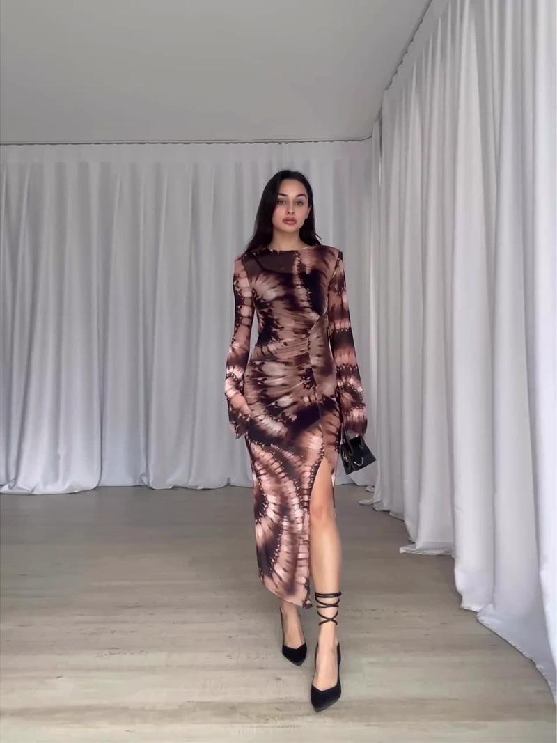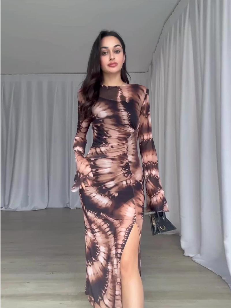 Vestido ajustado con abertura y manga larga plisado con estampado de leopardo de Amazon europeo y americano, otoño 2023