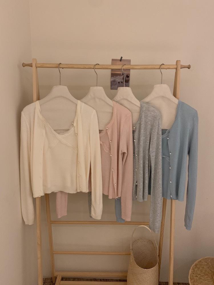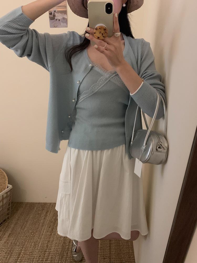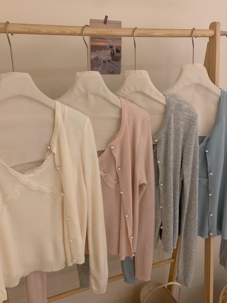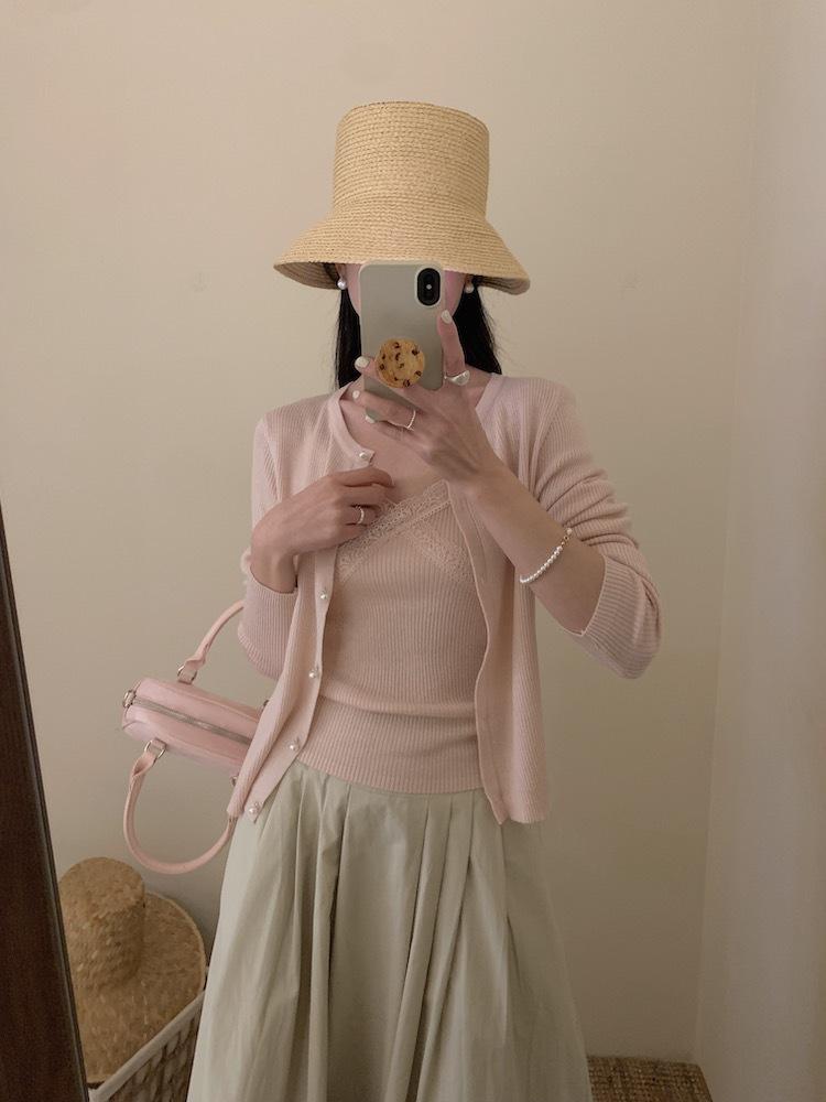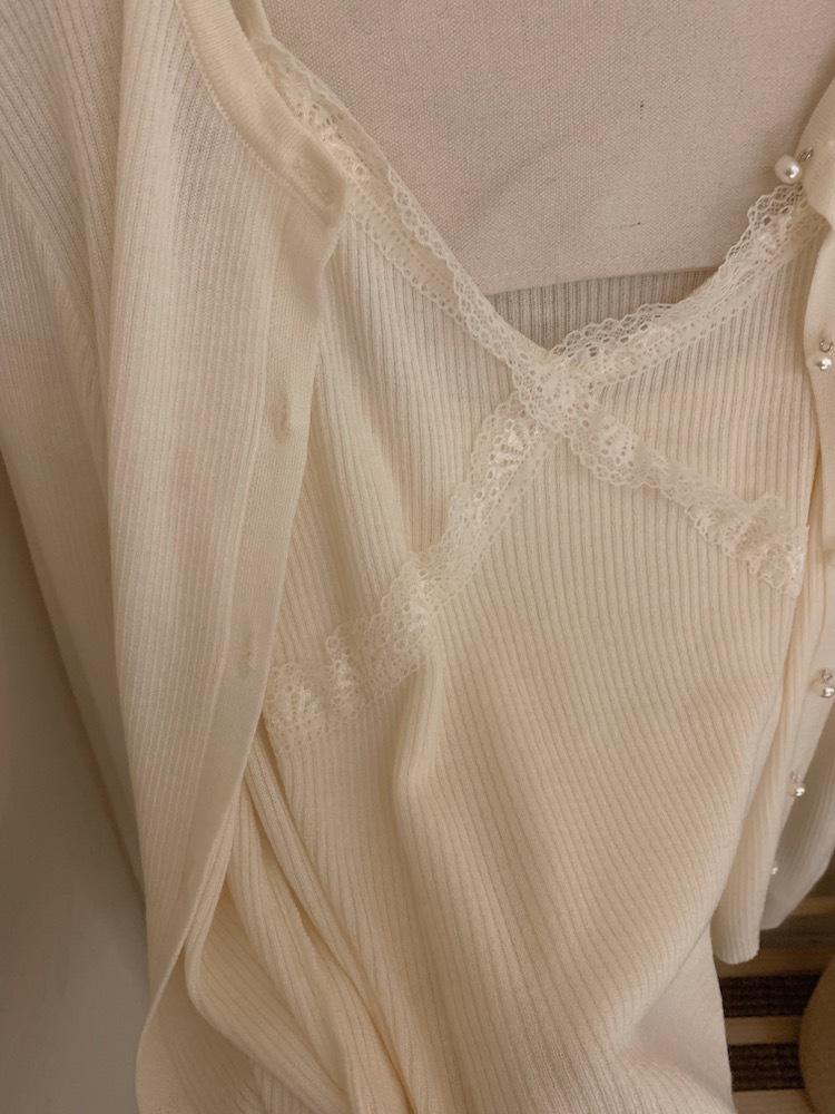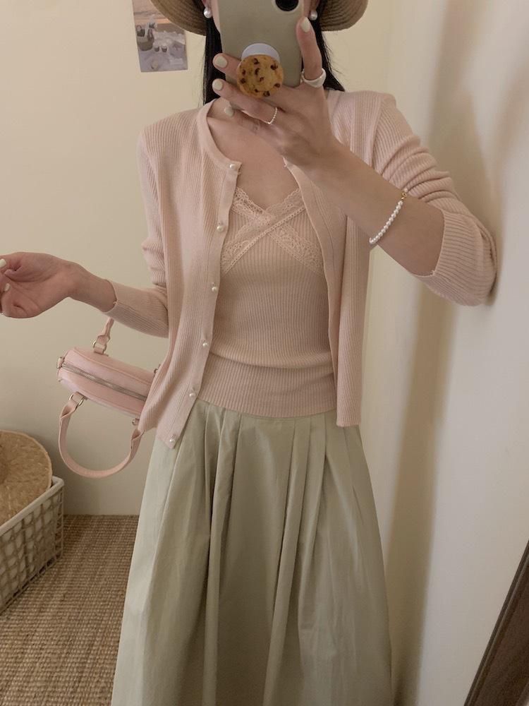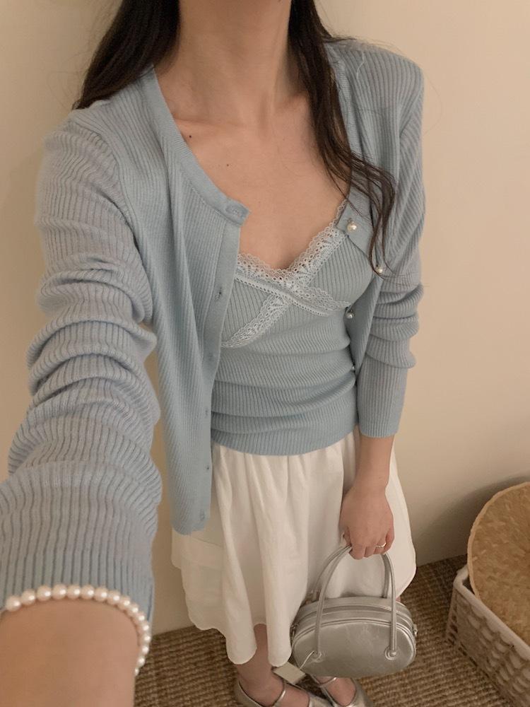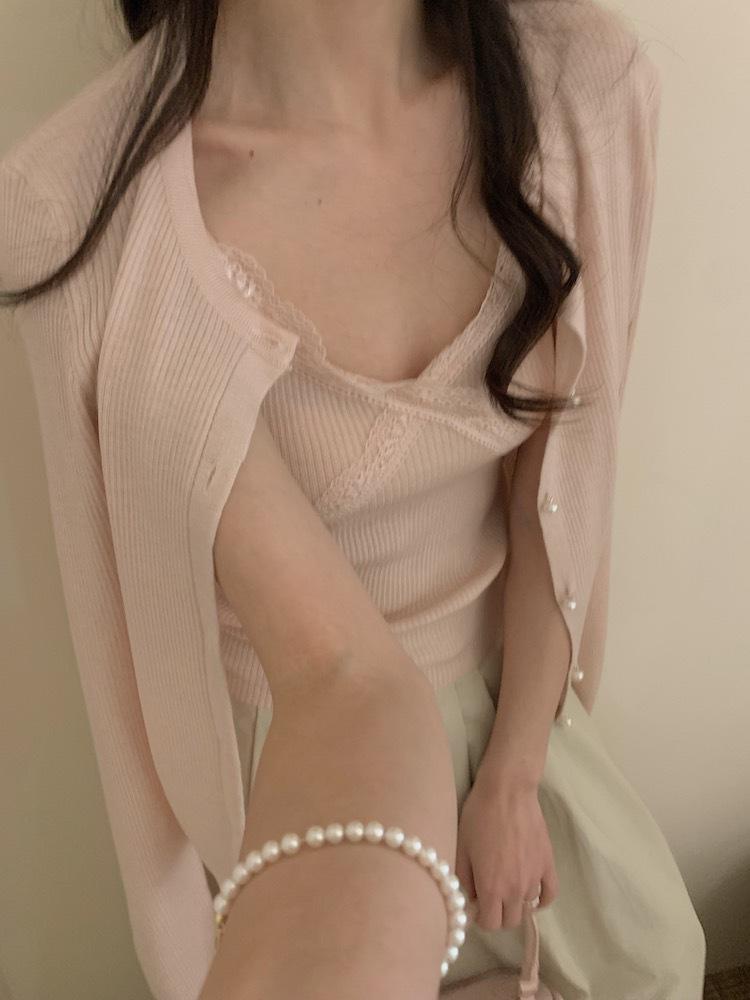 6003 # Traje Dulce y Picante Chaleco de Encaje con Tirantes para Mujer Cárdigan de Punto con Botones de Perla Chaqueta Corta Conjunto de Dos Piezas