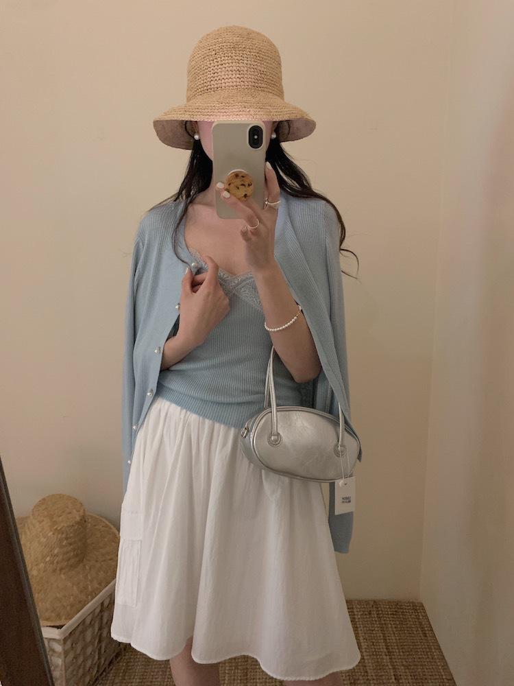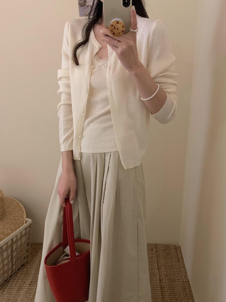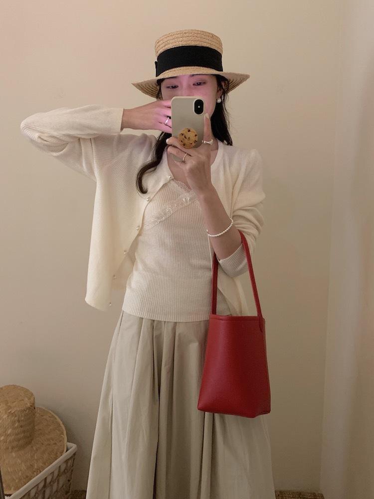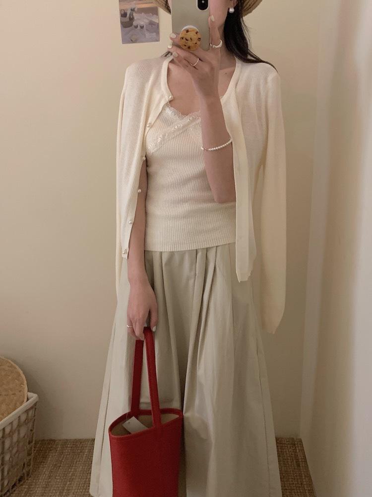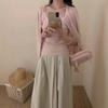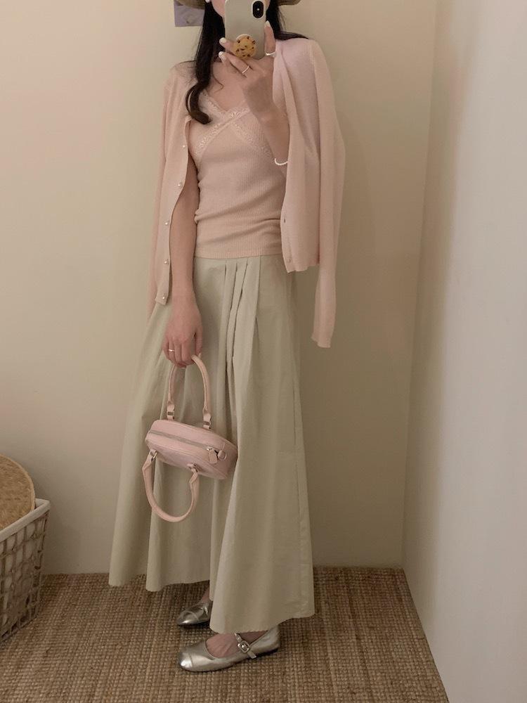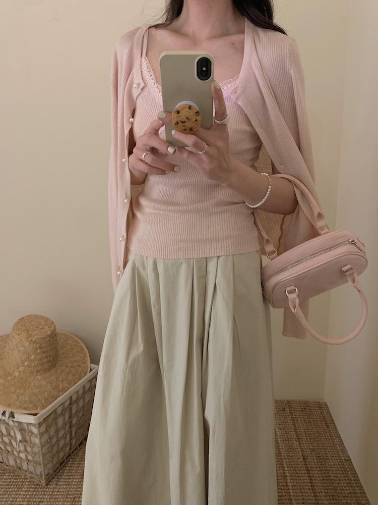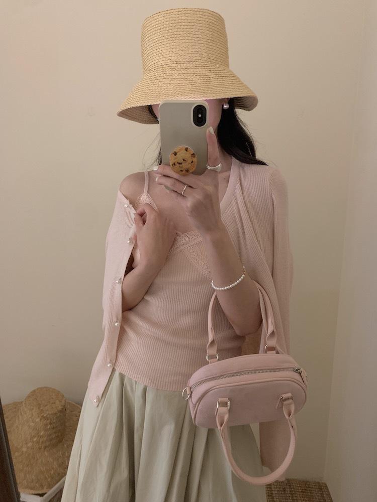 6003 # Traje Dulce y Picante Chaleco de Encaje con Tirantes para Mujer Cárdigan de Punto con Botones de Perla Chaqueta Corta Conjunto de Dos Piezas