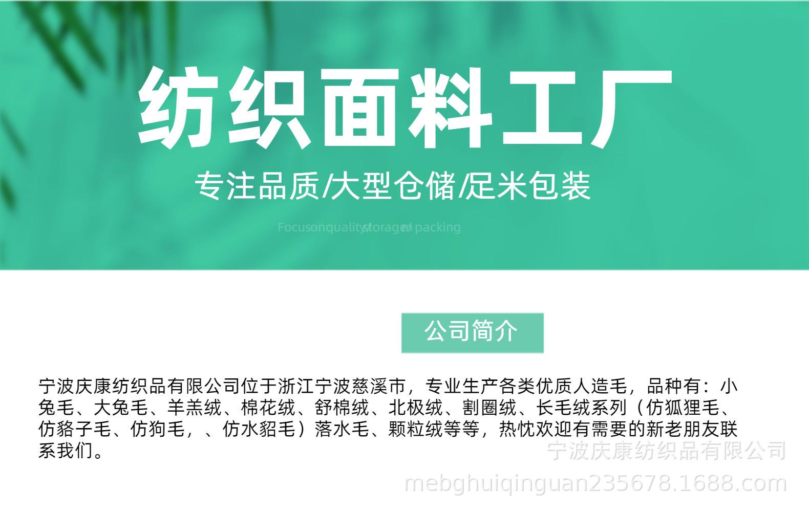 ③Características del producto y usos principales:El conejo grande producido por nuestra fábrica es suave y grueso, con una superficie de pelo completa y color uniforme. El pelo es brillante, no genera electricidad estática fácilmente, tiene buena transpirabilidad, es fácil de lavar, es verde y respetuoso con el medio ambiente, suave para la piel y no se desprende. El peso en gramos está entre 500g/m-2500g/m. El color se puede teñir según los requisitos del cliente y se puede teñir según los números de color Pantone. Es el producto más popular de nuestra fábrica y se utiliza principalmente para tejidos de confección, tejidos para juguetes, accesorios de tejido para zapatos y sombreros, tejidos para mantas y almohadas, tejidos para fundas de sofá, tejidos para bufandas y otros productos textiles para el hogar.