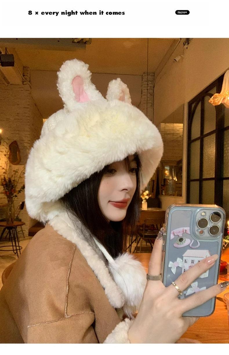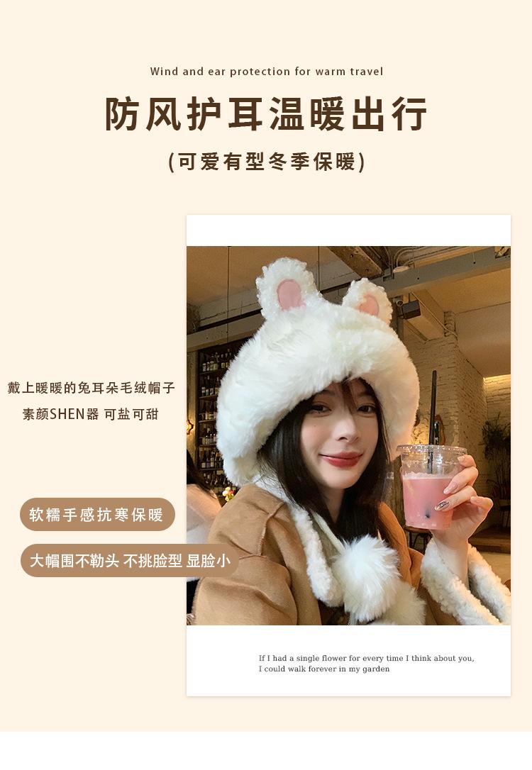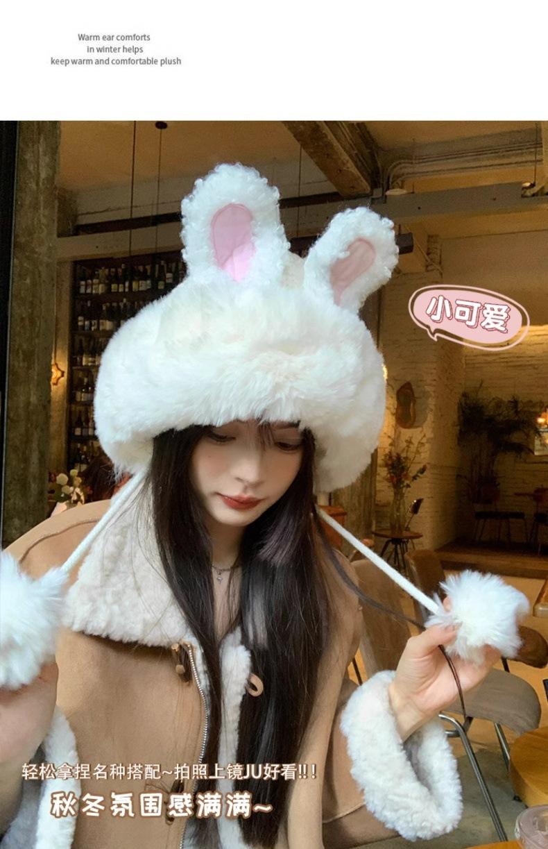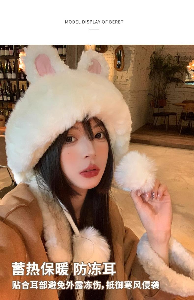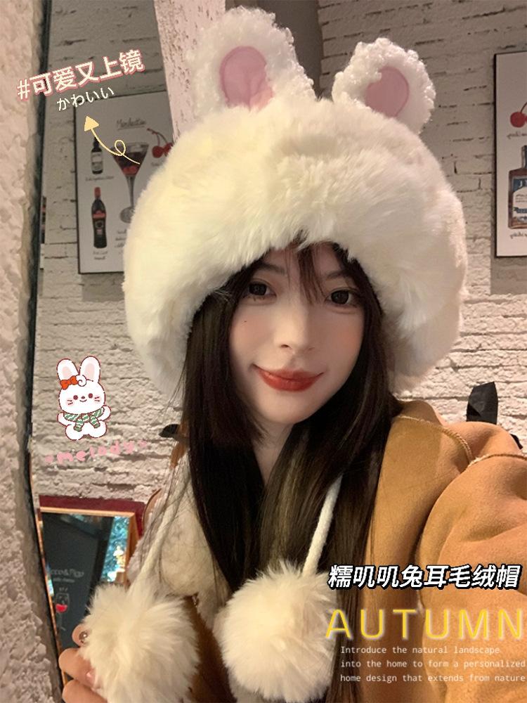 Gorro con orejas de conejo de peluche para mujer, cálido gorro de lana tejido para invierno, protección para los oídos, gorro pequeño con puntera para el frío.