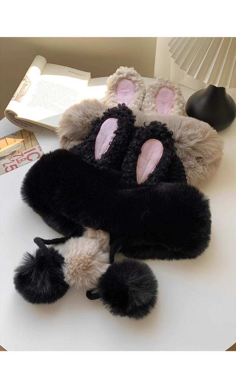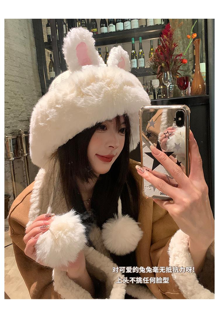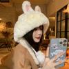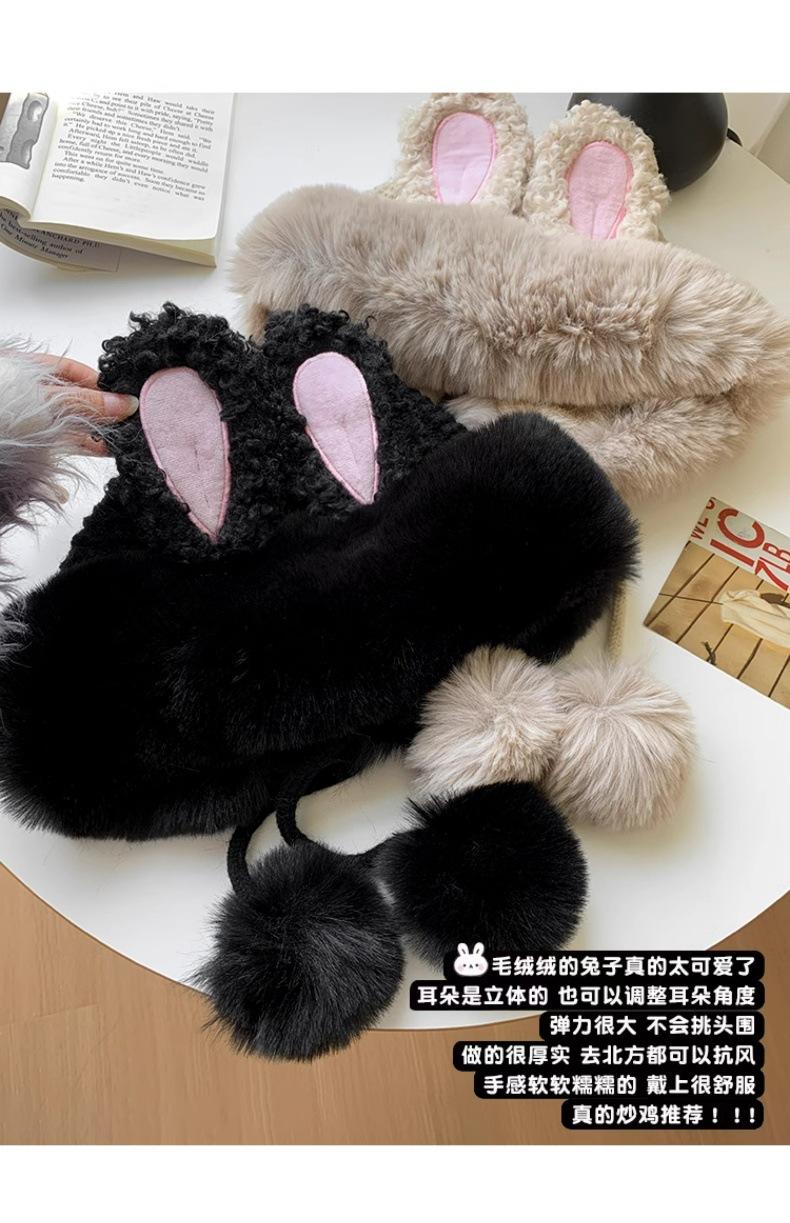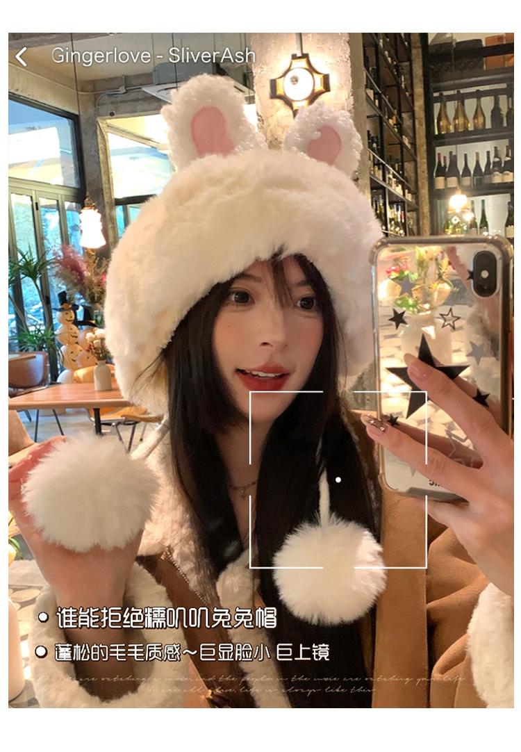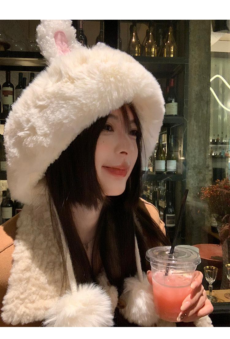 Gorro con orejas de conejo de peluche para mujer, cálido gorro de lana tejido para invierno, protección para los oídos, gorro pequeño con puntera para el frío.