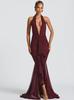 Halter, backless, bright silk, v neck, slit, silm