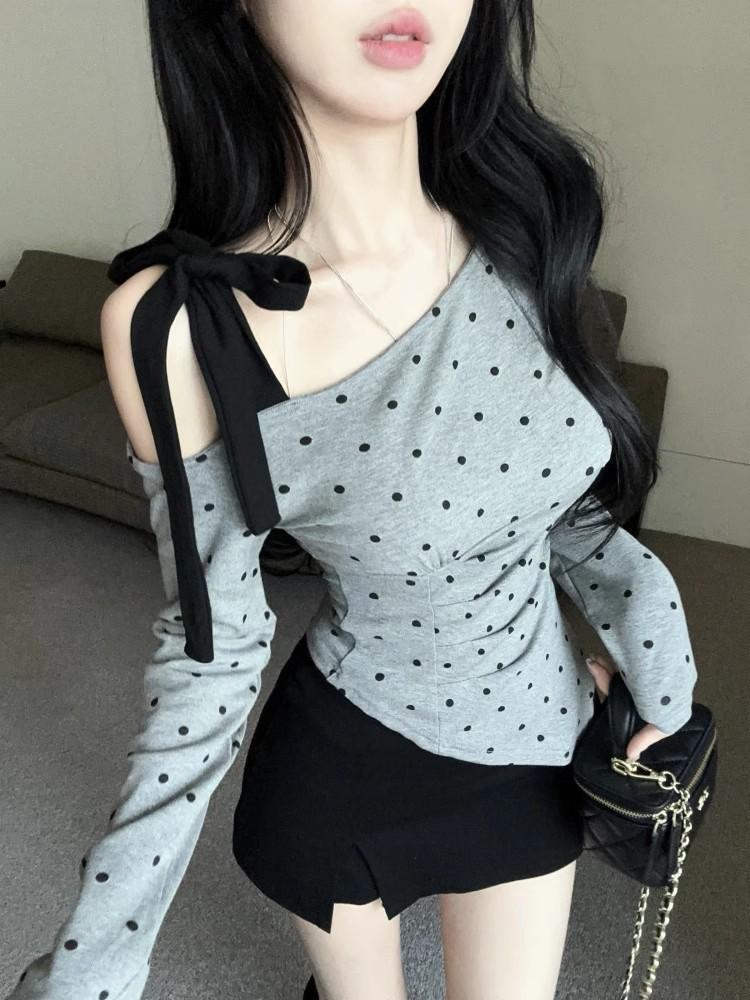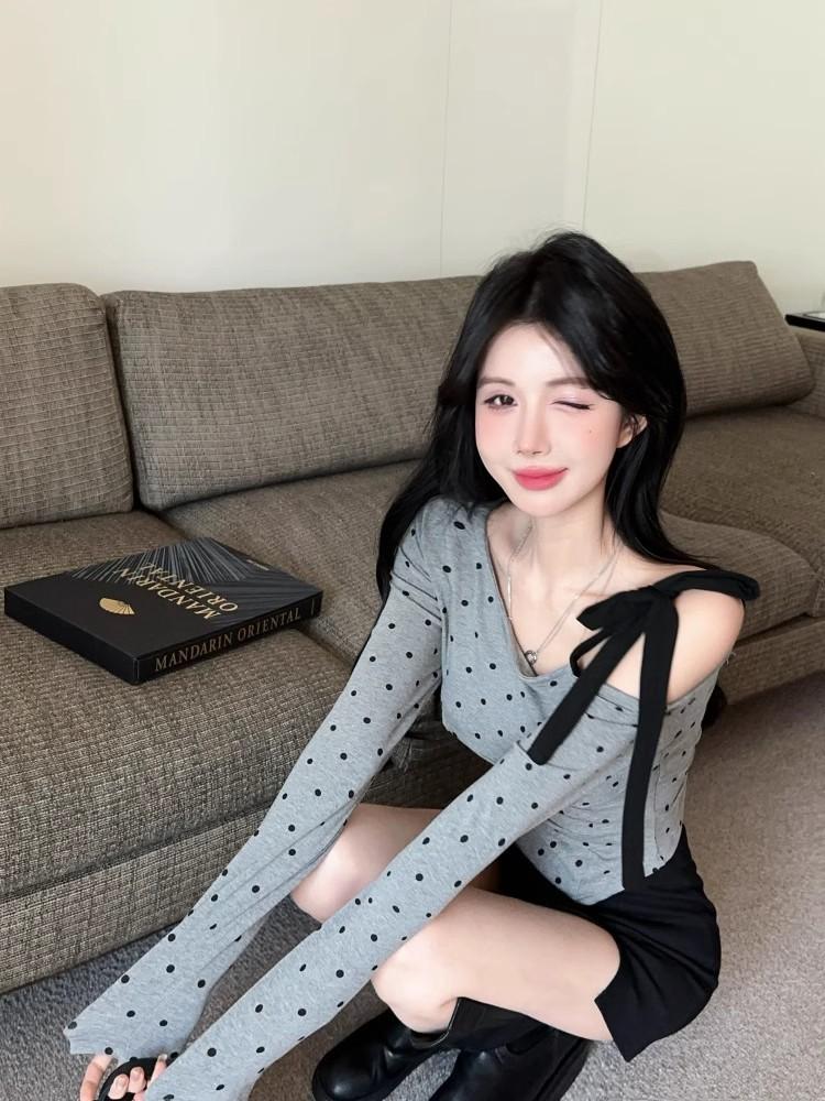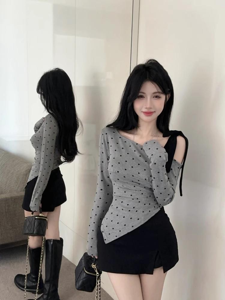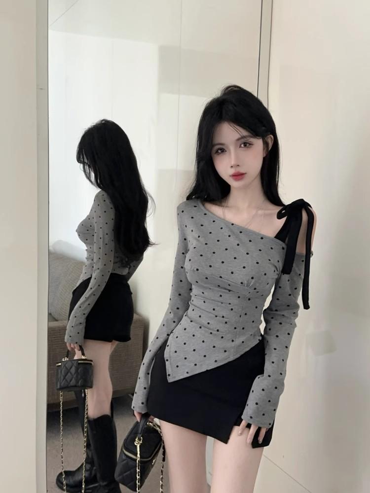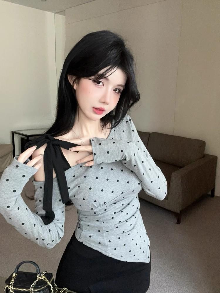 Camiseta de Manga Larga Irregular con Lunares Ondulados y Diseño de Sentido para Mujer con Tirantes y Lazo de Estilo Coreano que Reduce la Edad