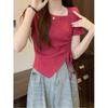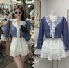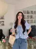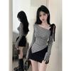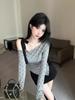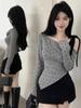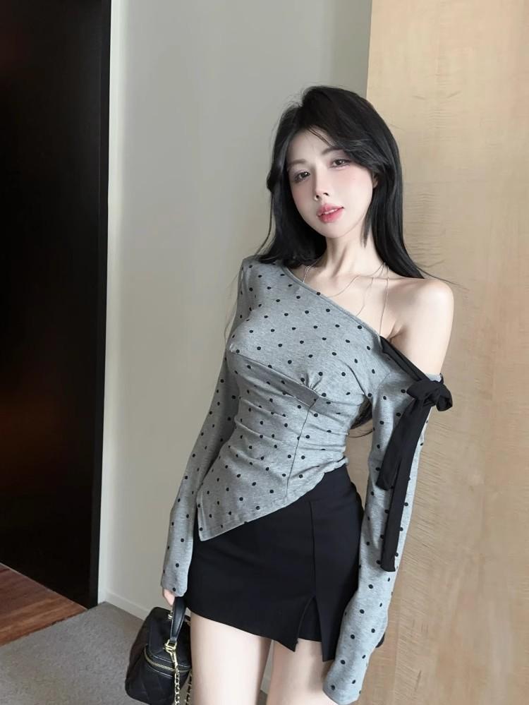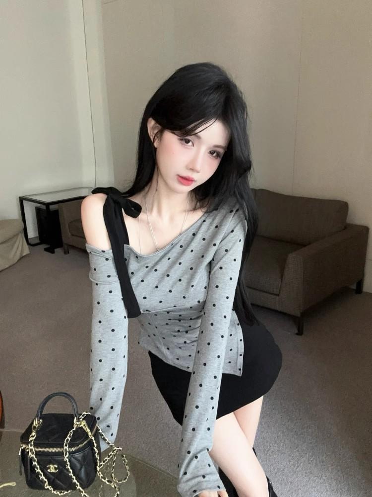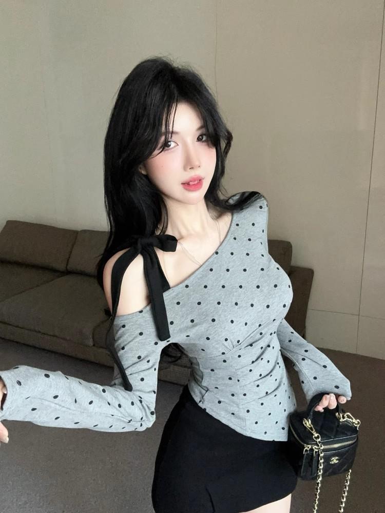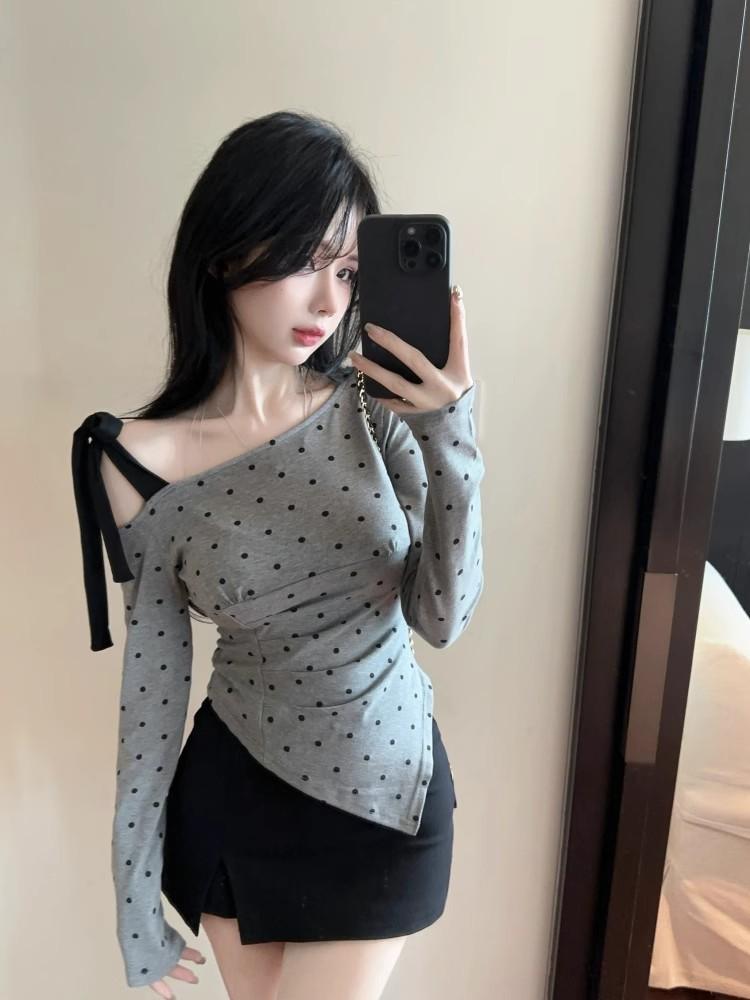 Camiseta de Manga Larga Irregular con Lunares Ondulados y Diseño de Sentido para Mujer con Tirantes y Lazo de Estilo Coreano que Reduce la Edad