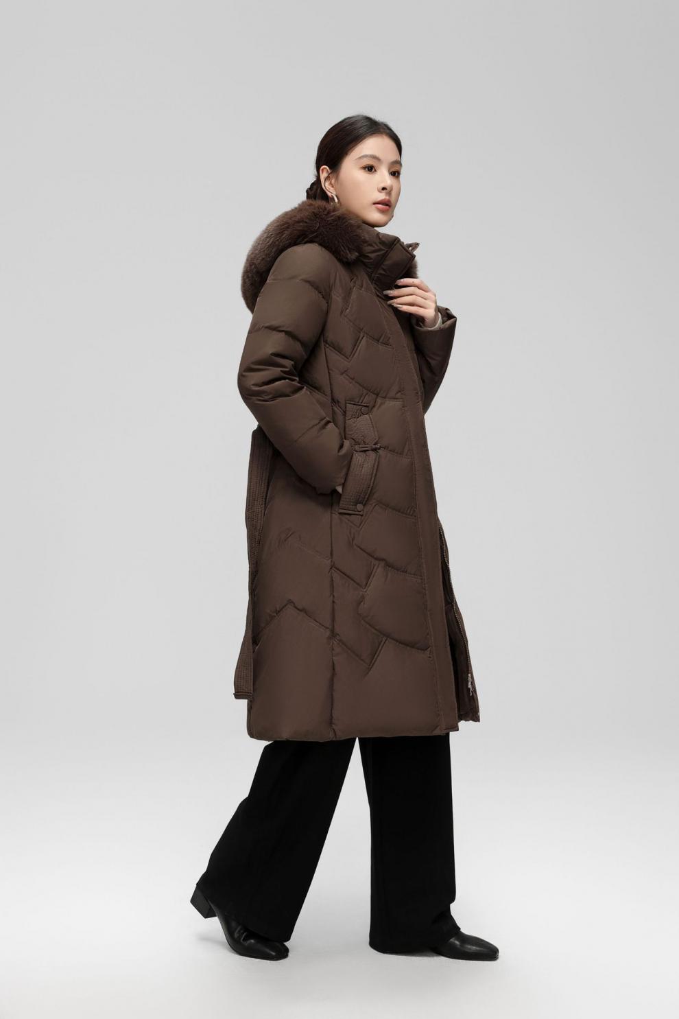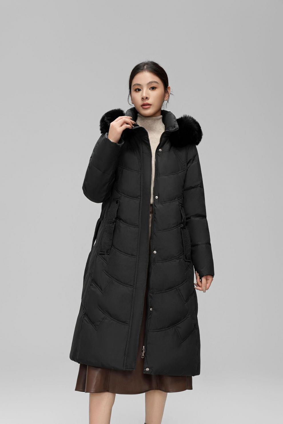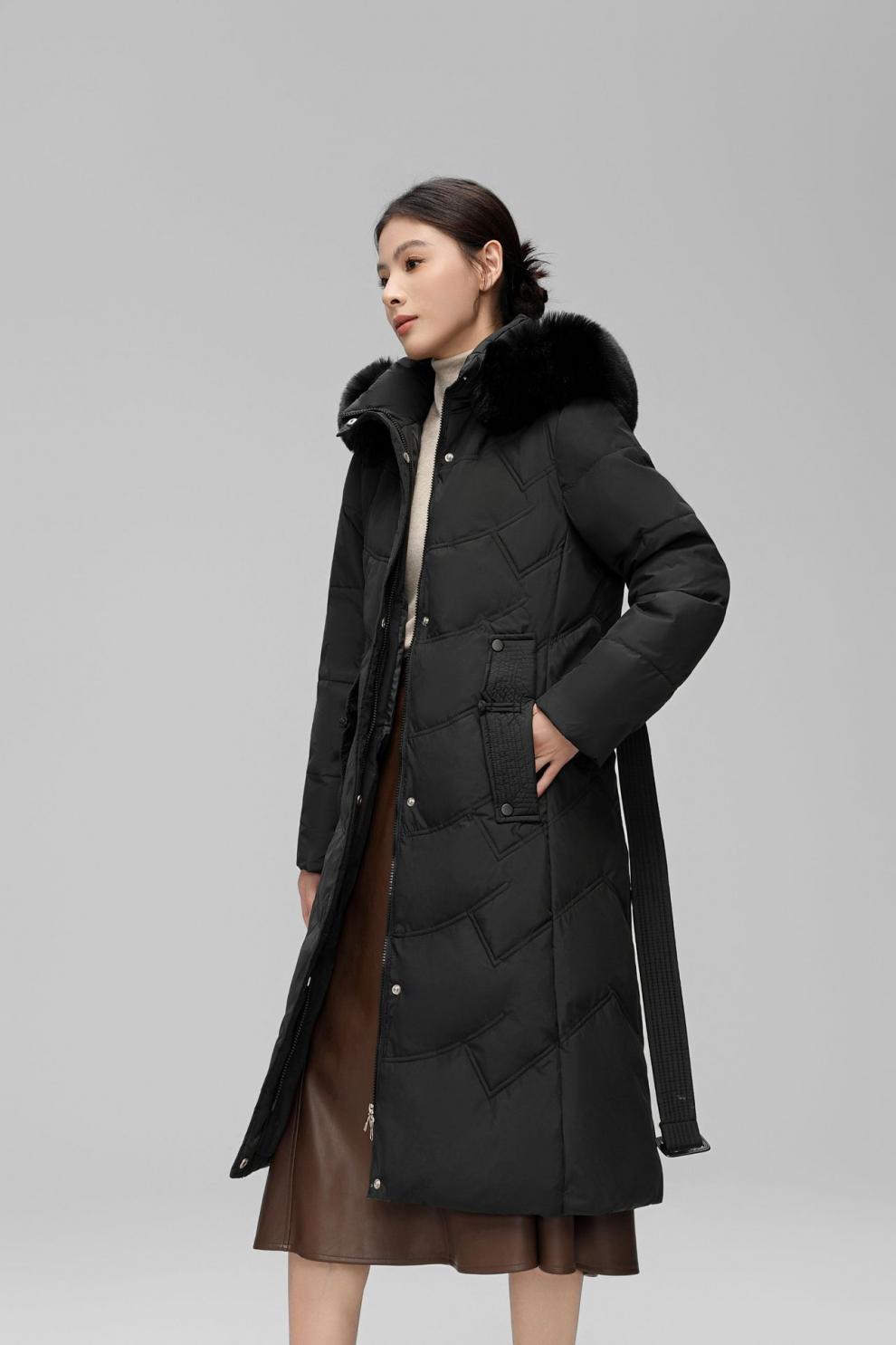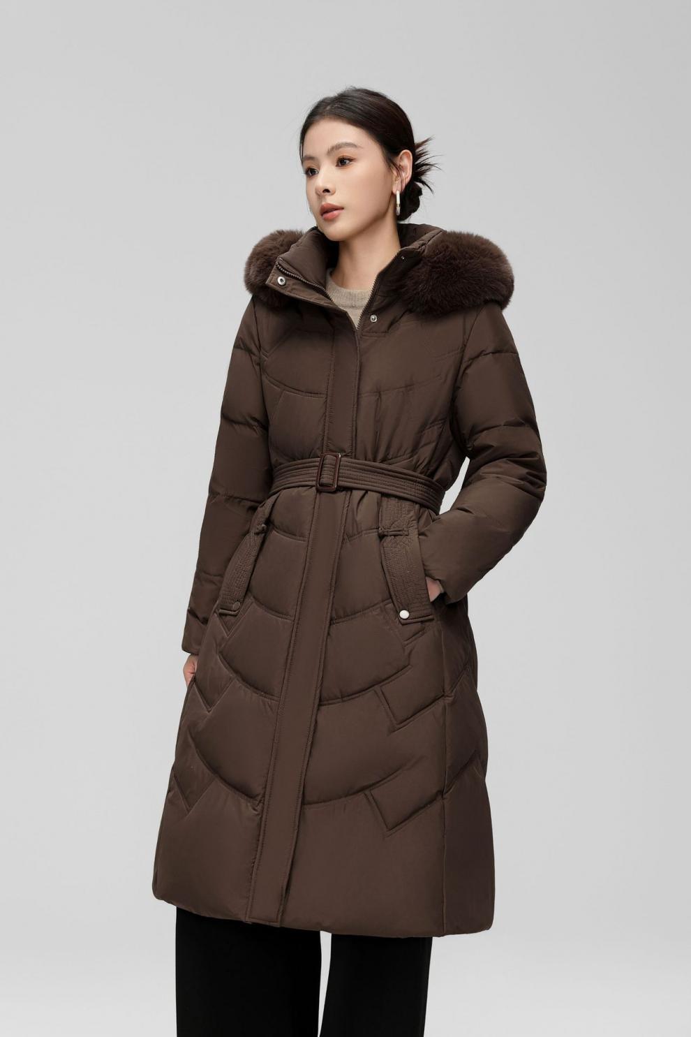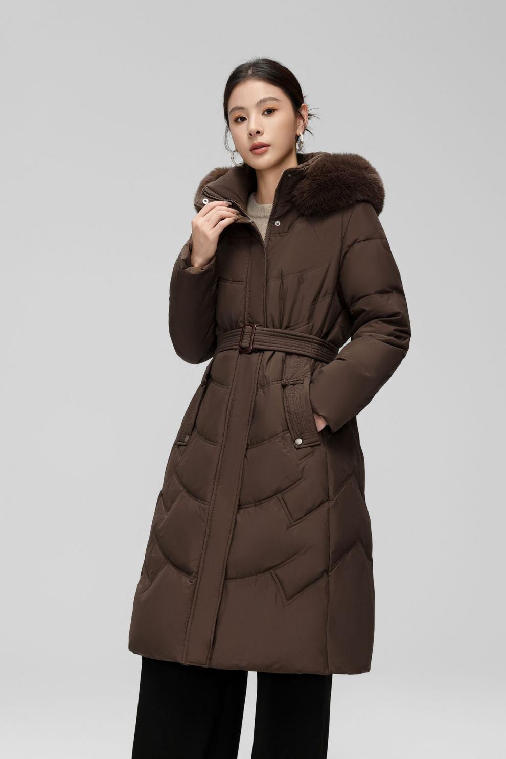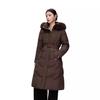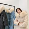 Chaqueta de plumón de comercio exterior para mujer, de longitud media hasta la rodilla, con cuello de piel grande, cintura ajustada, plumón de pato blanco, nuevo abrigo de invierno 2024