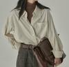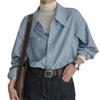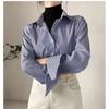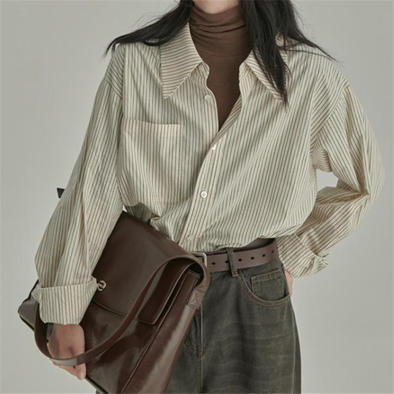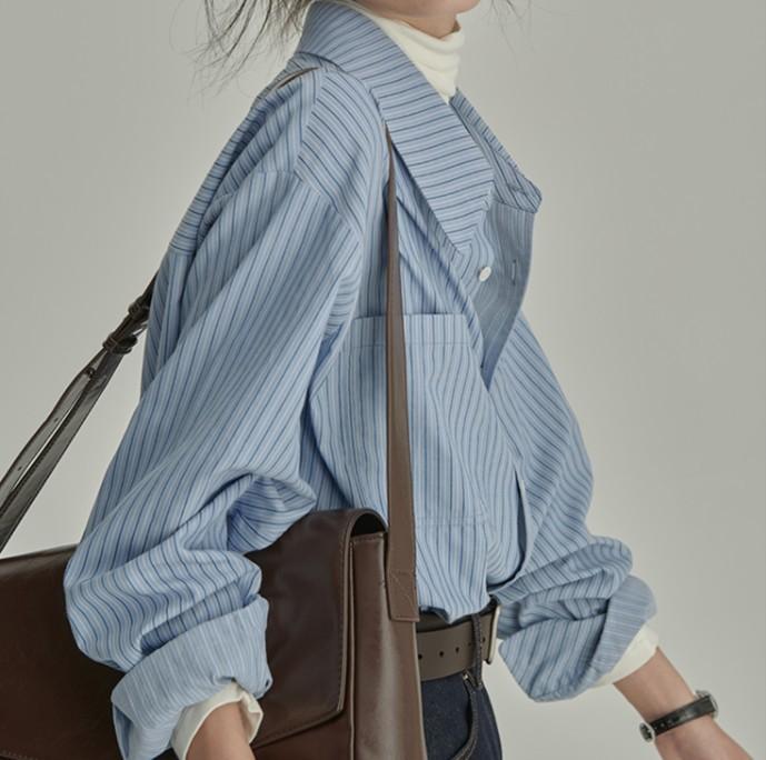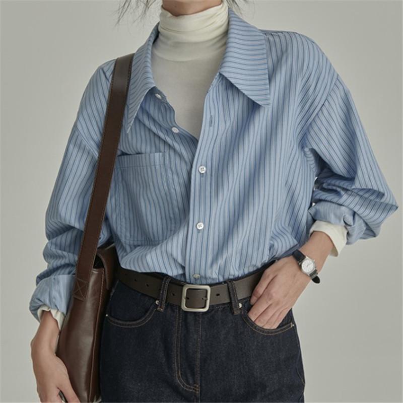 Camisa de Rayas Verticales Azules de Primavera y Otoño para Mujer de Manga Larga en Capas 2025 Nuevo Diseño Nicho Retro Camisa Base