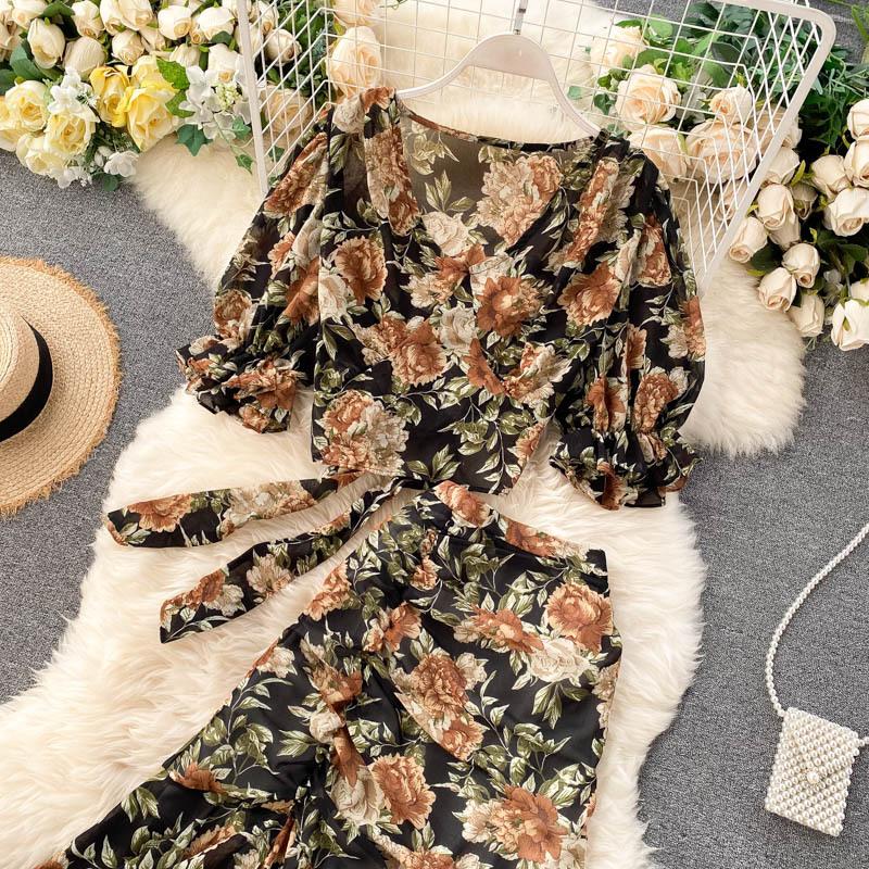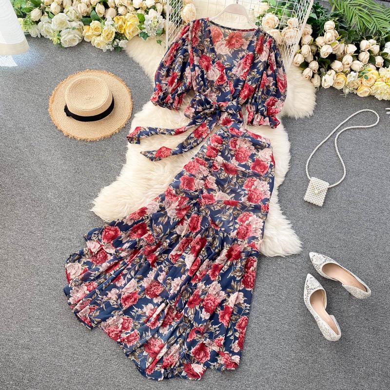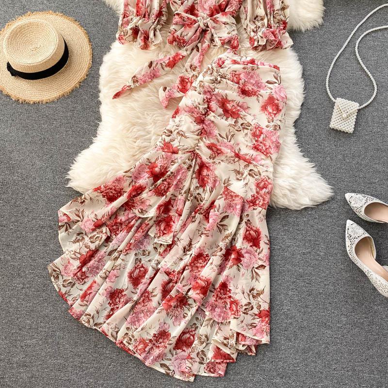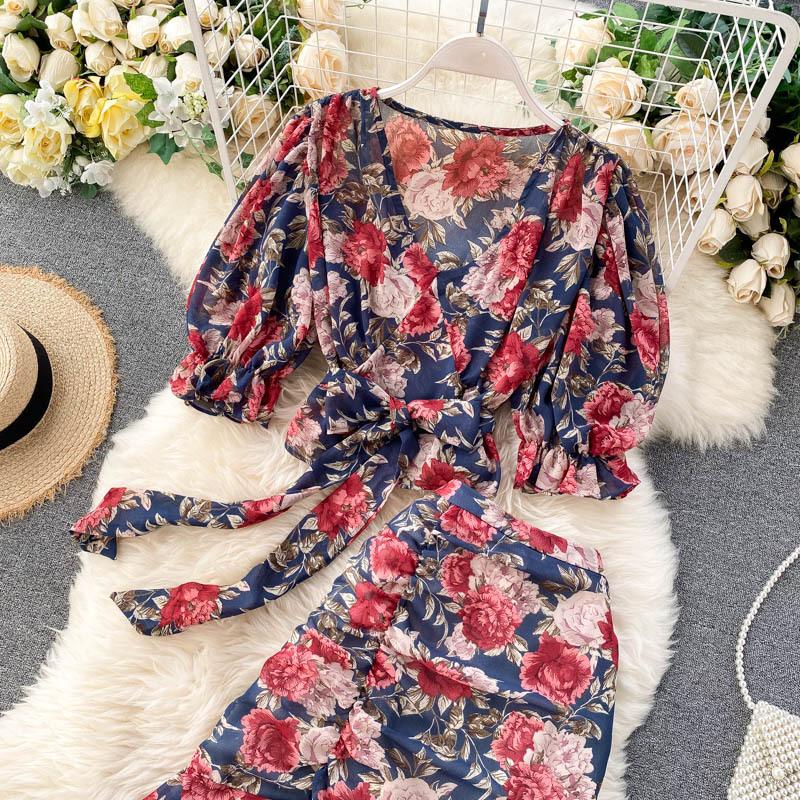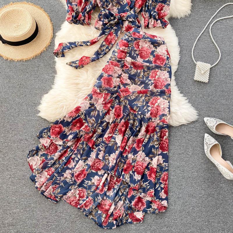 Traje de dos piezas estilo festivo 2020, nuevo, para mujer, con camisa de gasa de tirantes cortos y falda de cola de pez sexy y femenina.