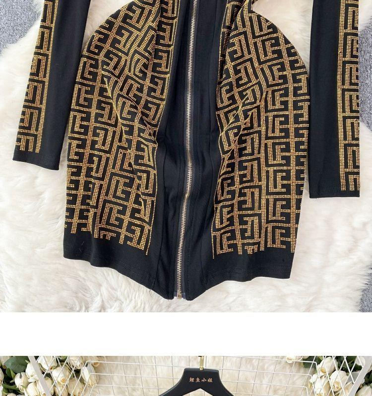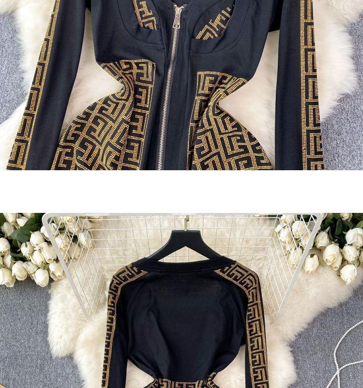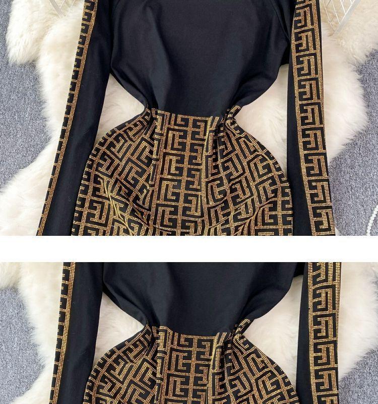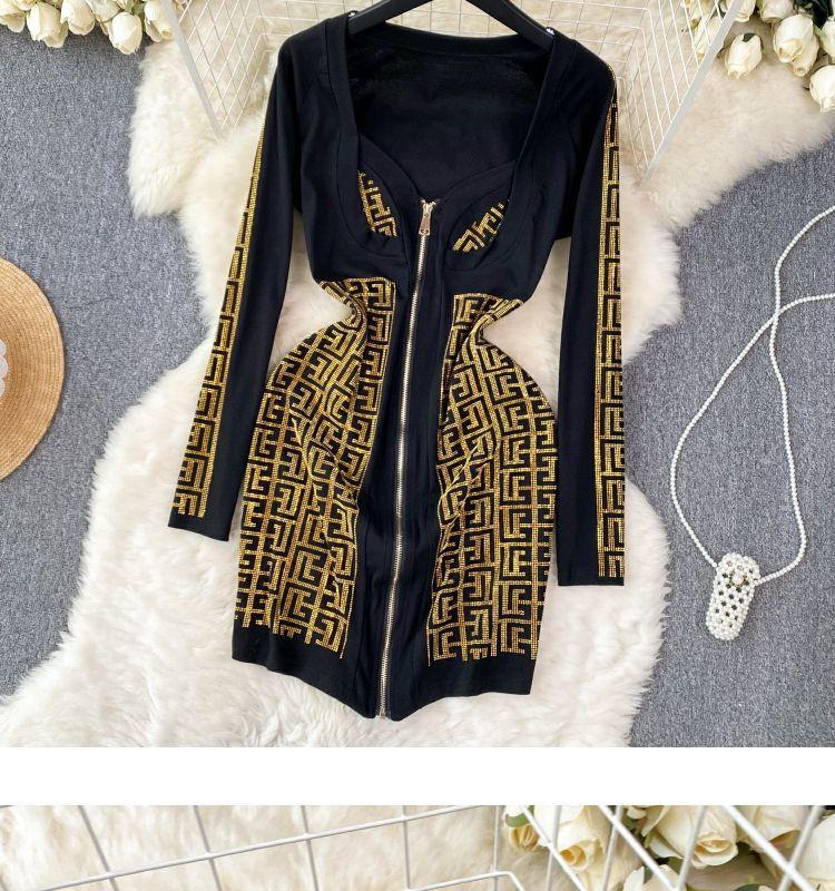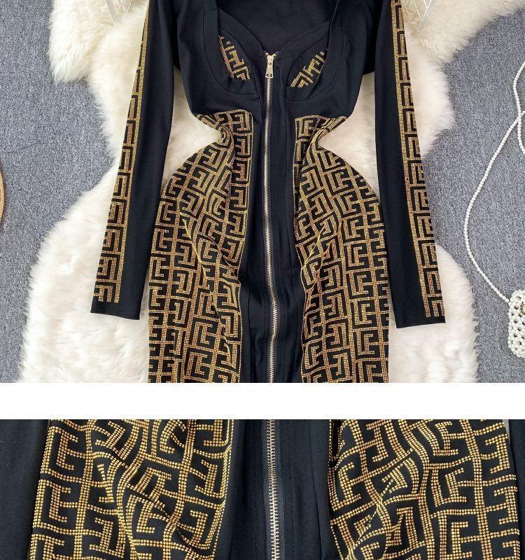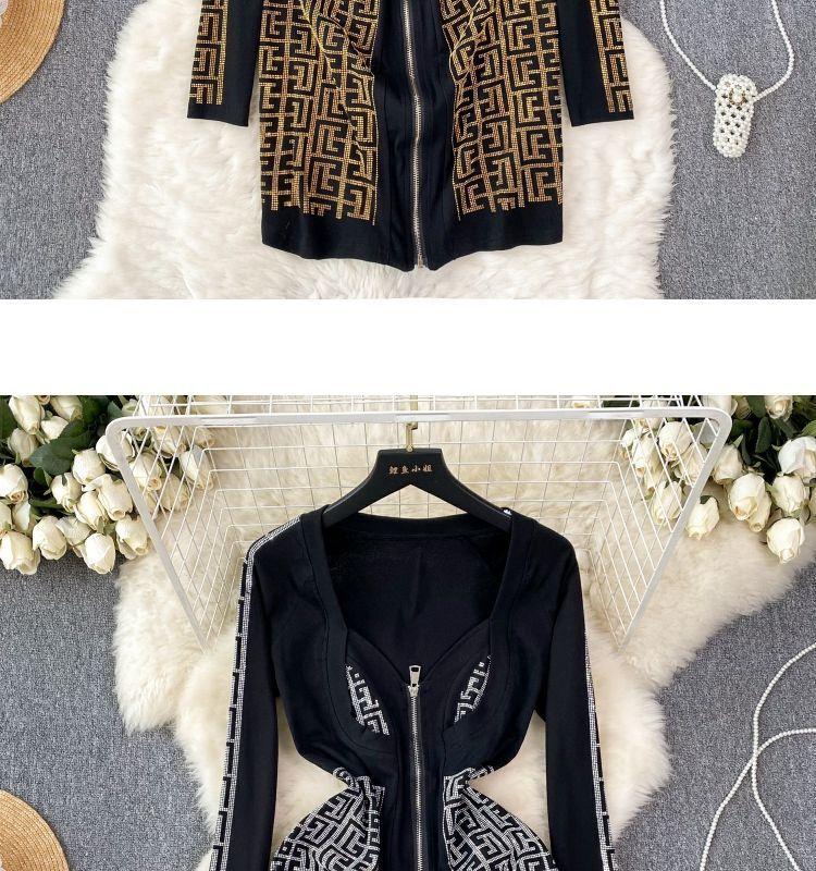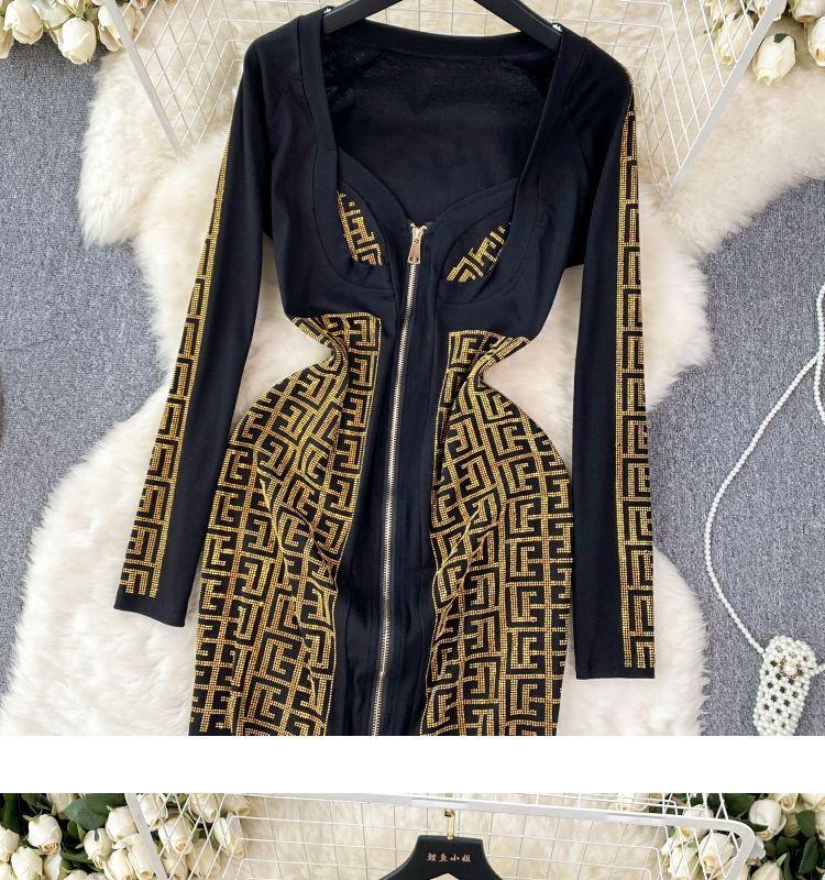 Vestido tubo Yujie ligero, familiar, elegante, de trabajo pesado, con patrón geométrico de diamantes de imitación, corte bajo, cremallera, manga larga, ajustado y adelgazante