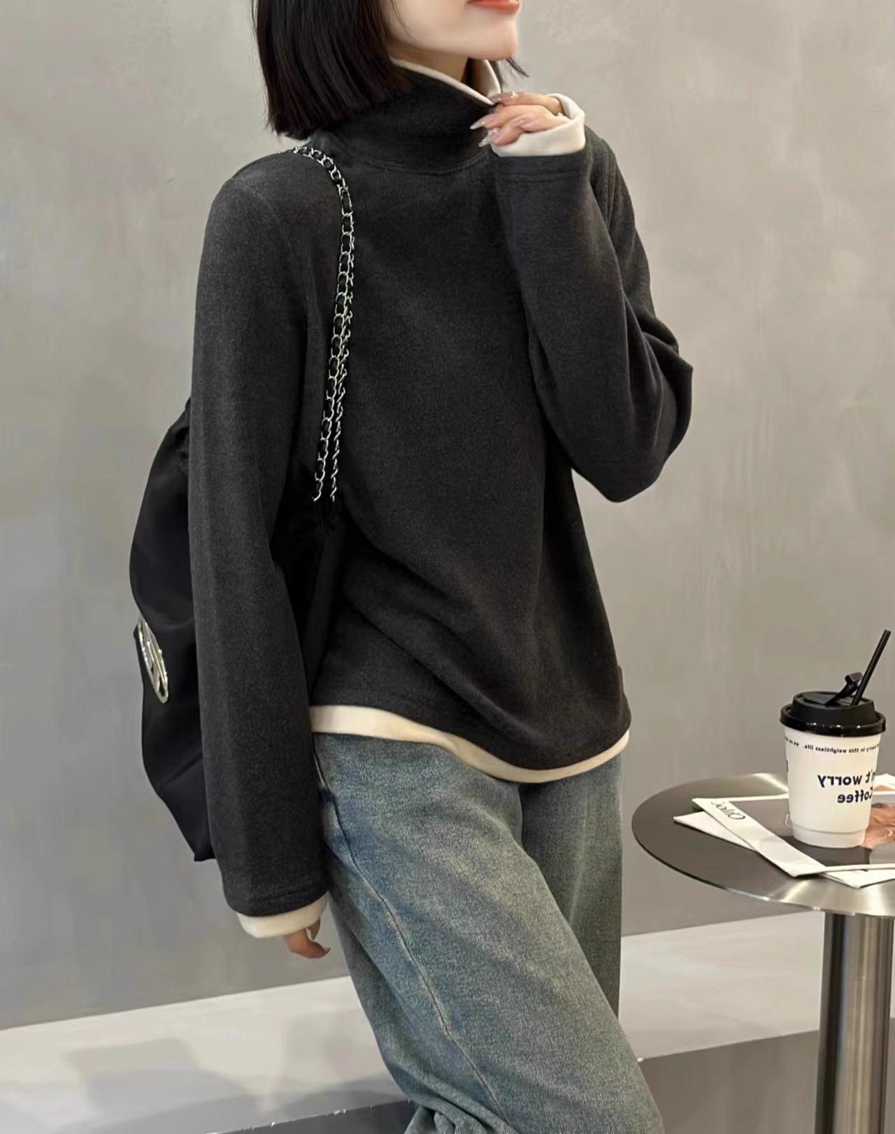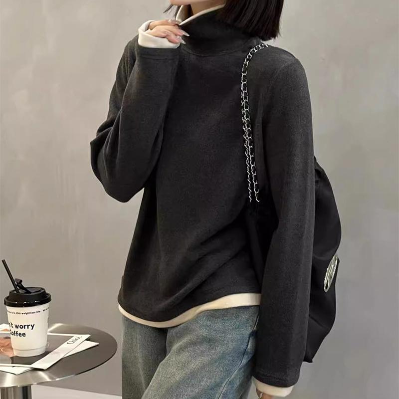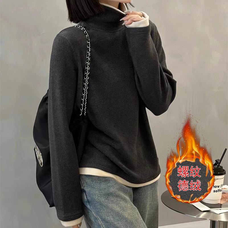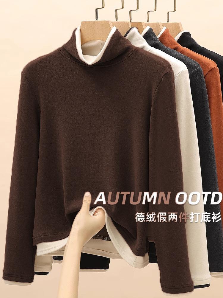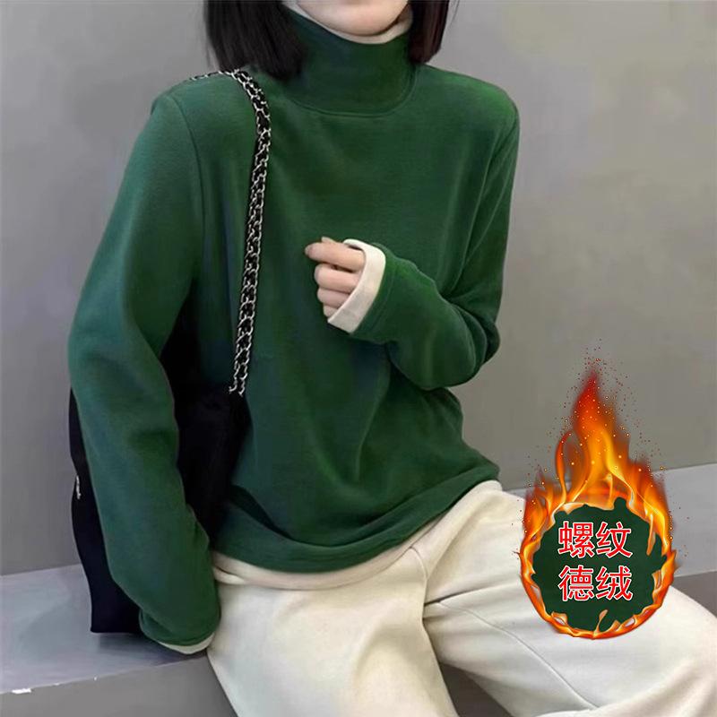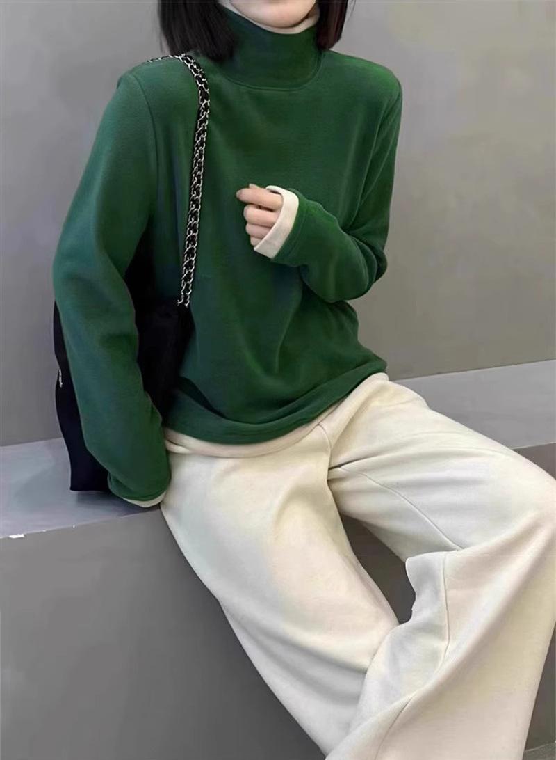 Camiseta básica de manga larga de terciopelo de hilo de 280 g verde blanco otoño e invierno nuevo estilo extranjero reducción de edad falso dos moda de mujer