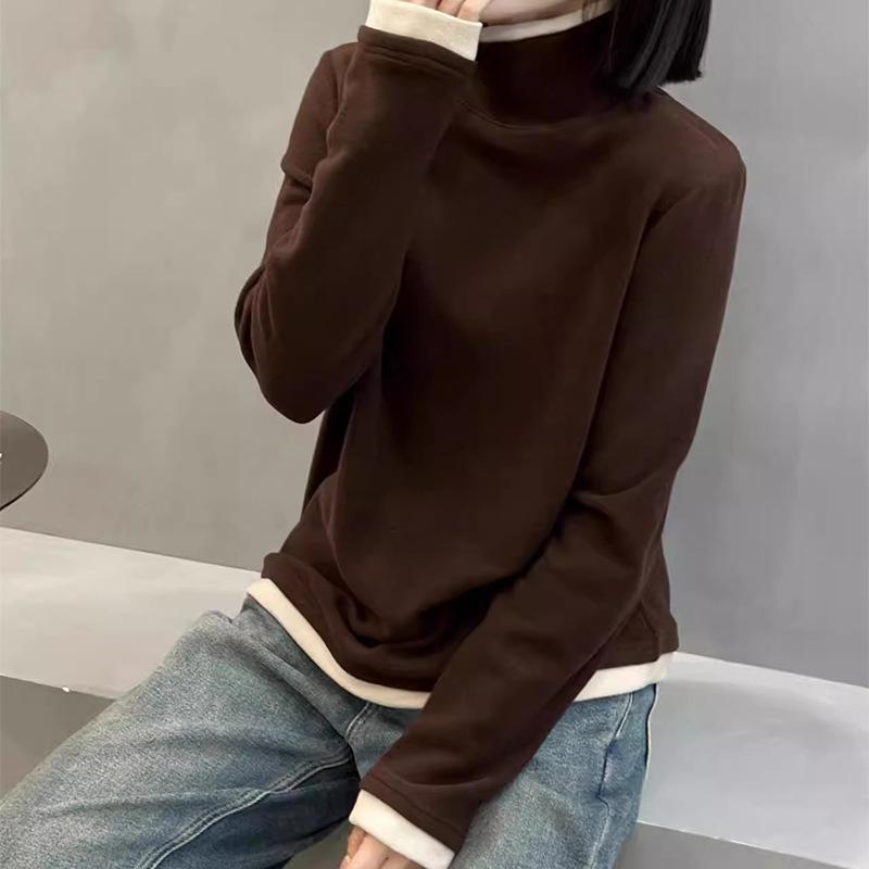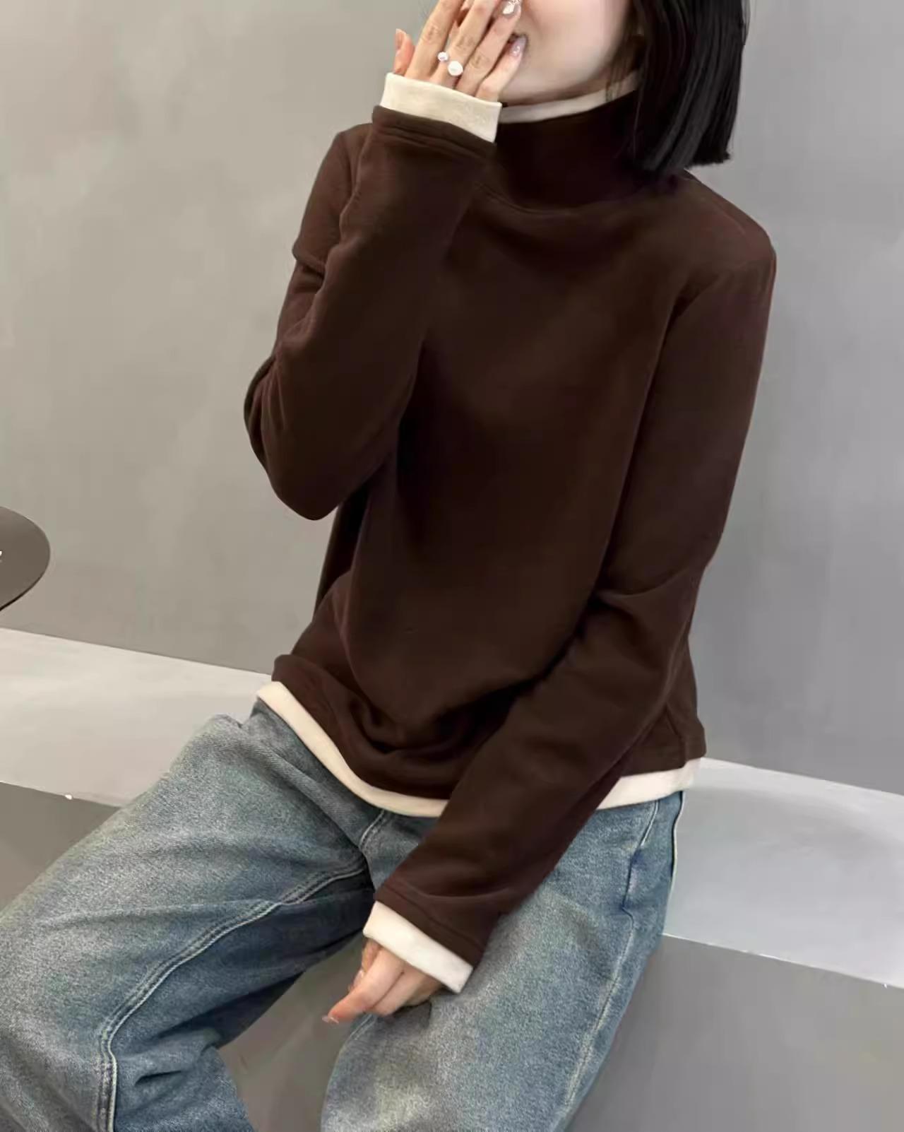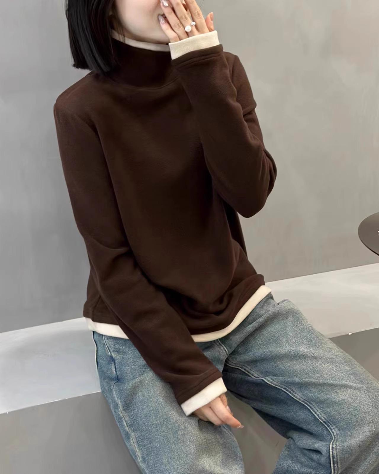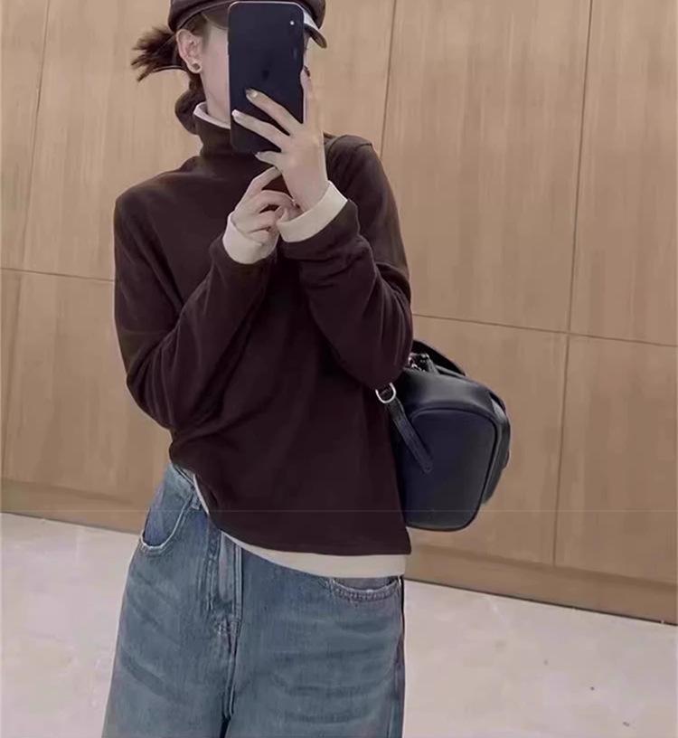 Camiseta básica de manga larga de terciopelo de hilo de 280 g verde blanco otoño e invierno nuevo estilo extranjero reducción de edad falso dos moda de mujer