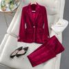 Traje de Terciopelo Dorado para Mujer de Dos Piezas Rojo Traje Profesional para Reunión Anual Estilo Micro-Laku Elegante Moda Terciopelo de Pana