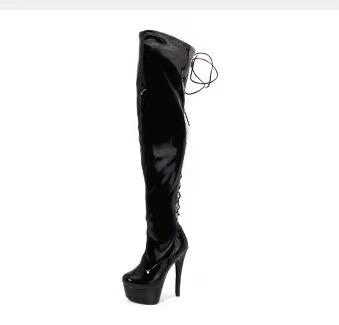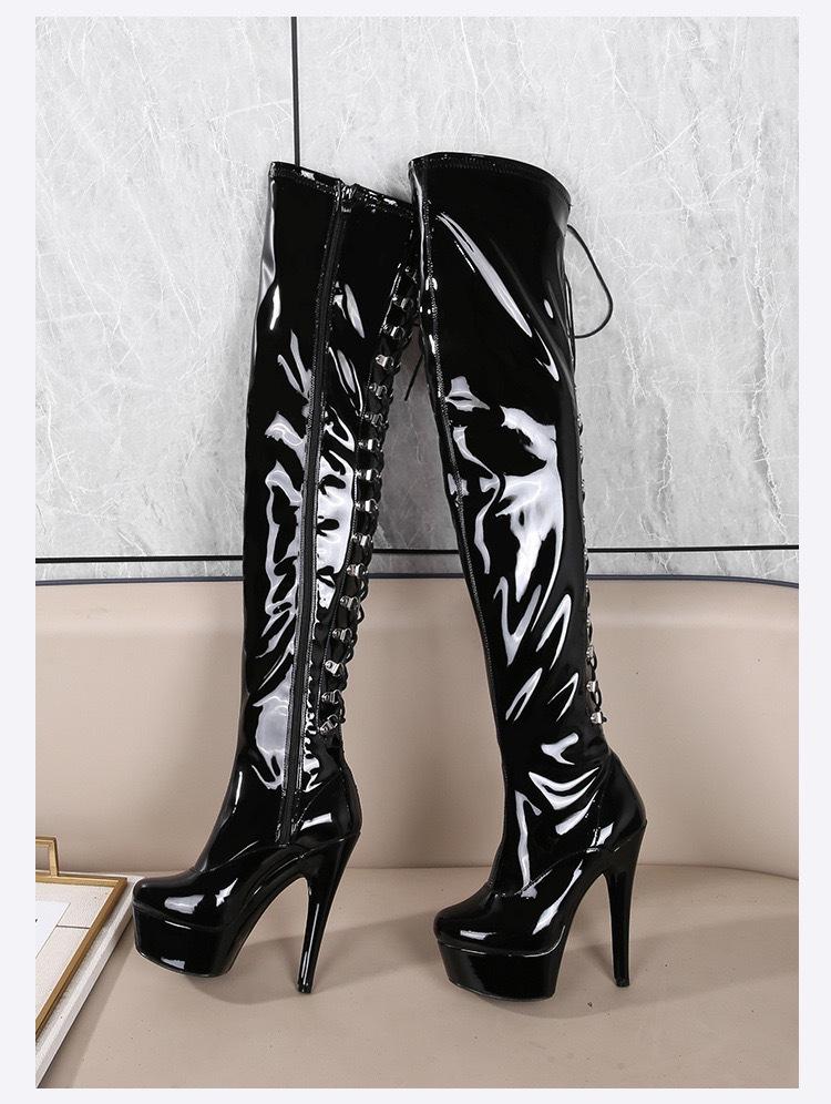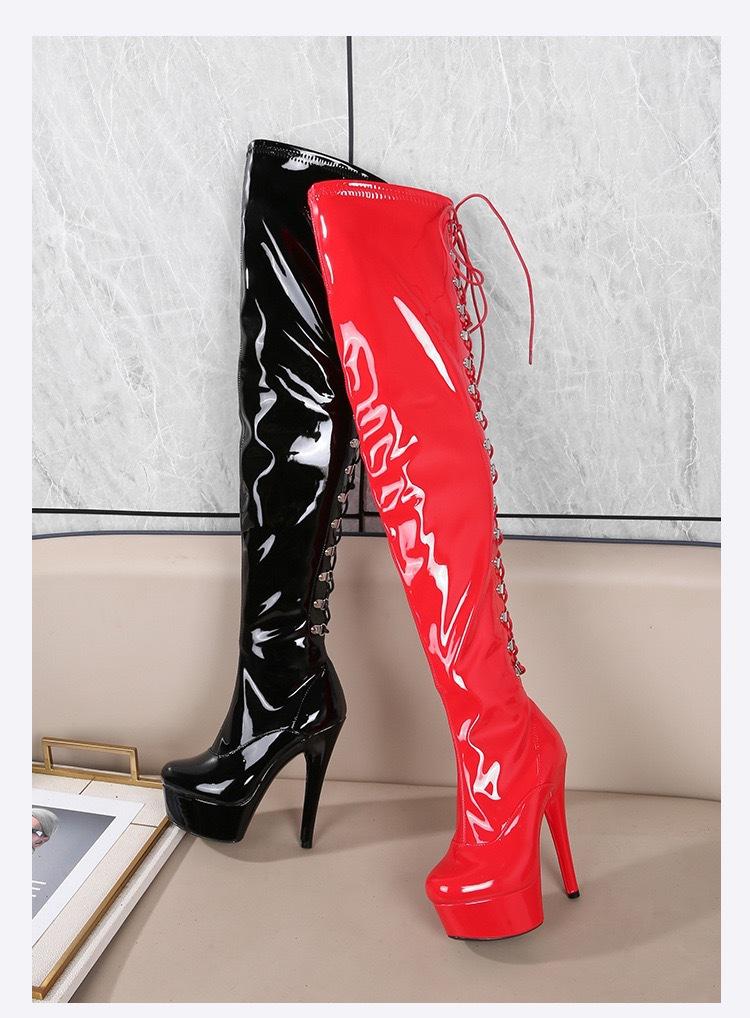 Botas de baile de tubo de acero de 15 cm, punta redonda y caña alta, en stock, tacón fino adhesivo, botas de moda de tacón súper alto, cuero patentado, entrega rápida, sexy