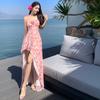 Vestido largo estilo francés sexy con cuello colgante para mujer, para vacaciones en la playa, verano, espalda descubierta, con falda floral