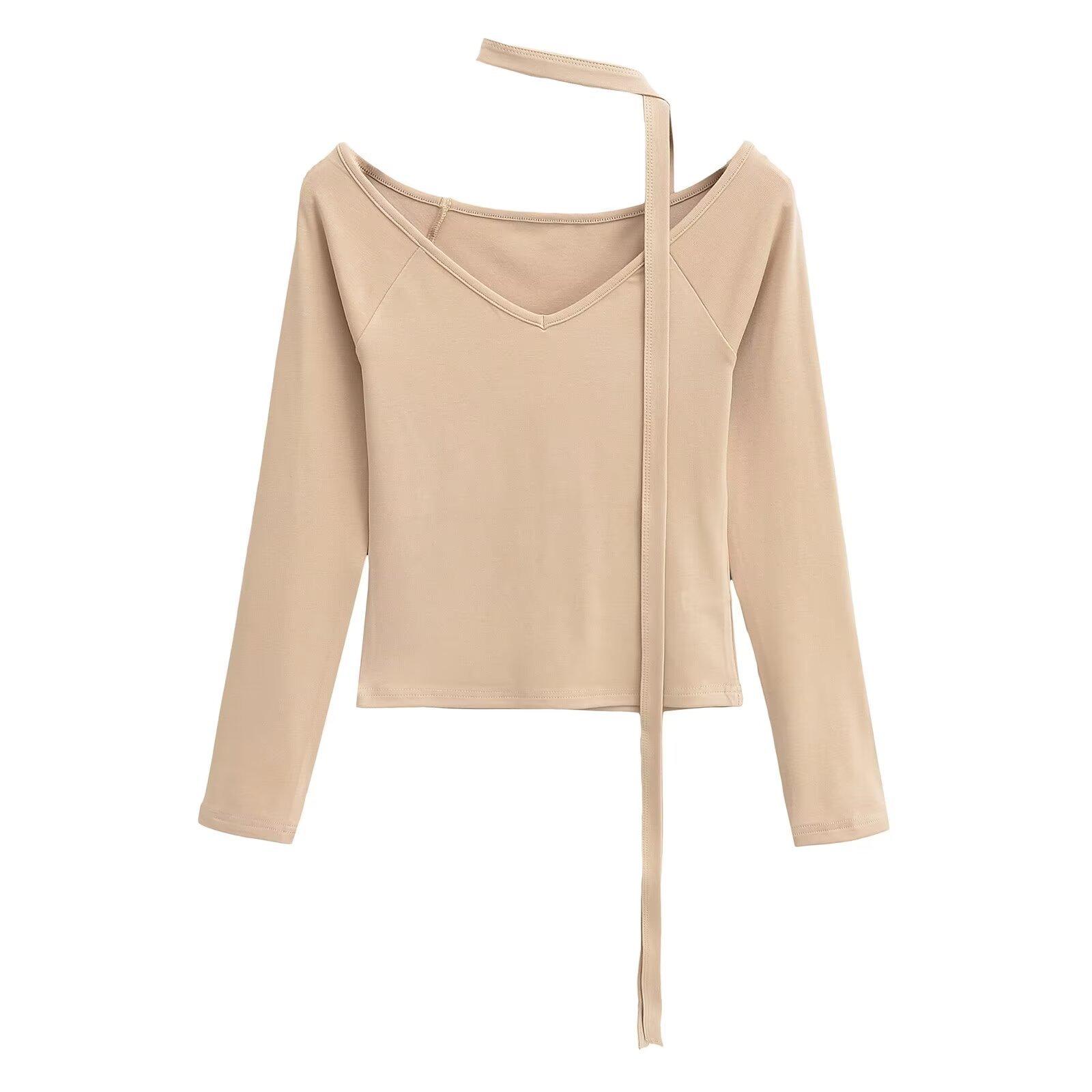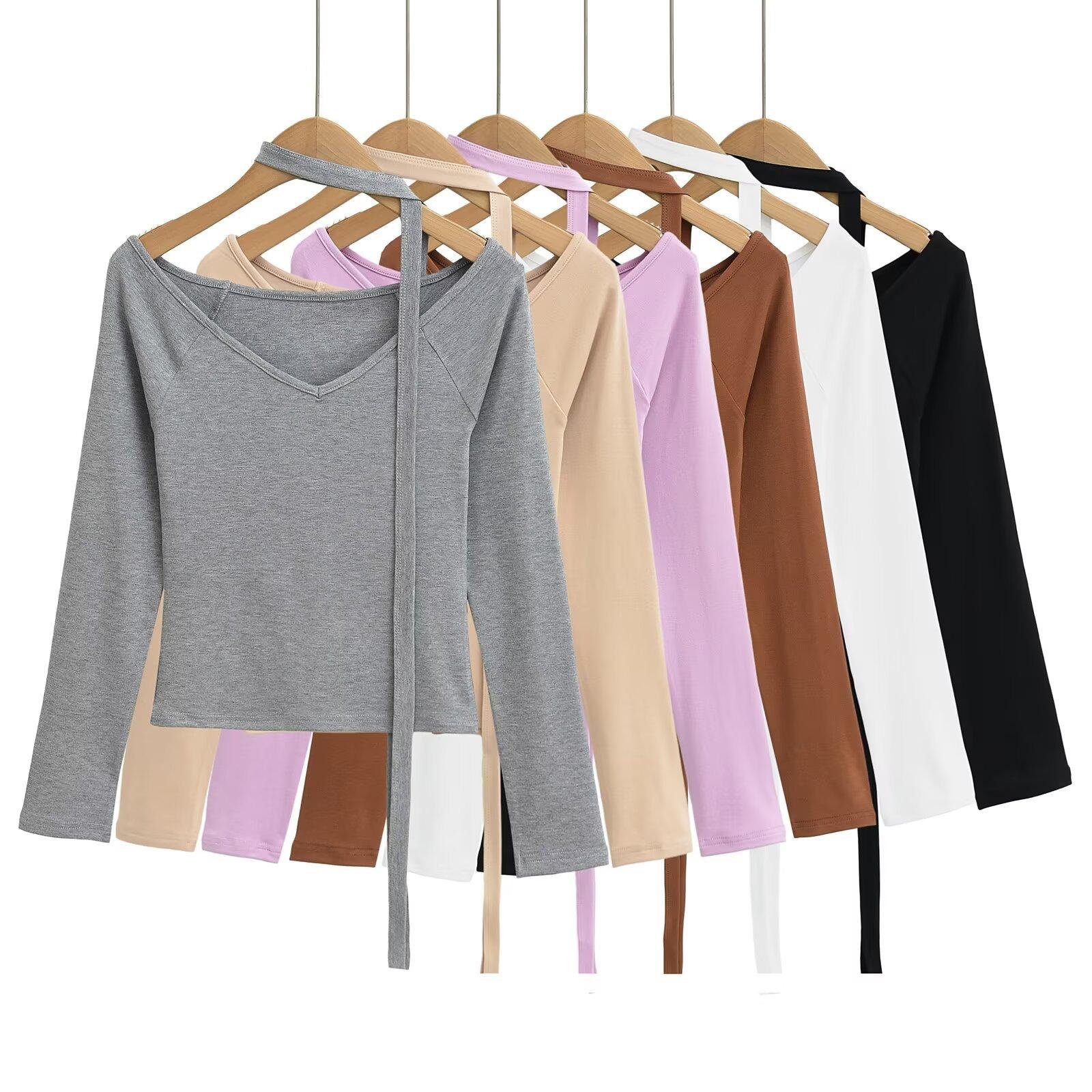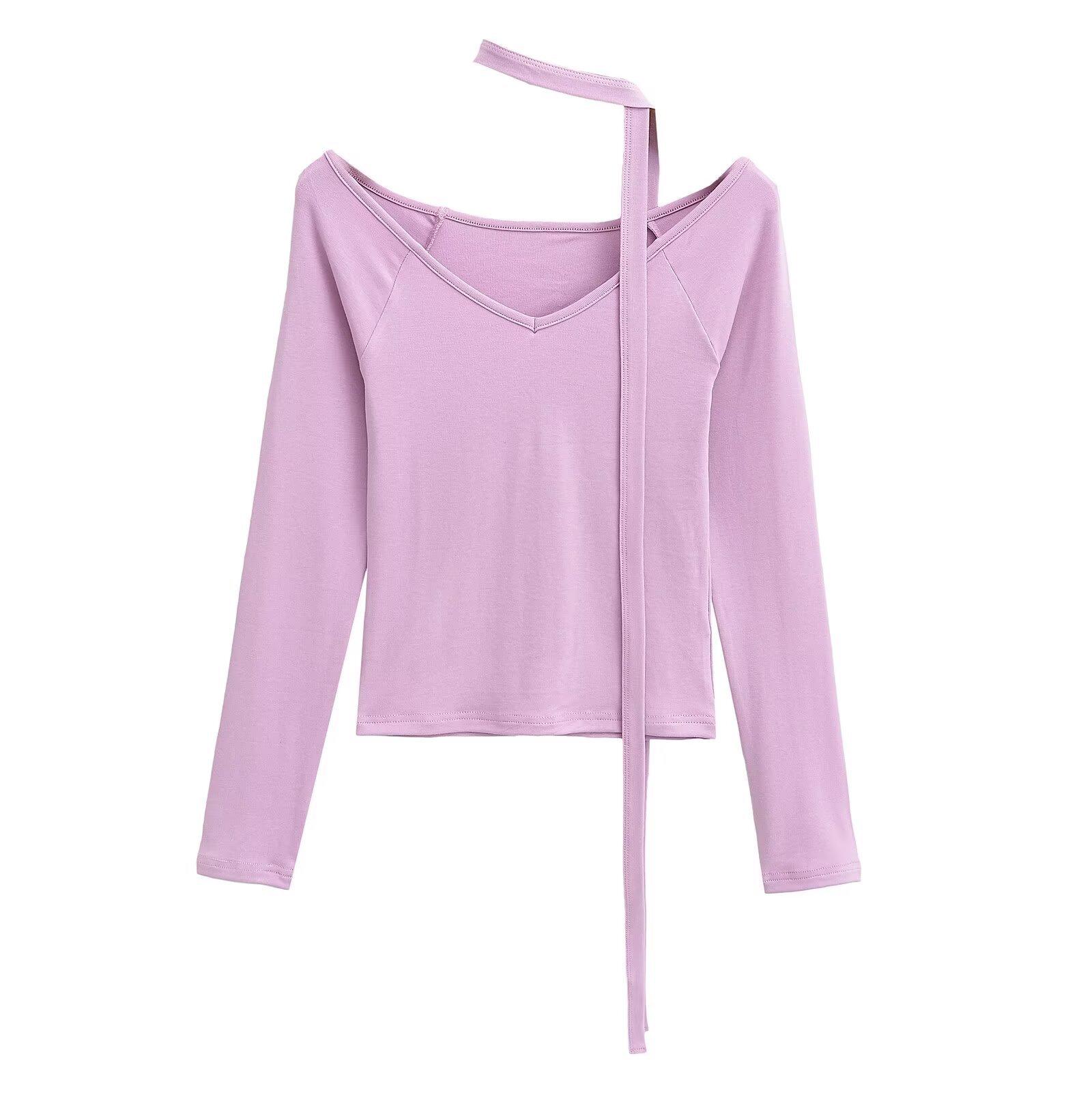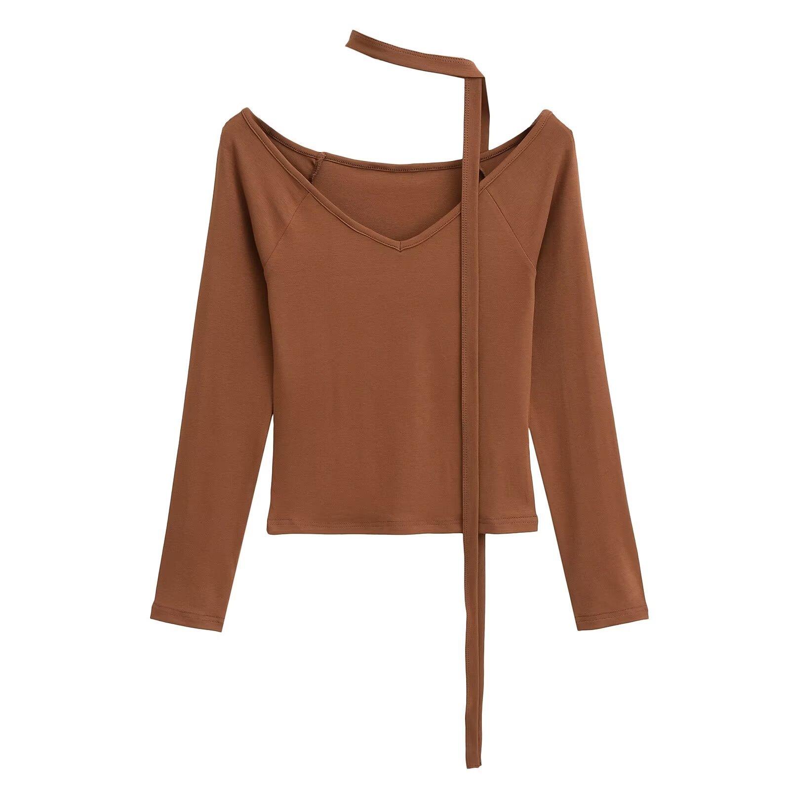 Primavera Europea y Americana Nueva Camiseta de Tirantes con Cuello en V y Manga Larga para Mujer, Estilo Francés Sexy Ajustada Corta Base con Hombro
