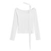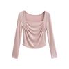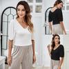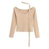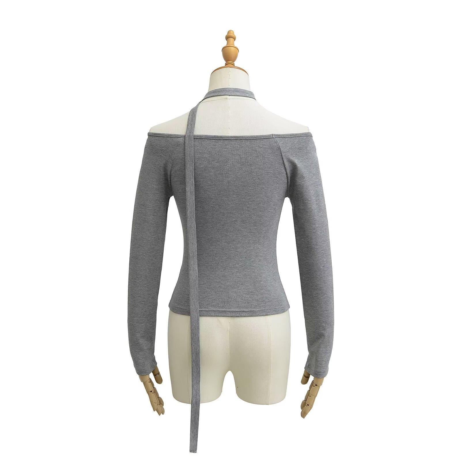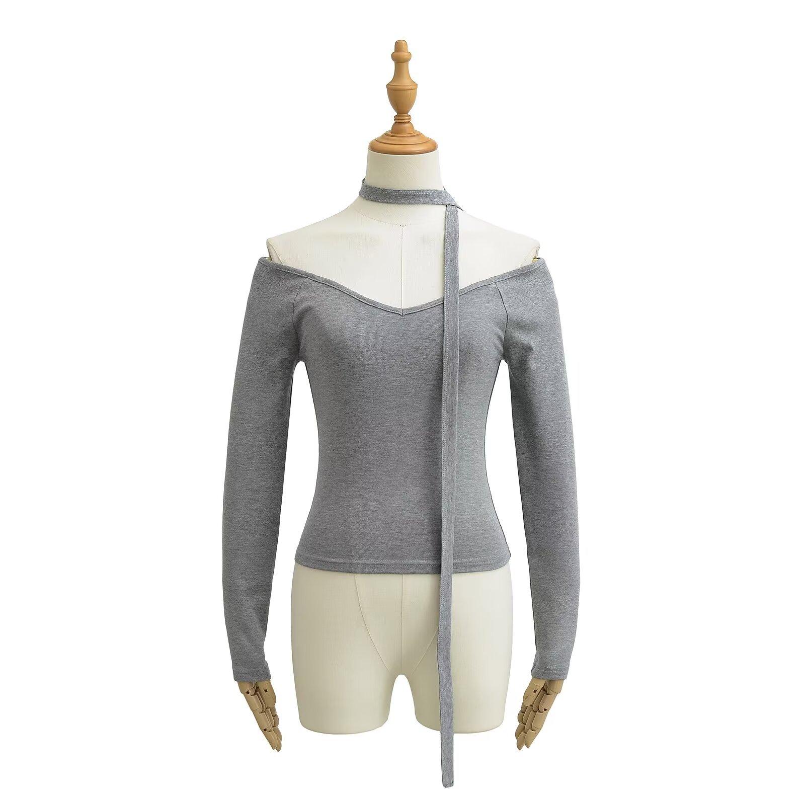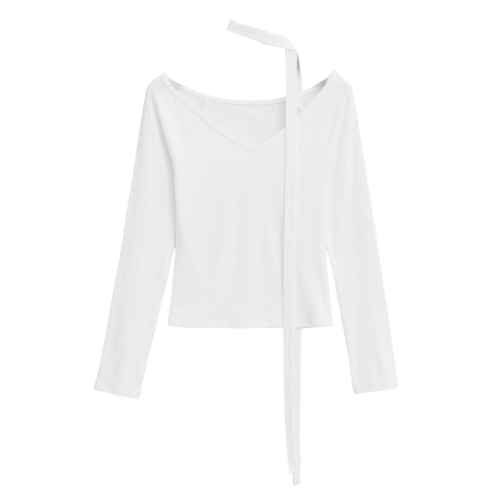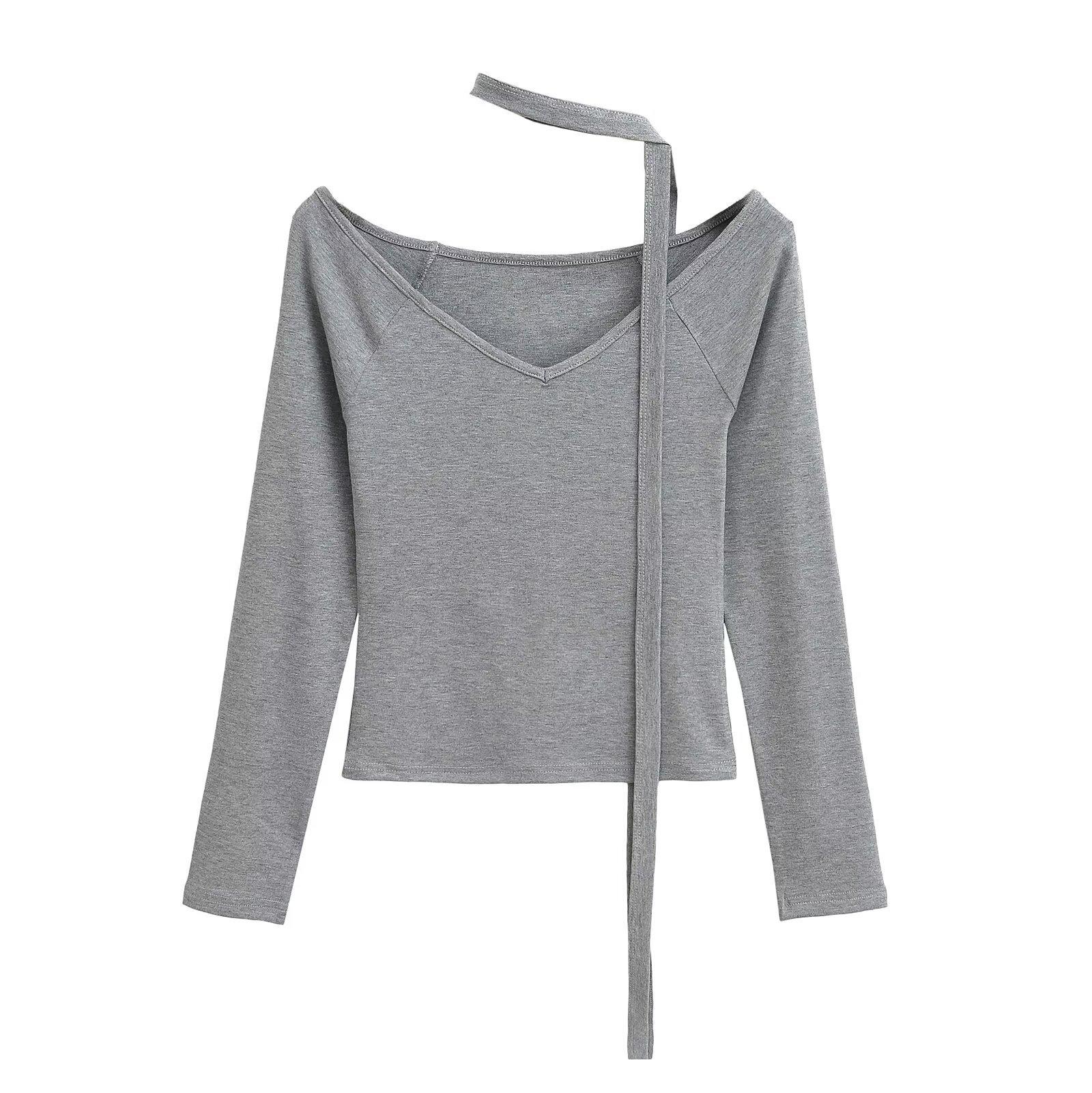 Primavera Europea y Americana Nueva Camiseta de Tirantes con Cuello en V y Manga Larga para Mujer, Estilo Francés Sexy Ajustada Corta Base con Hombro