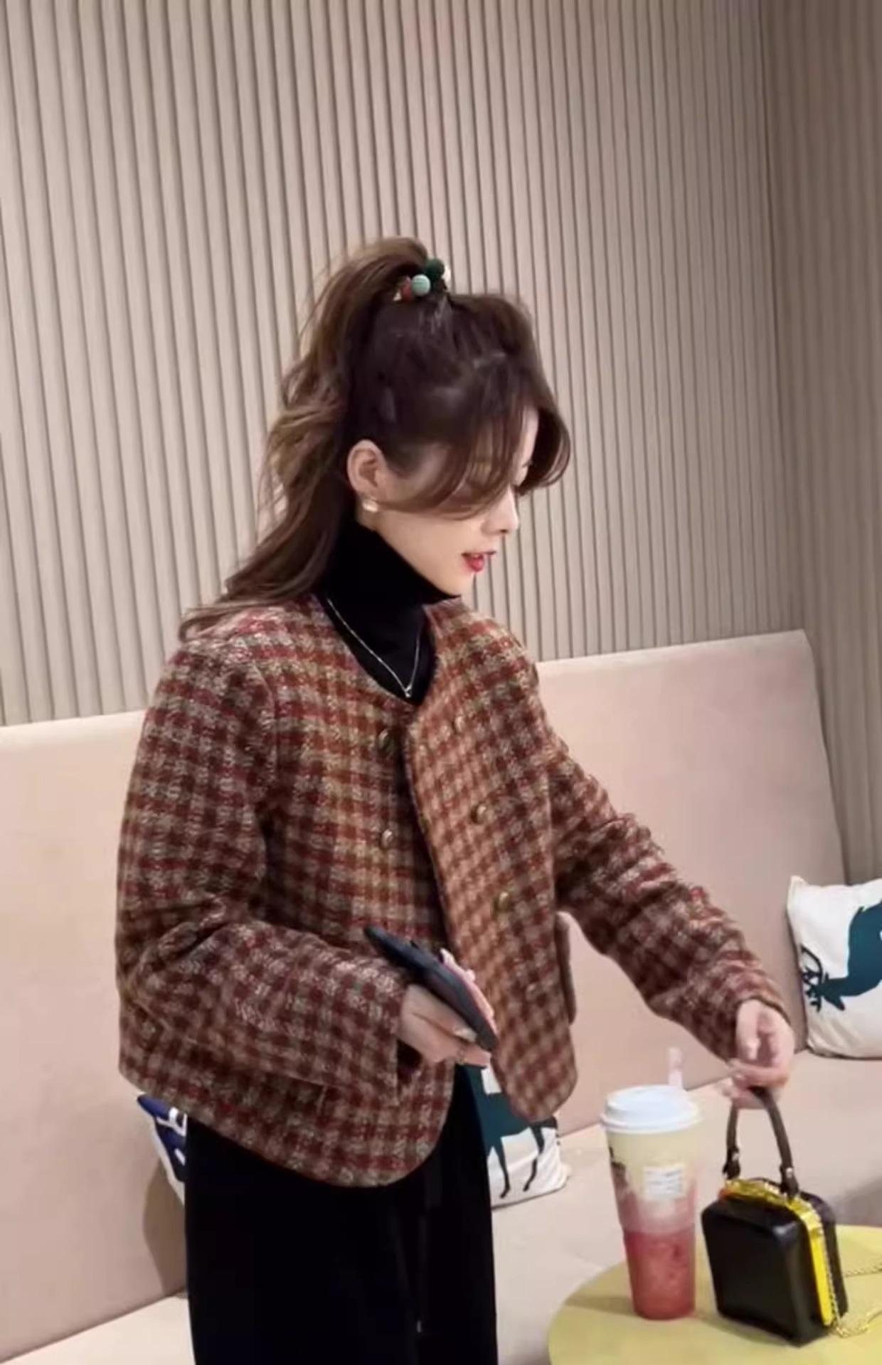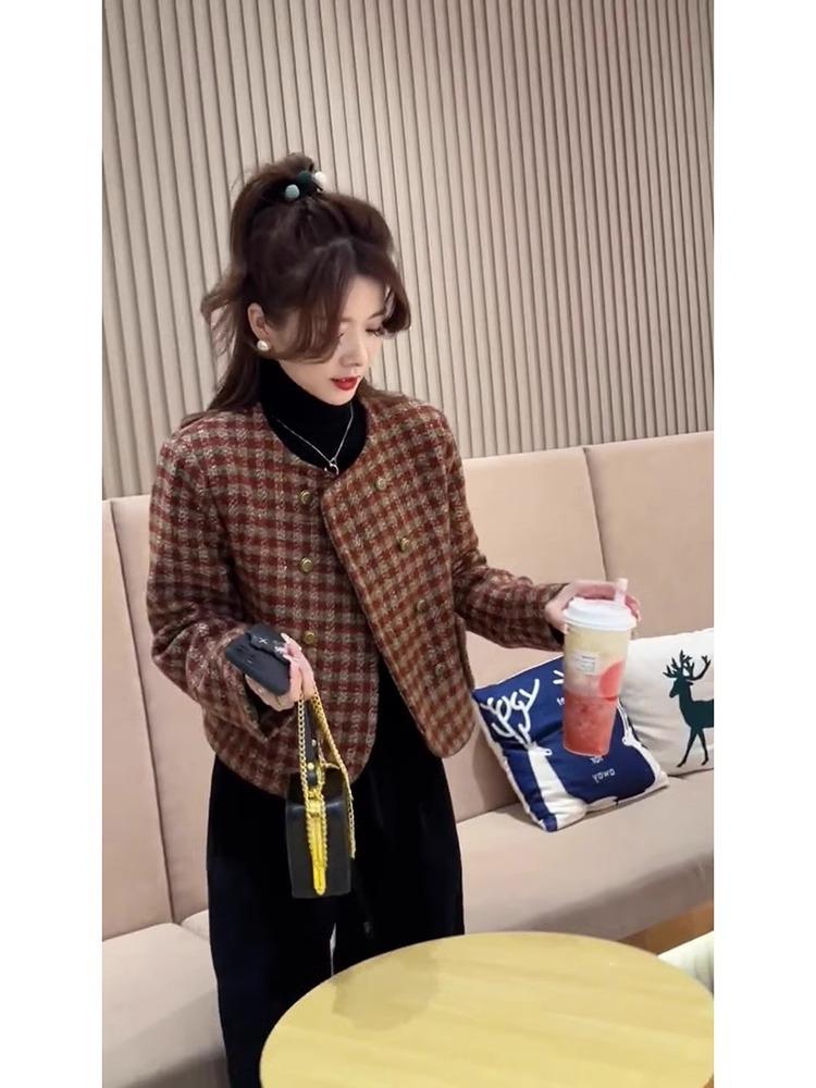 2025 Primavera y Otoño Nuevo Elegante Socialité de Alta Gama Engrosado Suave Perezoso Corto Estilo Chanel Chaqueta de Cuadros Rojos
