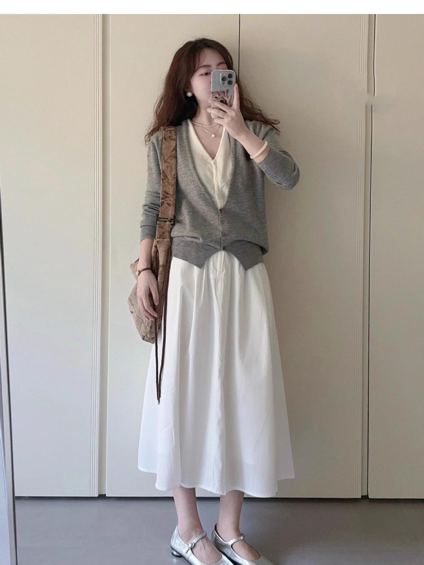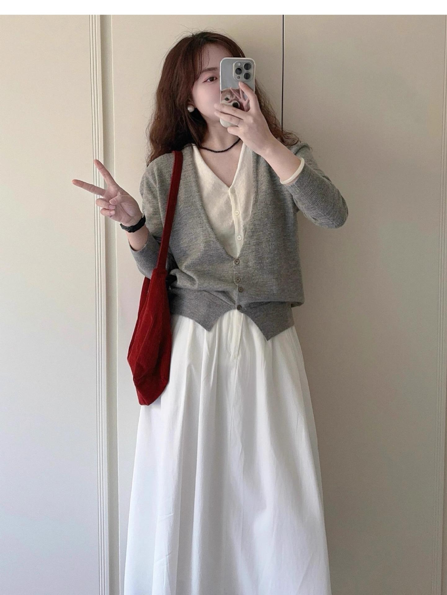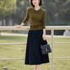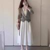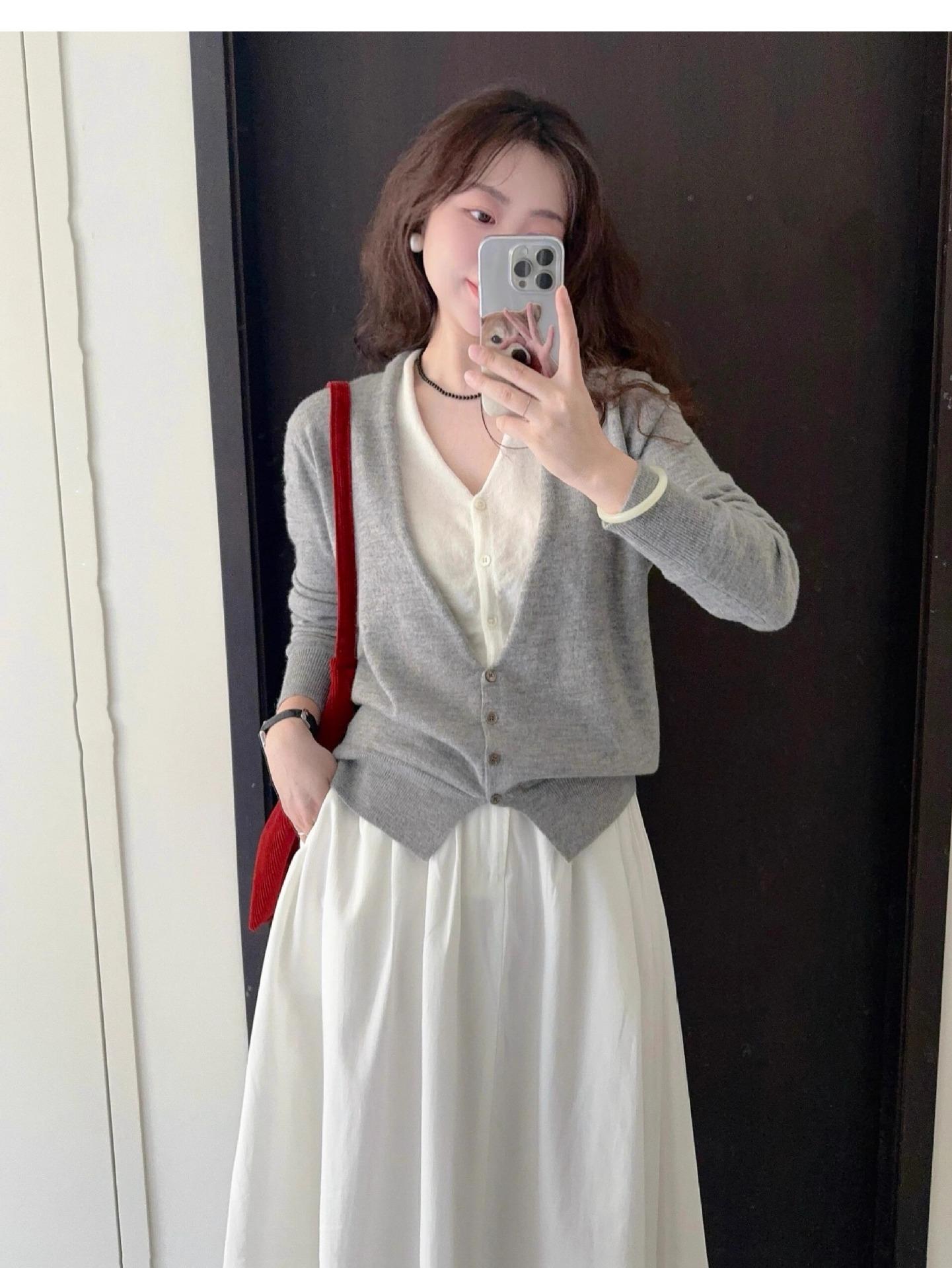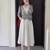 Celebridad de internet primavera 2024 falso conjunto de dos piezas con costuras de color en contraste suéter de cuello en V para mujer + falda conjunto casual de dos piezas para mujer