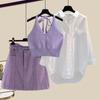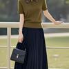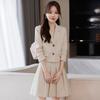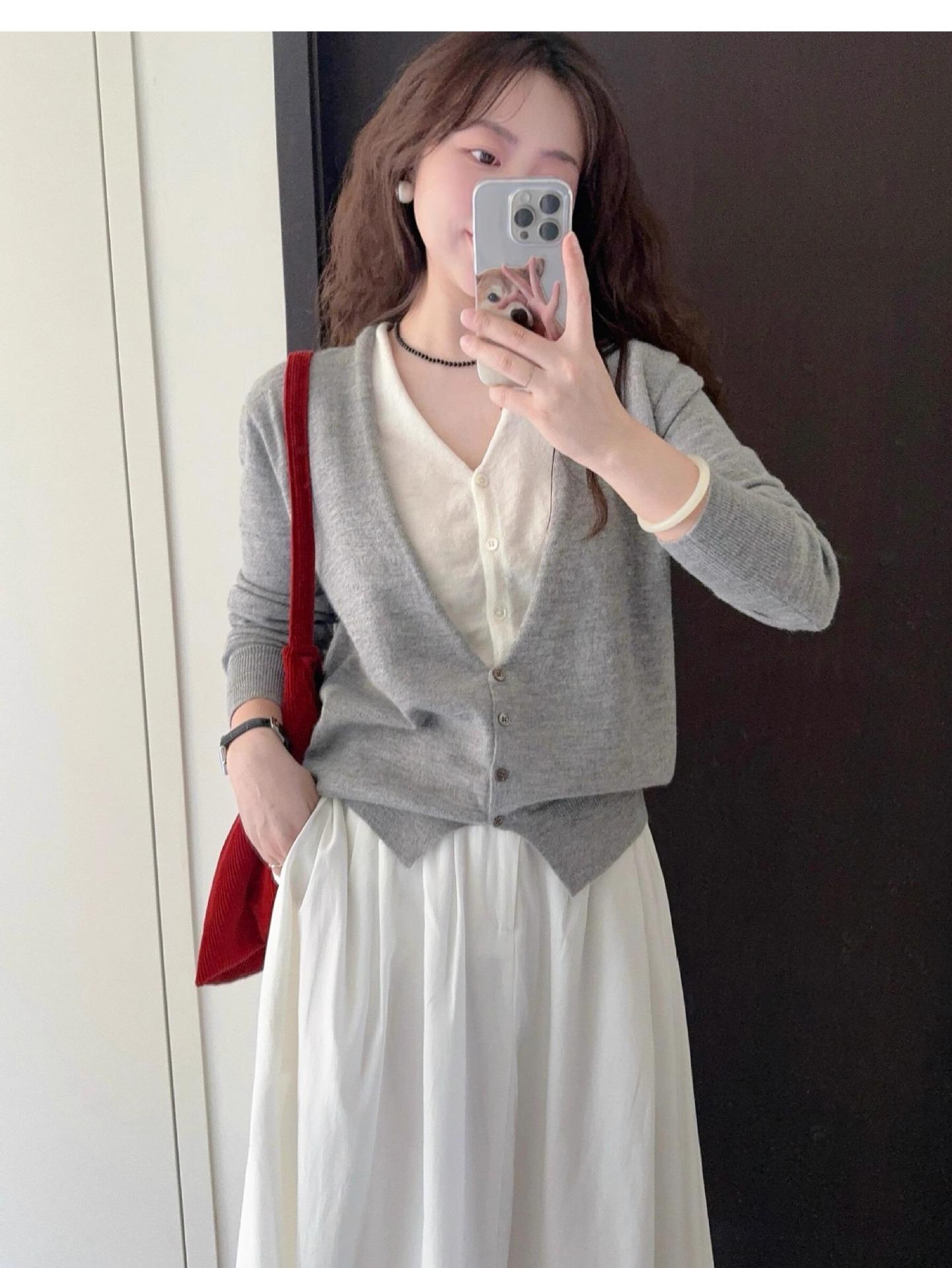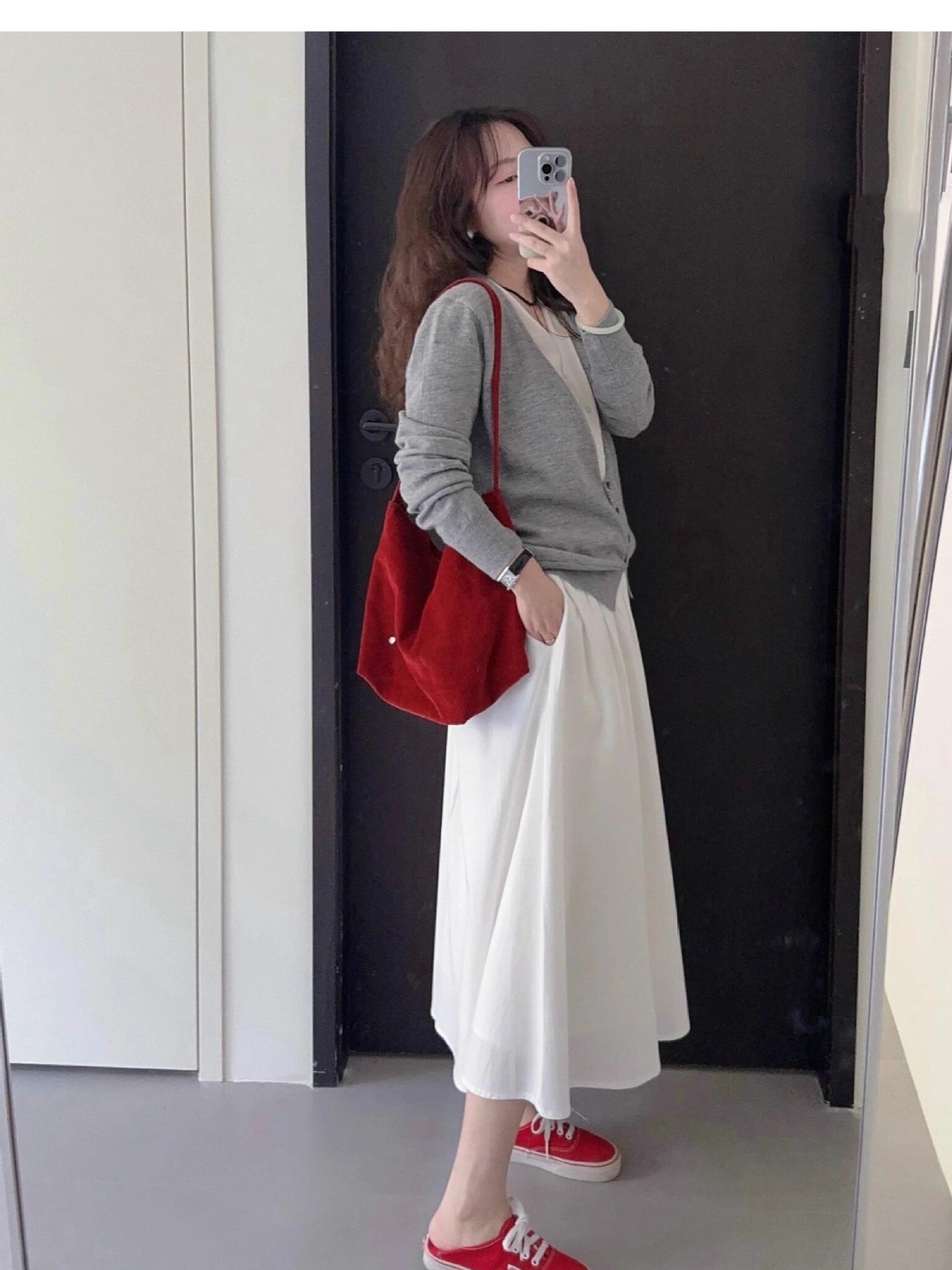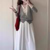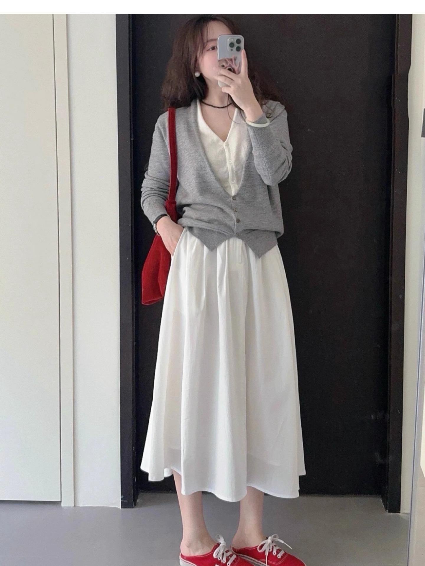 Celebridad de internet primavera 2024 falso conjunto de dos piezas con costuras de color en contraste suéter de cuello en V para mujer + falda conjunto casual de dos piezas para mujer