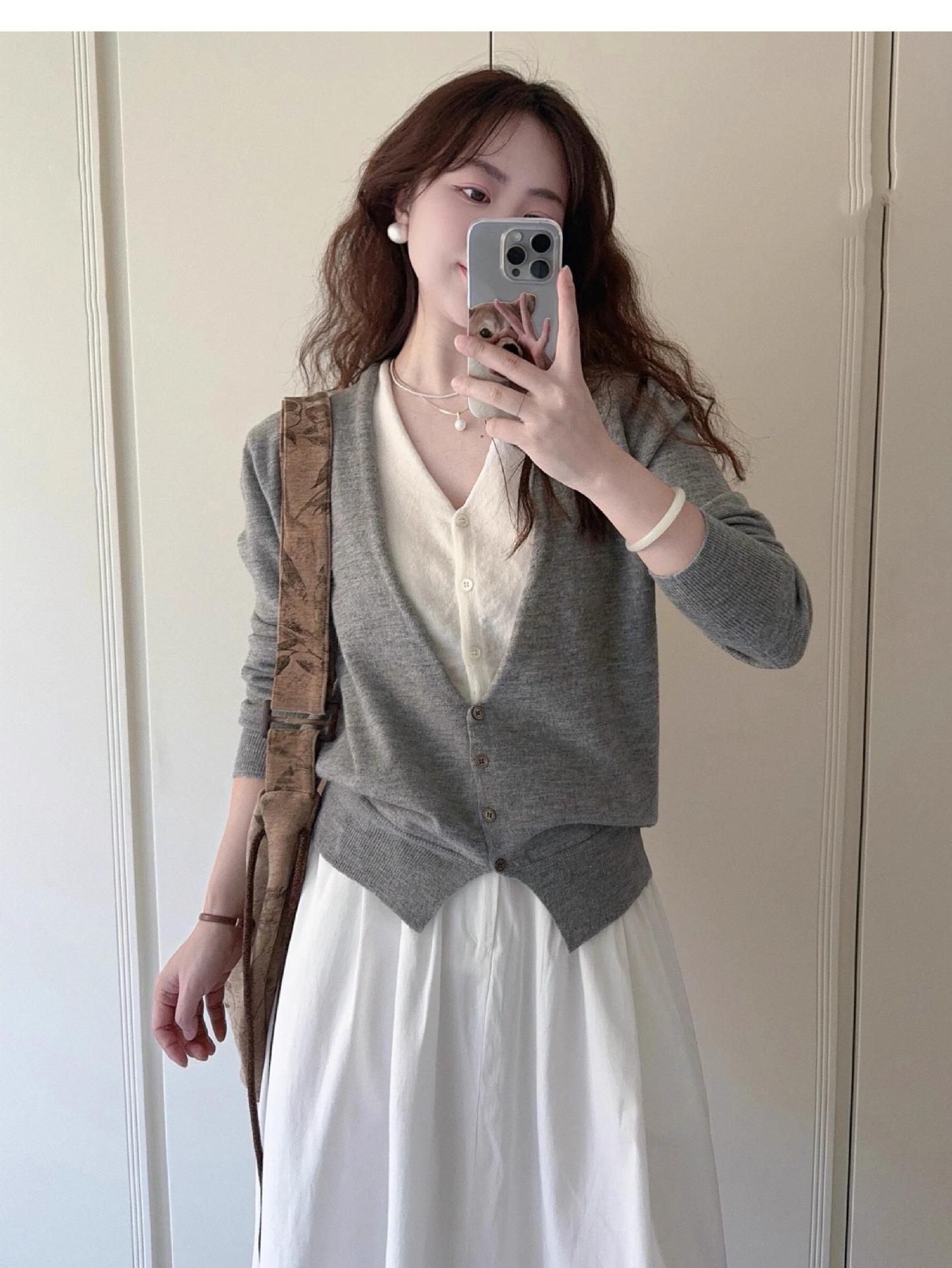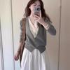 2024 nuevo suéter de punto falso de dos piezas con empalme de color en contraste, diseño femenino con sentido, estilo simple, temperamento, top moderno, ins