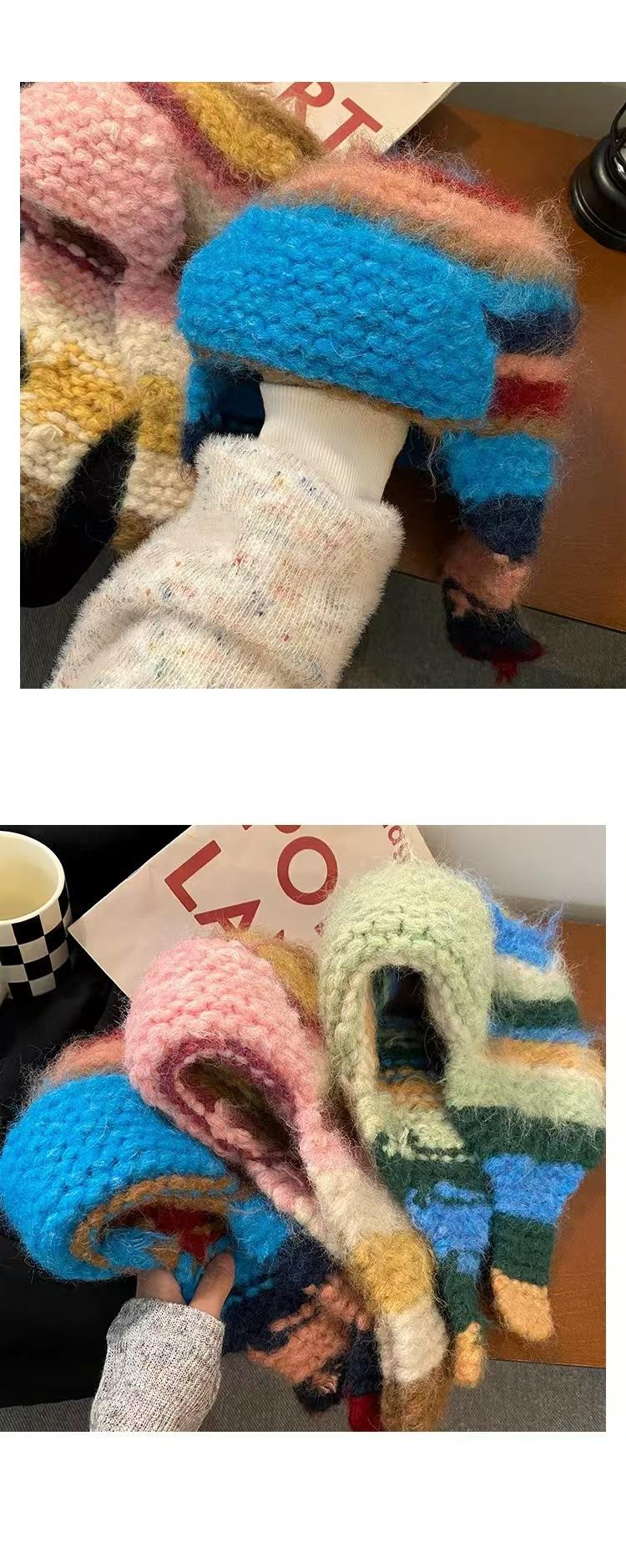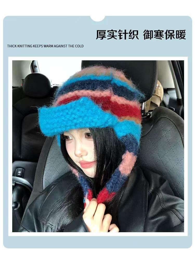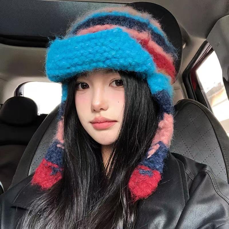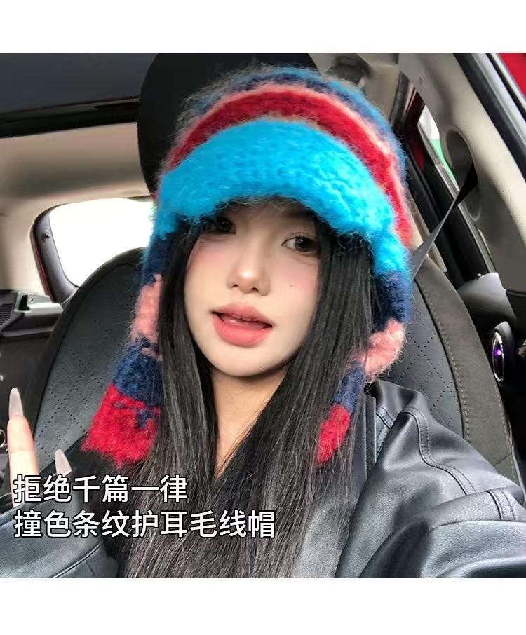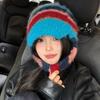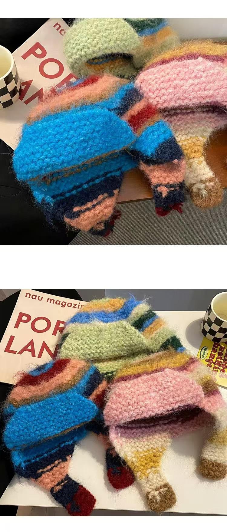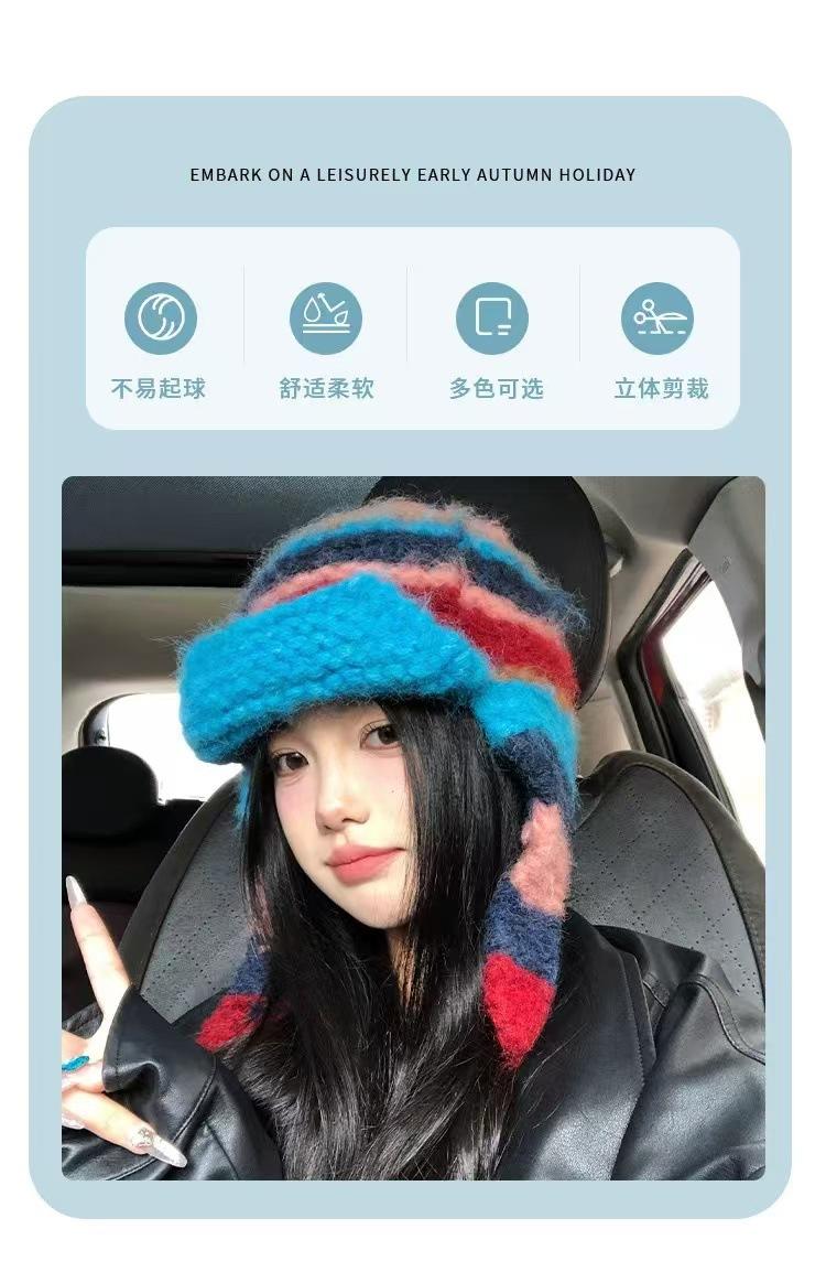 Gorro de punto de mohair con rayas retro para mujer, gorro de lana cálido para otoño e invierno 2024, gorro Lei Feng volador