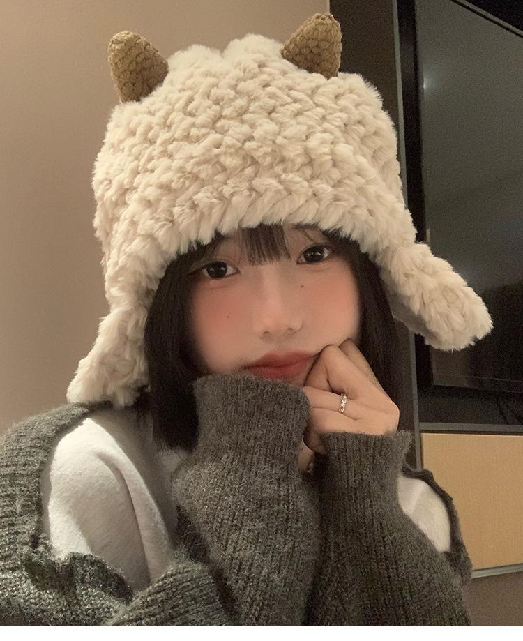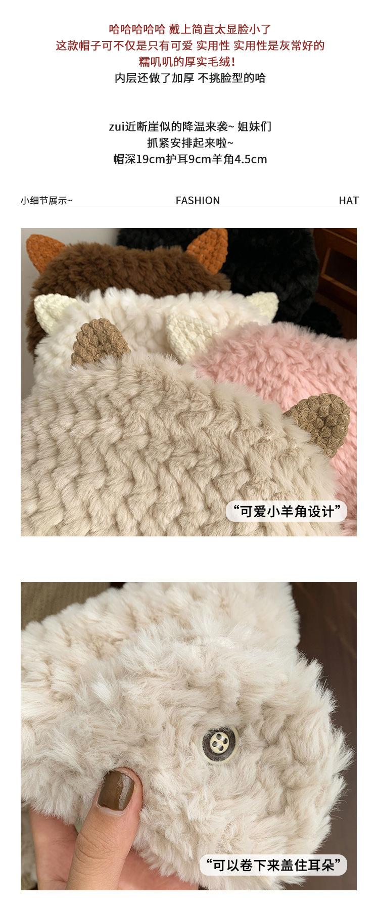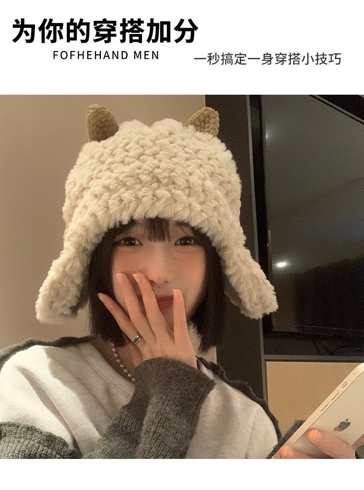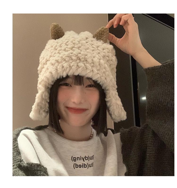 Gorro de cordero para mujer, estilo coreano, otoño e invierno, bonito gorro de felpa Lei Feng para el rostro, pequeño, cálido y grueso, con protección para las orejas, para cabeza grande.