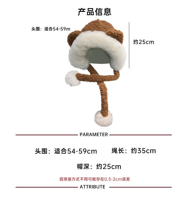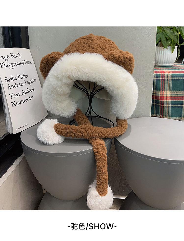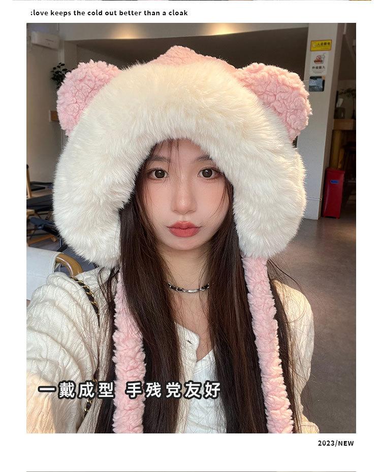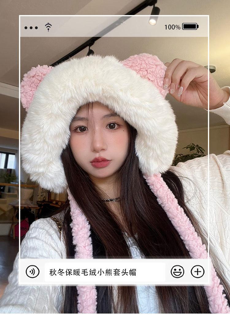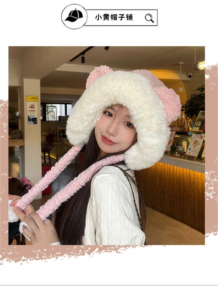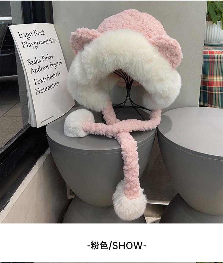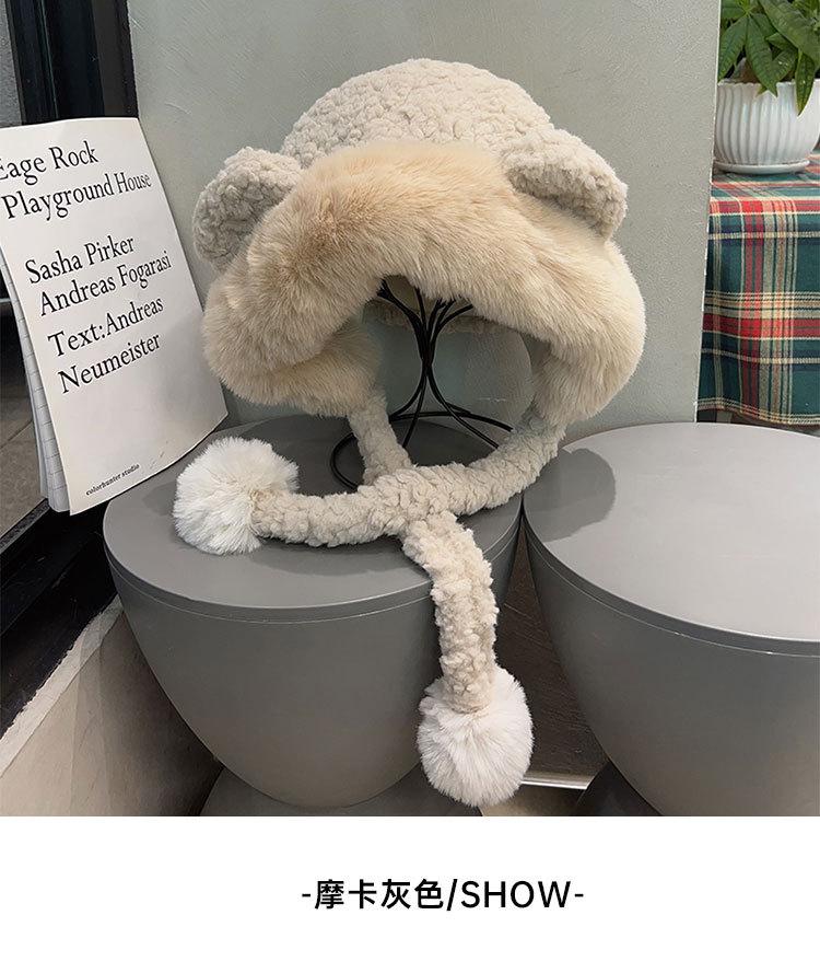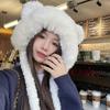 Lindo gorro de felpa de oso para mujer, invierno, forrado de polar, grueso y cálido, gorro Lei Feng con protección para los oídos a prueba de viento, gorro para la cabeza para estudiante