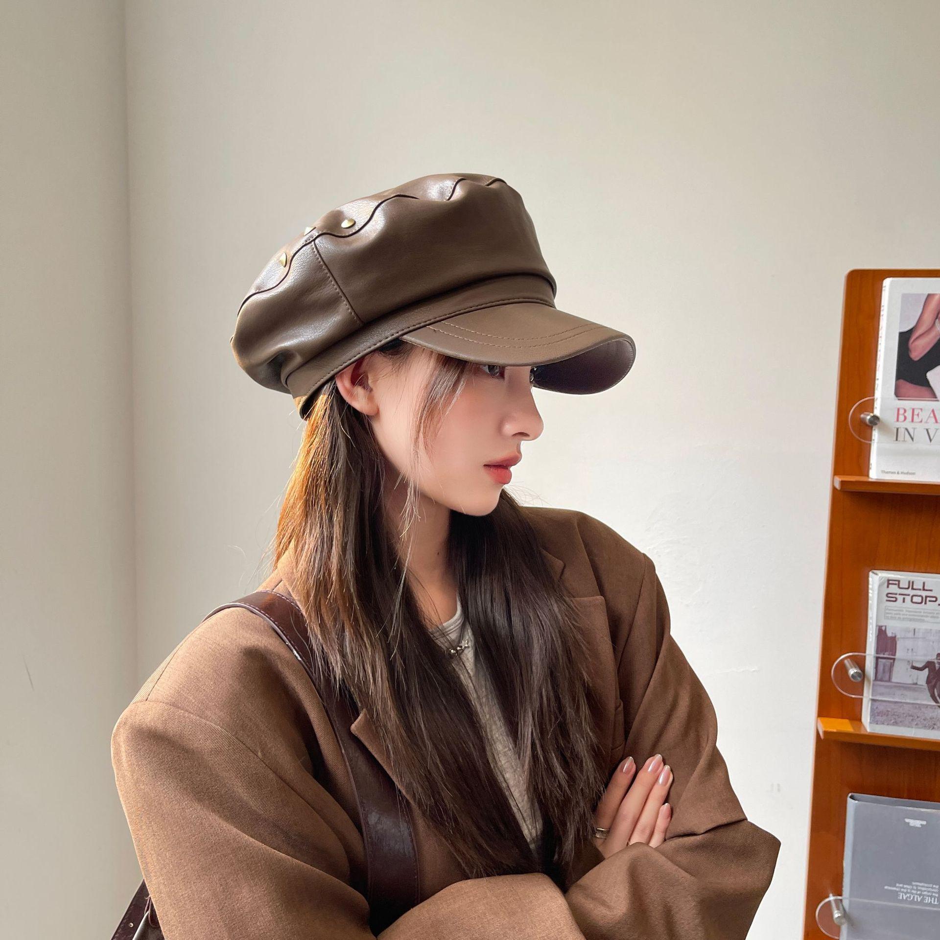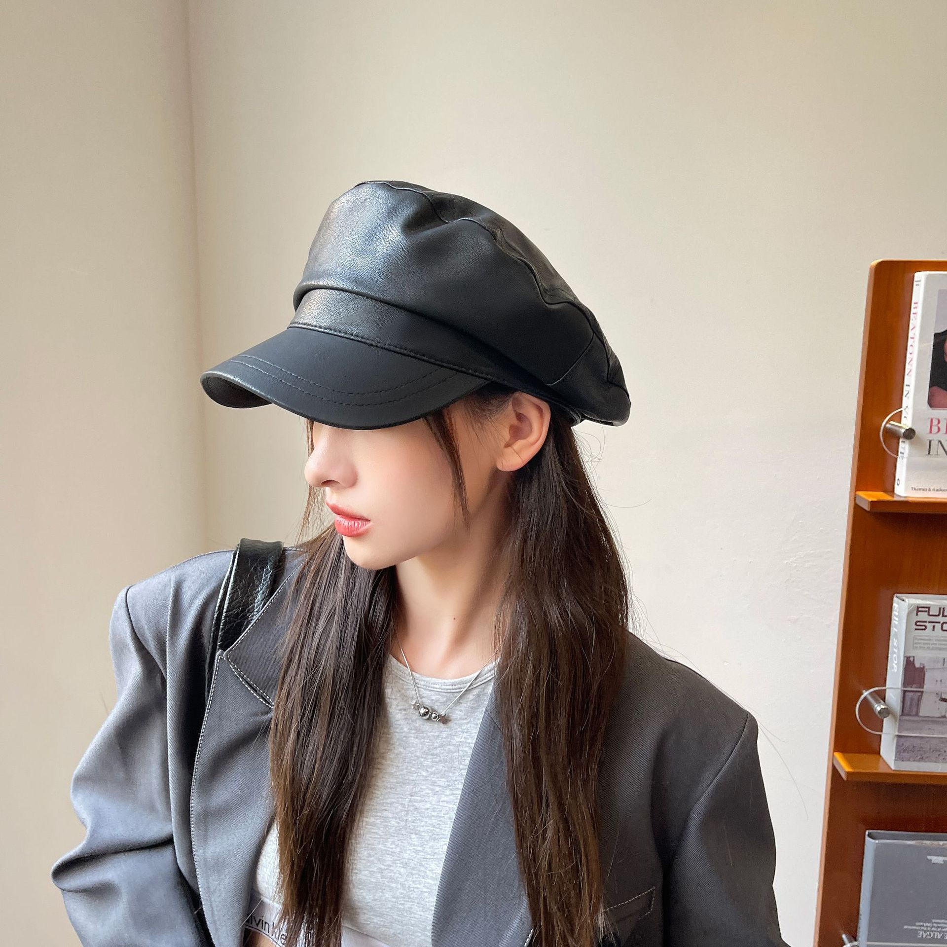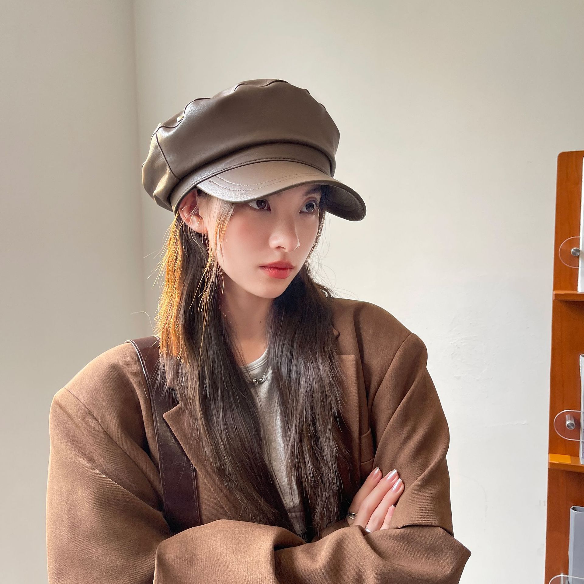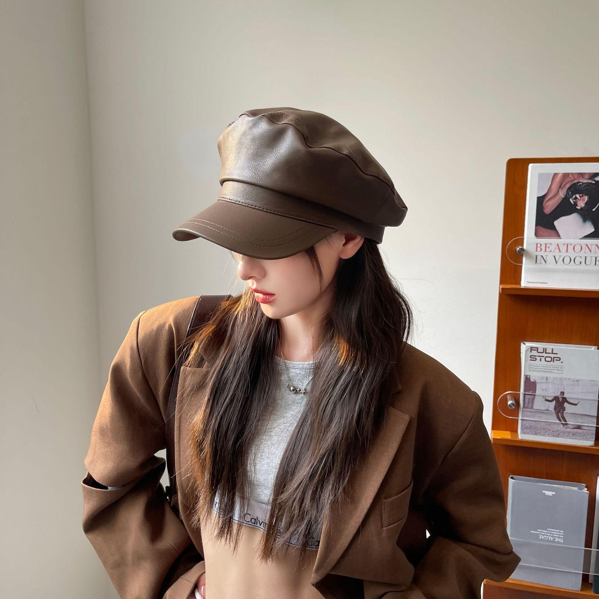 Boina de cuero sintético retro de otoño e invierno para mujer, nueva gorra con estampado coreano, gorra frontal, gorra octogonal para todo tipo de combinaciones, gorra de cuero