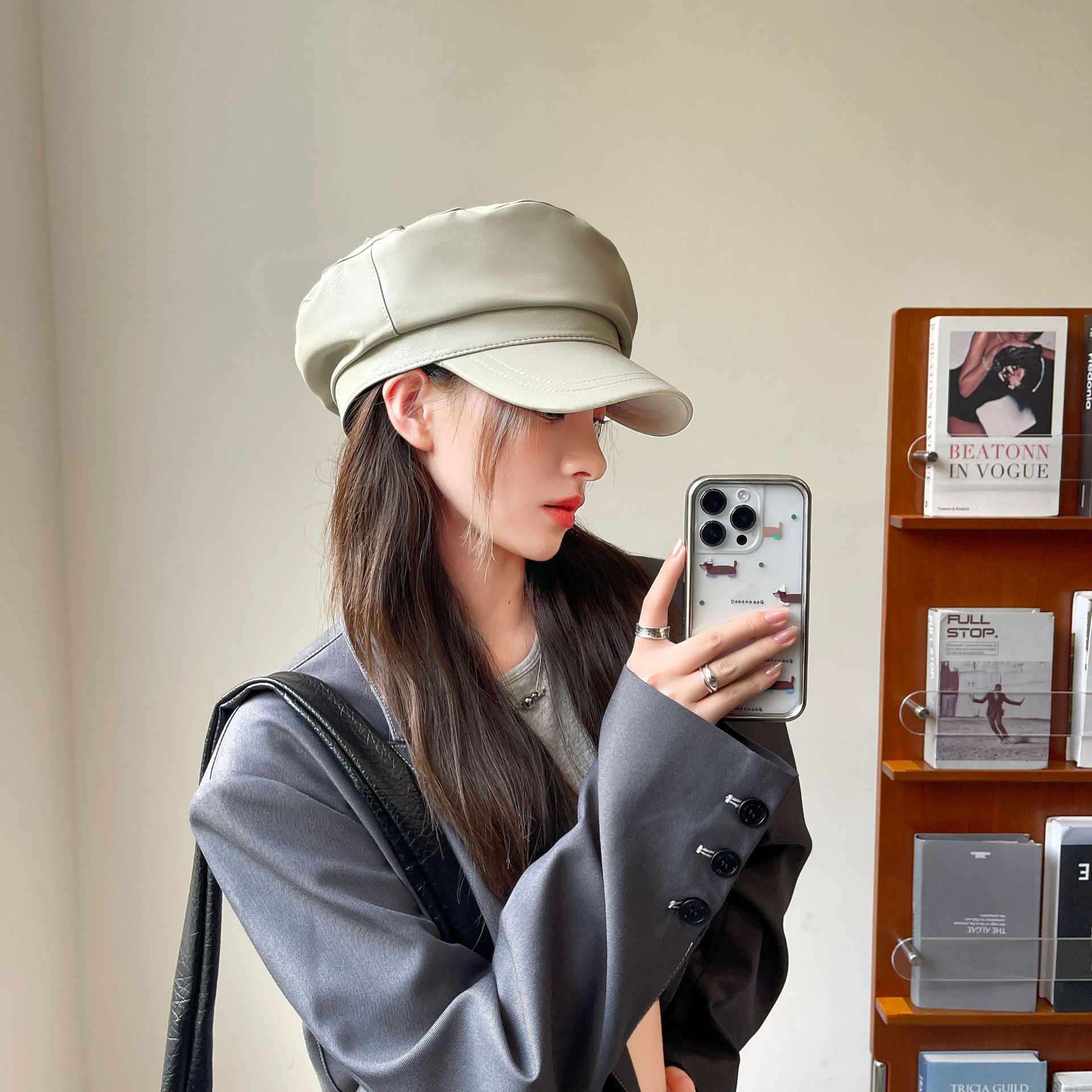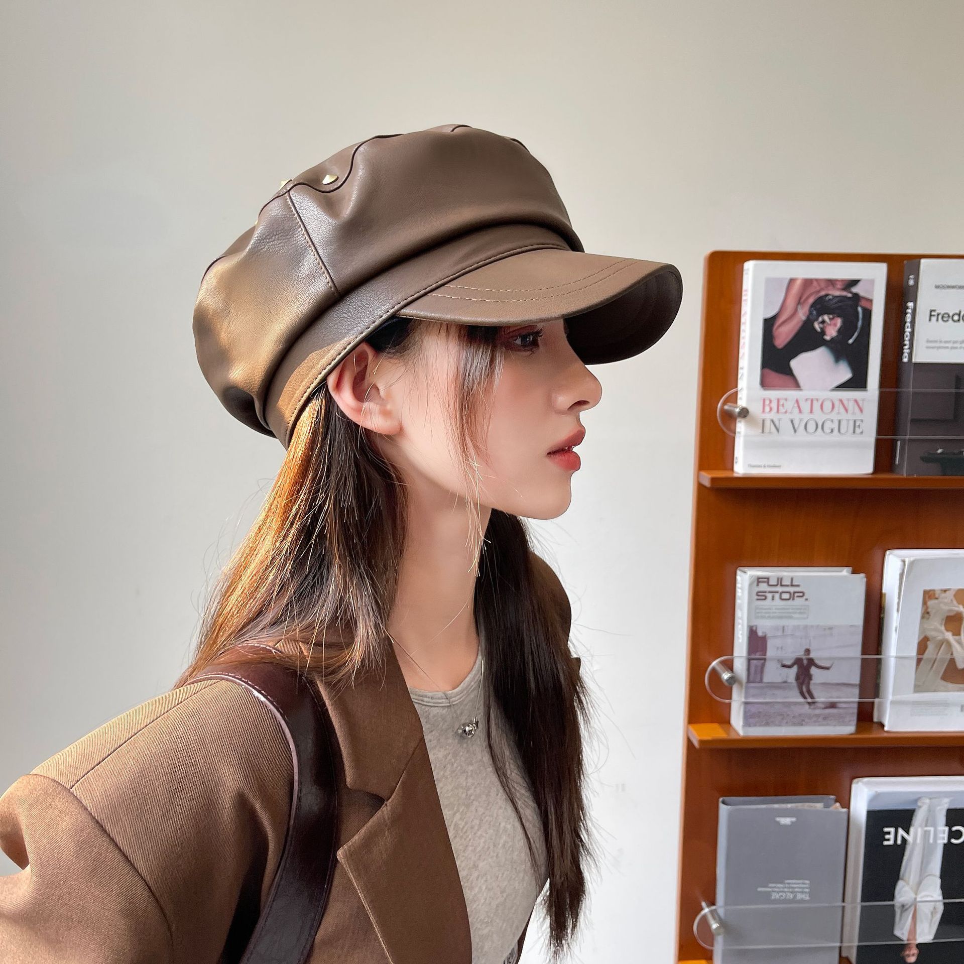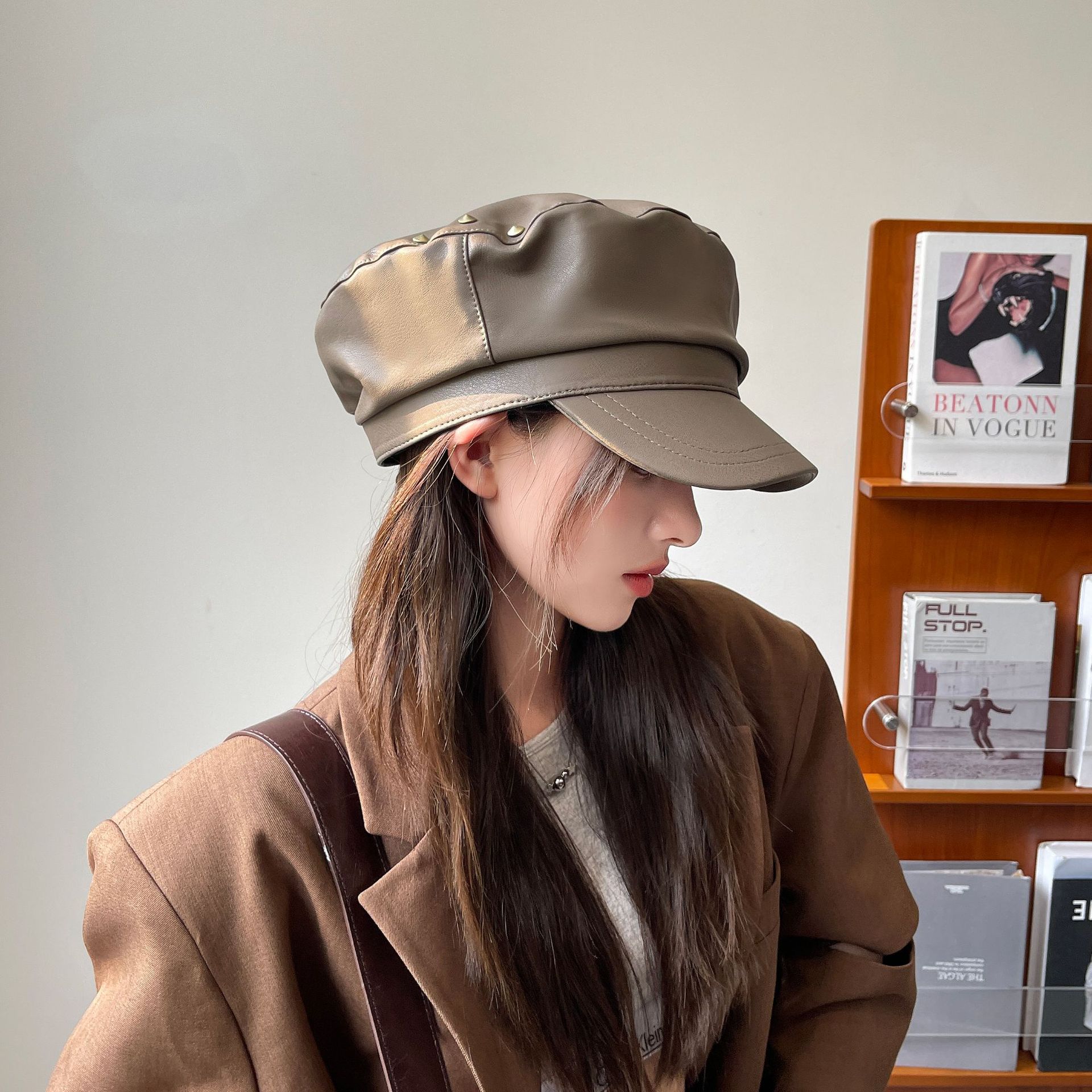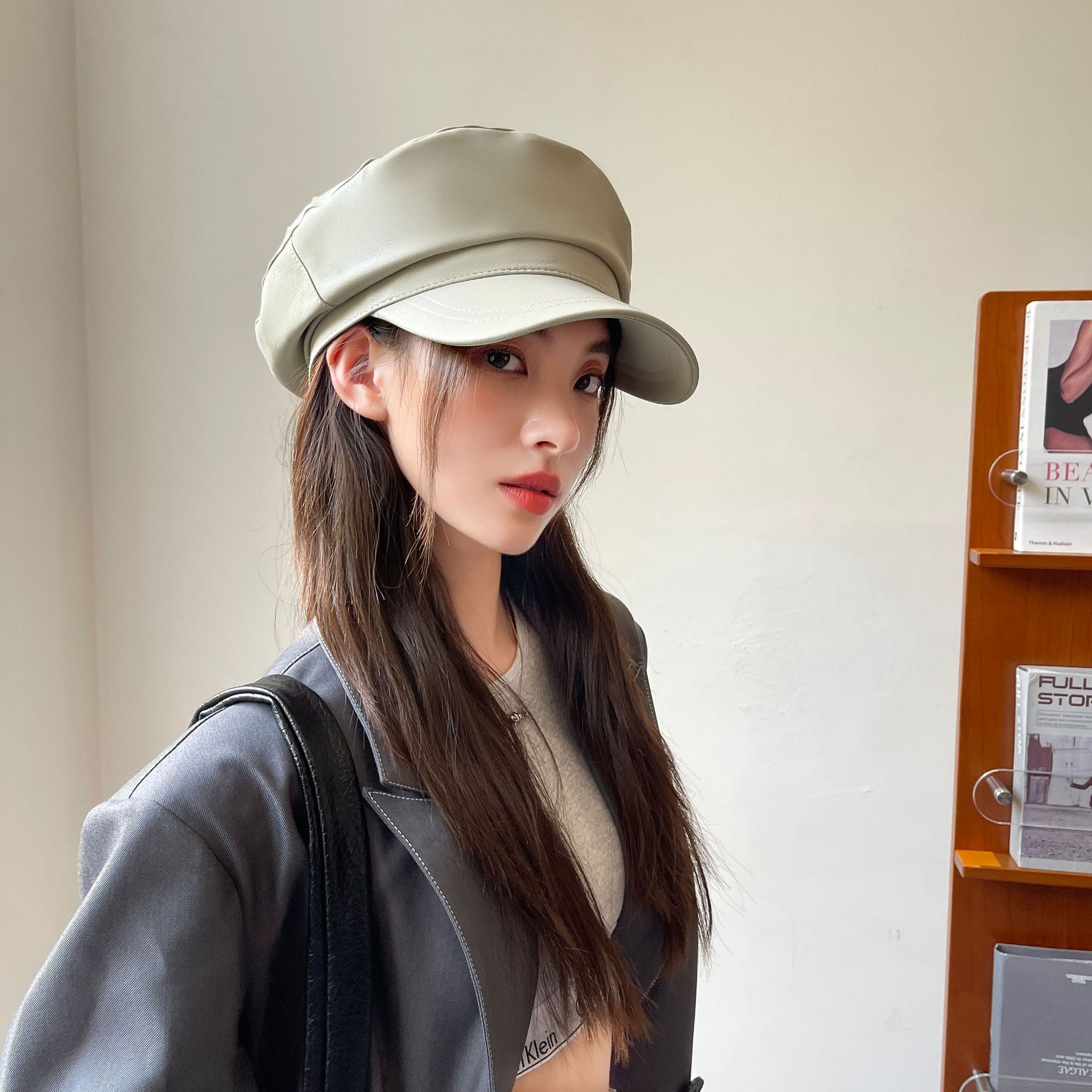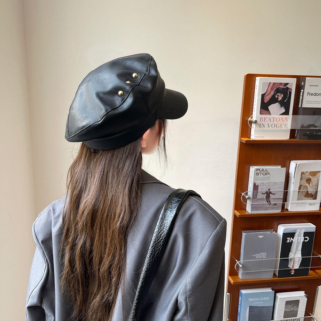 Boina de cuero sintético retro de otoño e invierno para mujer, nueva gorra con estampado coreano, gorra frontal, gorra octogonal para todo tipo de combinaciones, gorra de cuero