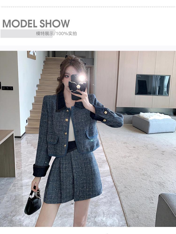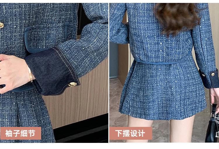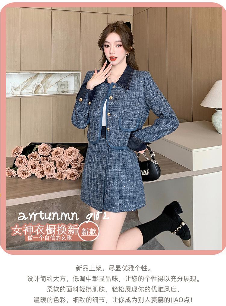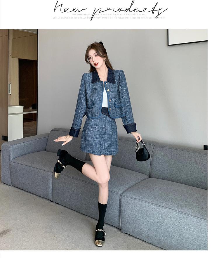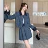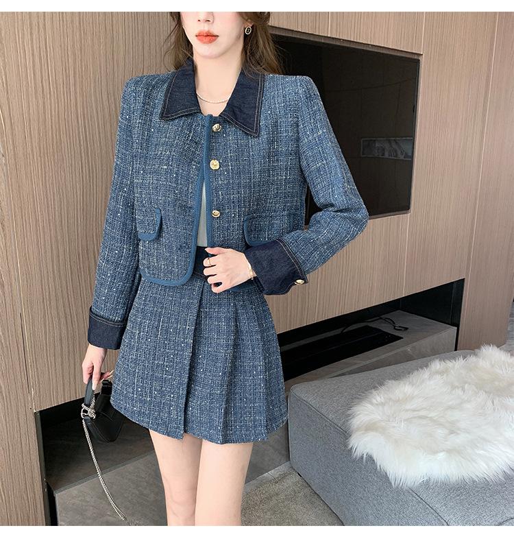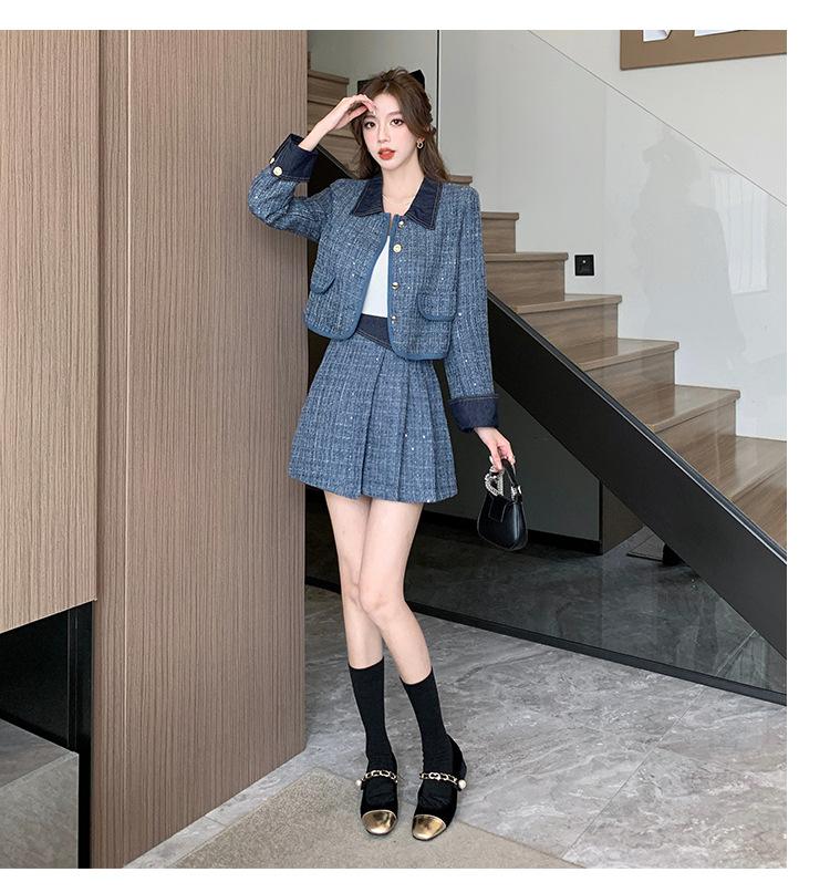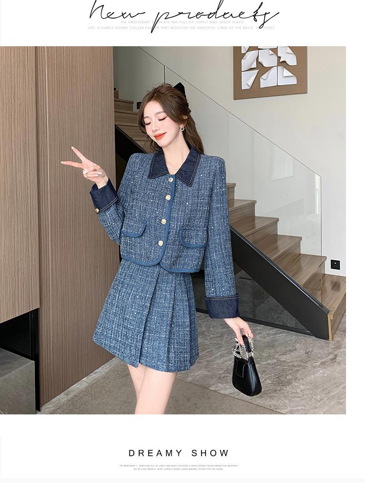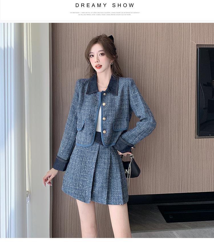 Conjunto de dos piezas con falda y top de tweed, estilo francés azul pequeño y fragante, de otoño, de tiro real